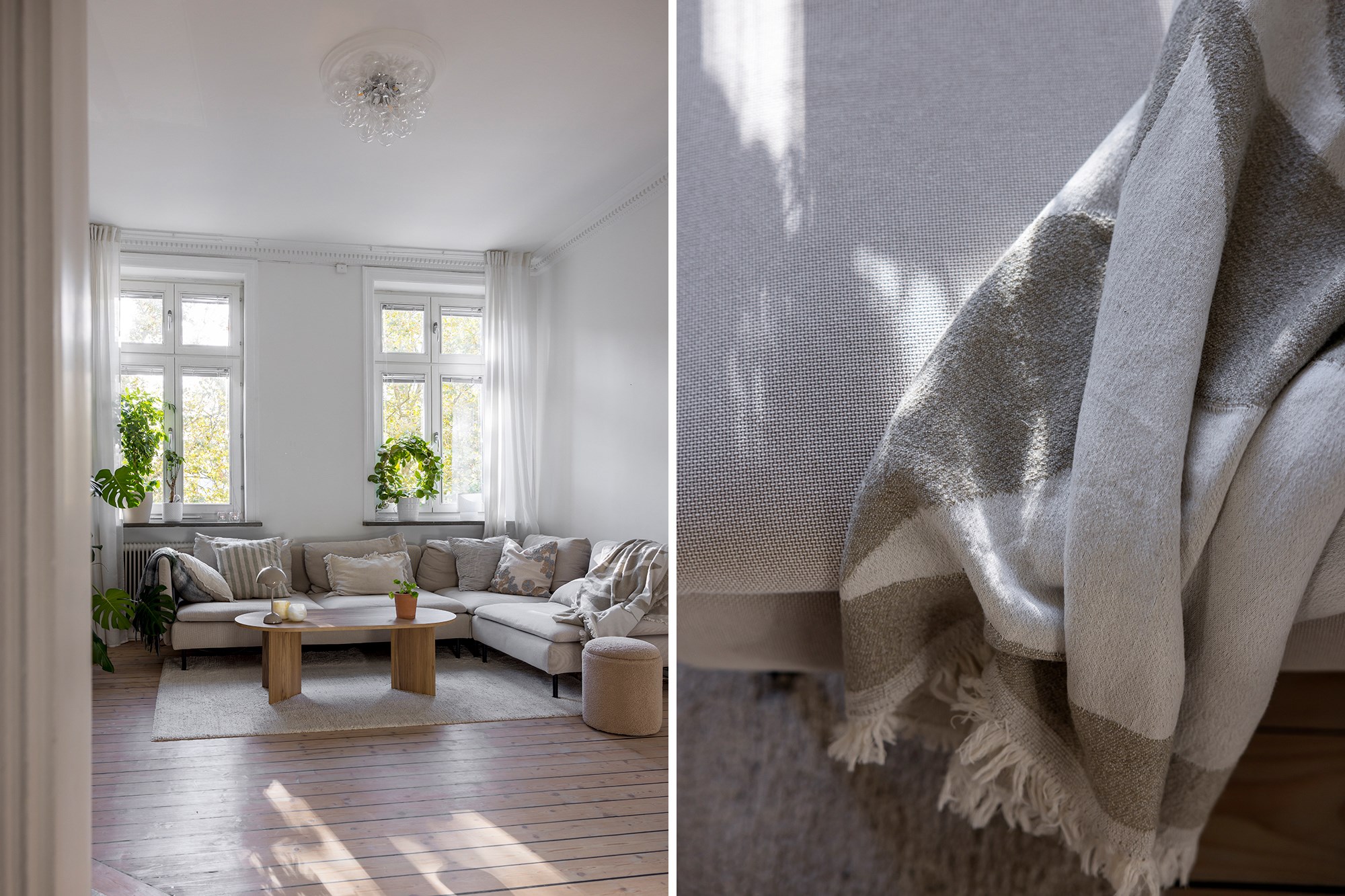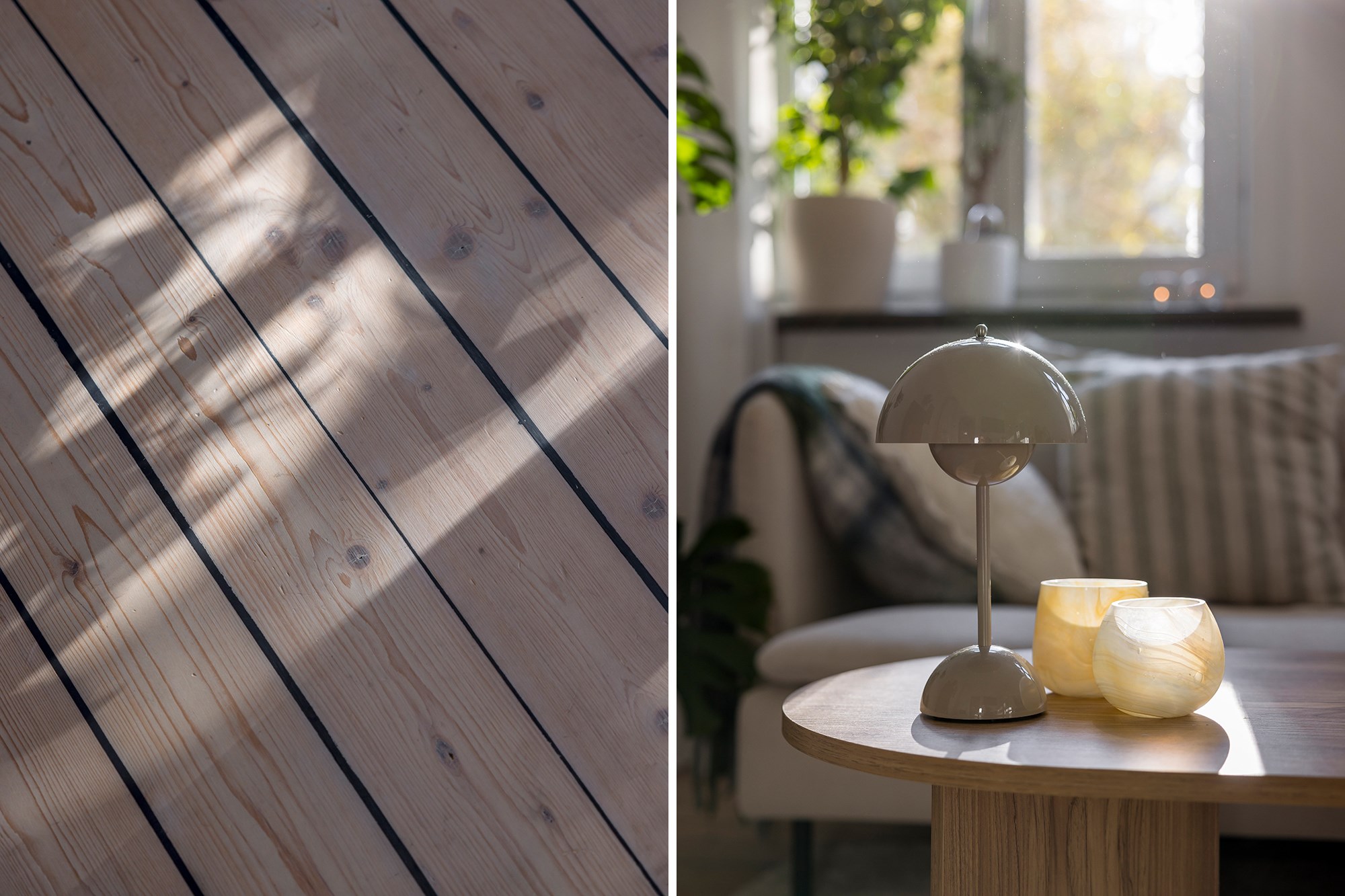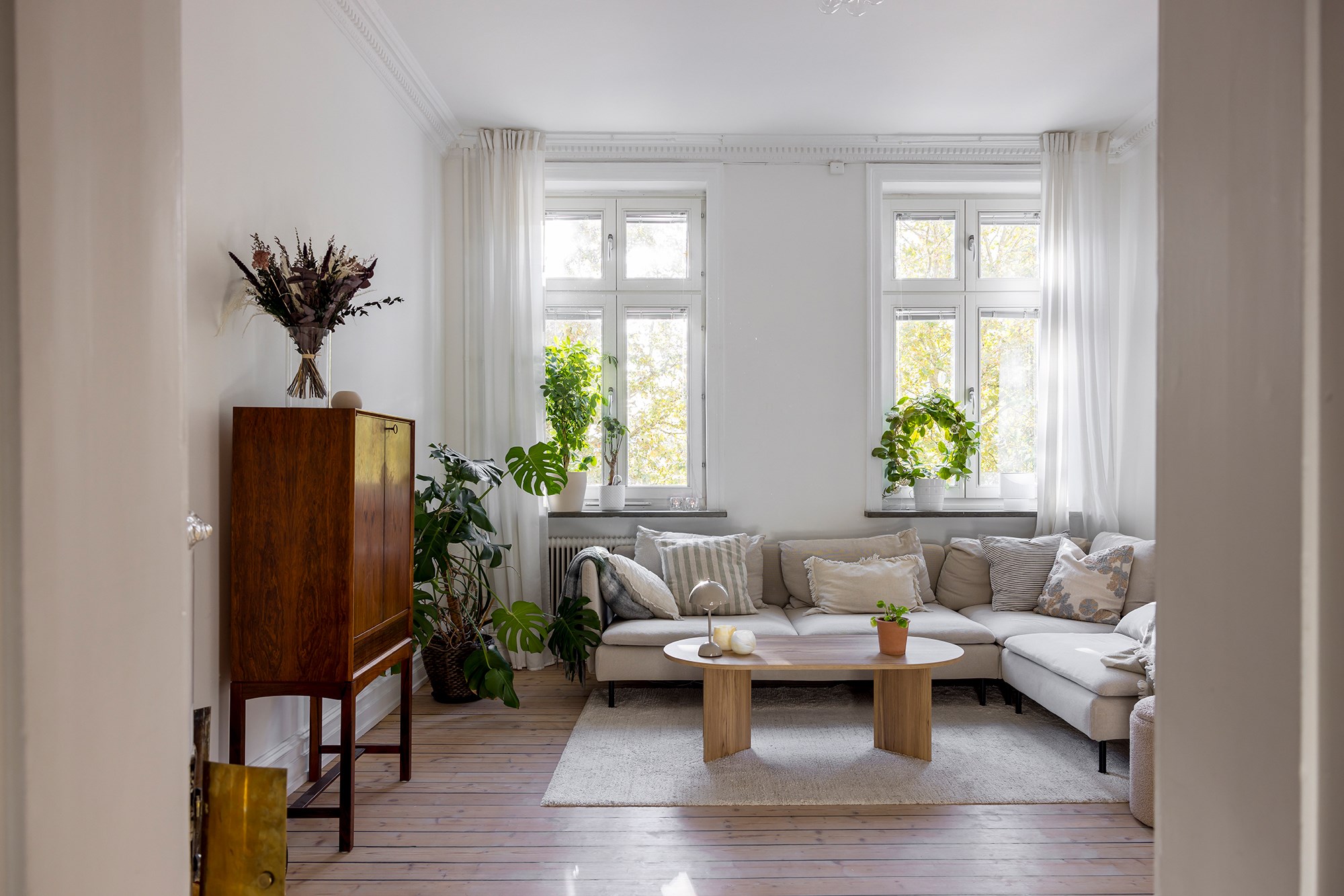 Brädgolv och ljusa väggar. Stuckaturer och högt i tak. Socialt och trivsamt rum med fungerande kakelugn och härligt ljusinsläpp. Ligger i fil med köket.