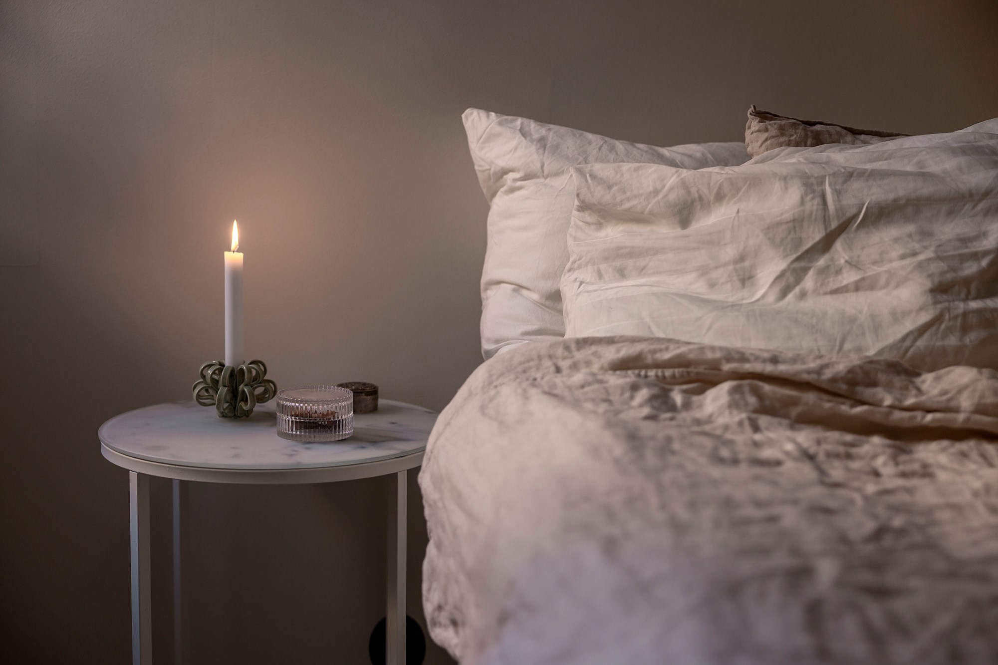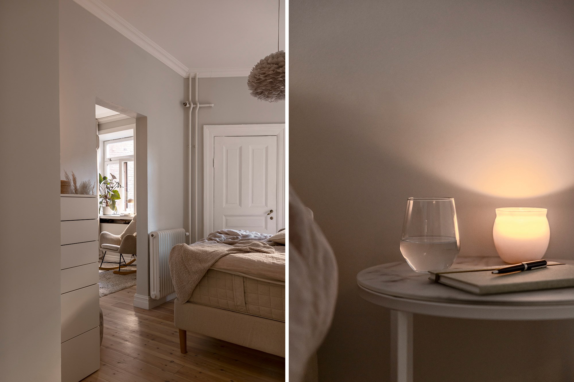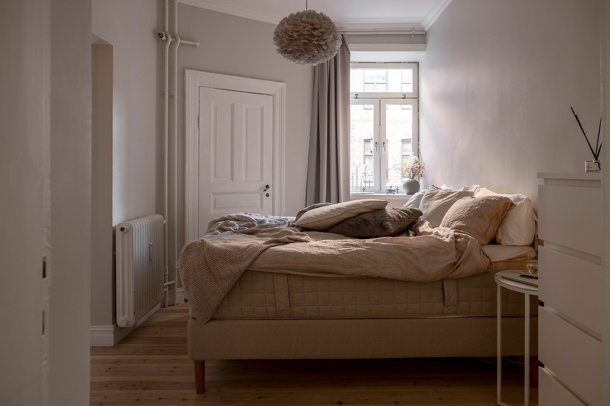 Master bedroom med plats för dubbelsäng och garderober. Trägolv, ljusa väggar och fönster in mot den lugna innergården.