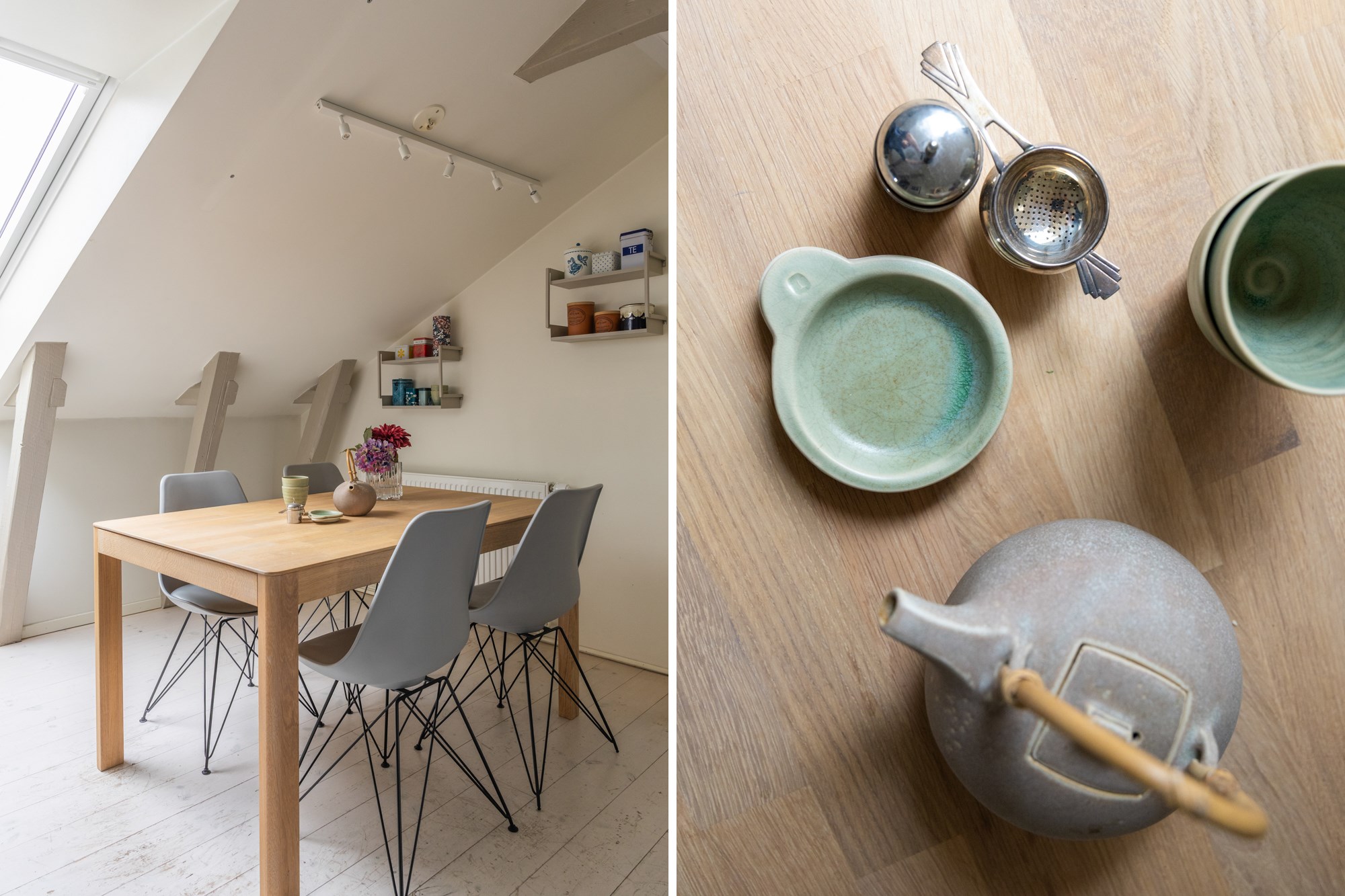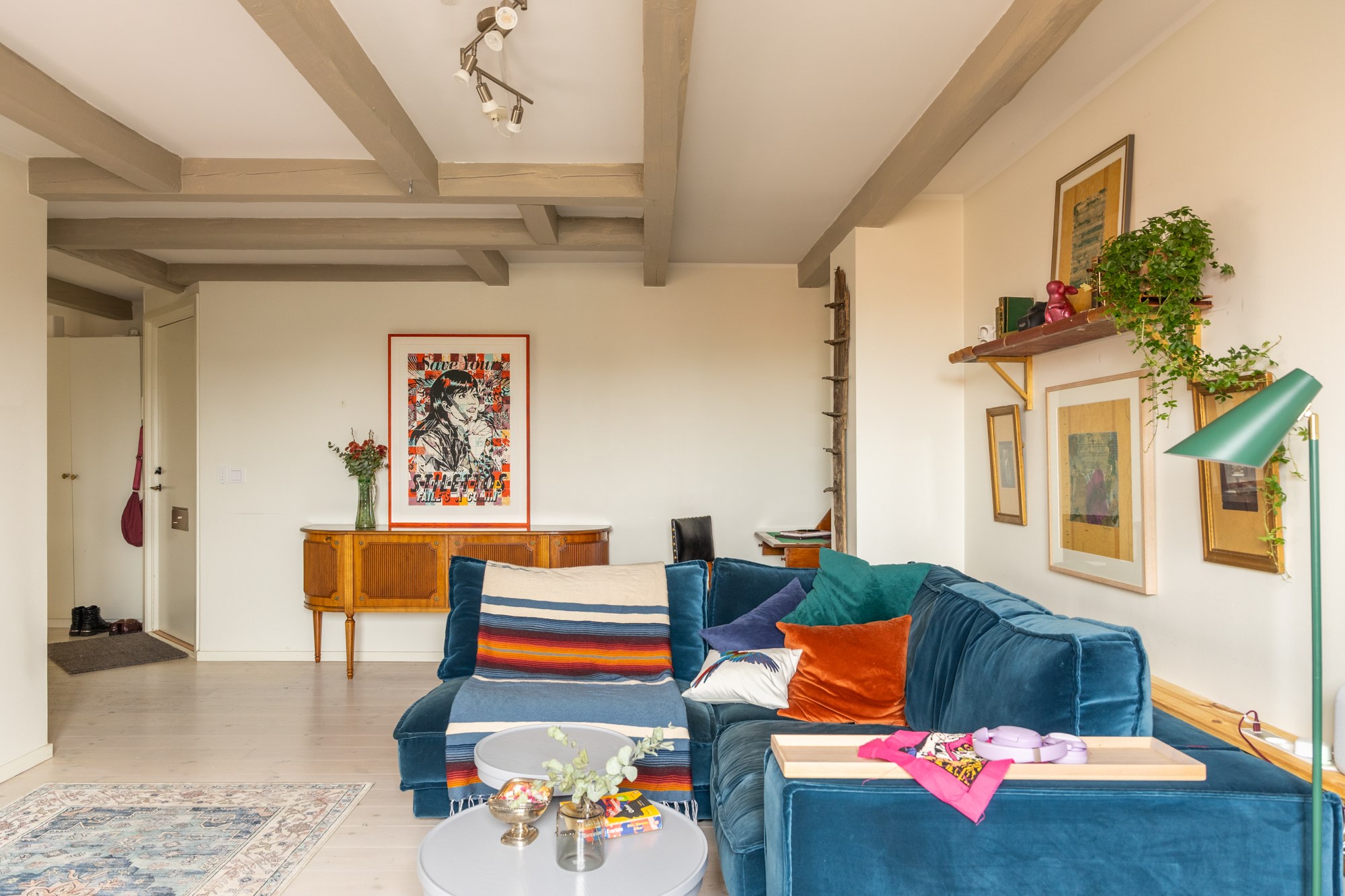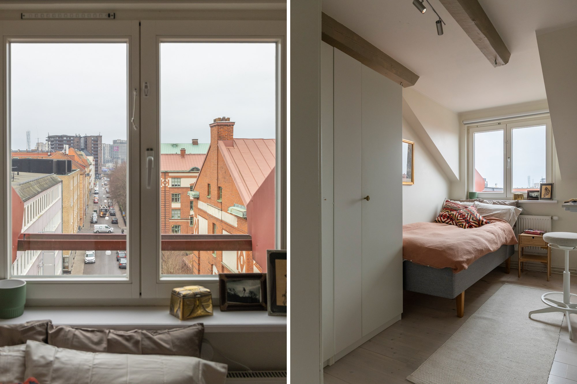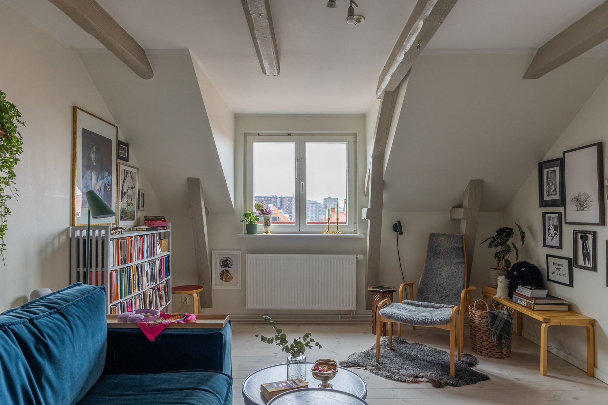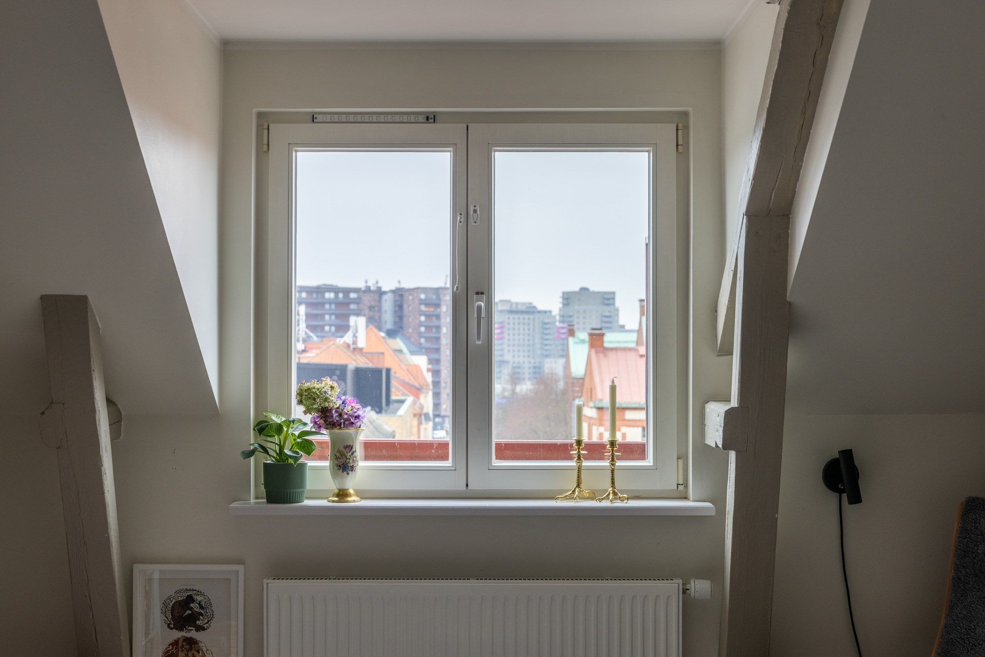 Behandlat brädgolv med vita släta väggar. Takbjälkar, Fönster med fri utsikt.