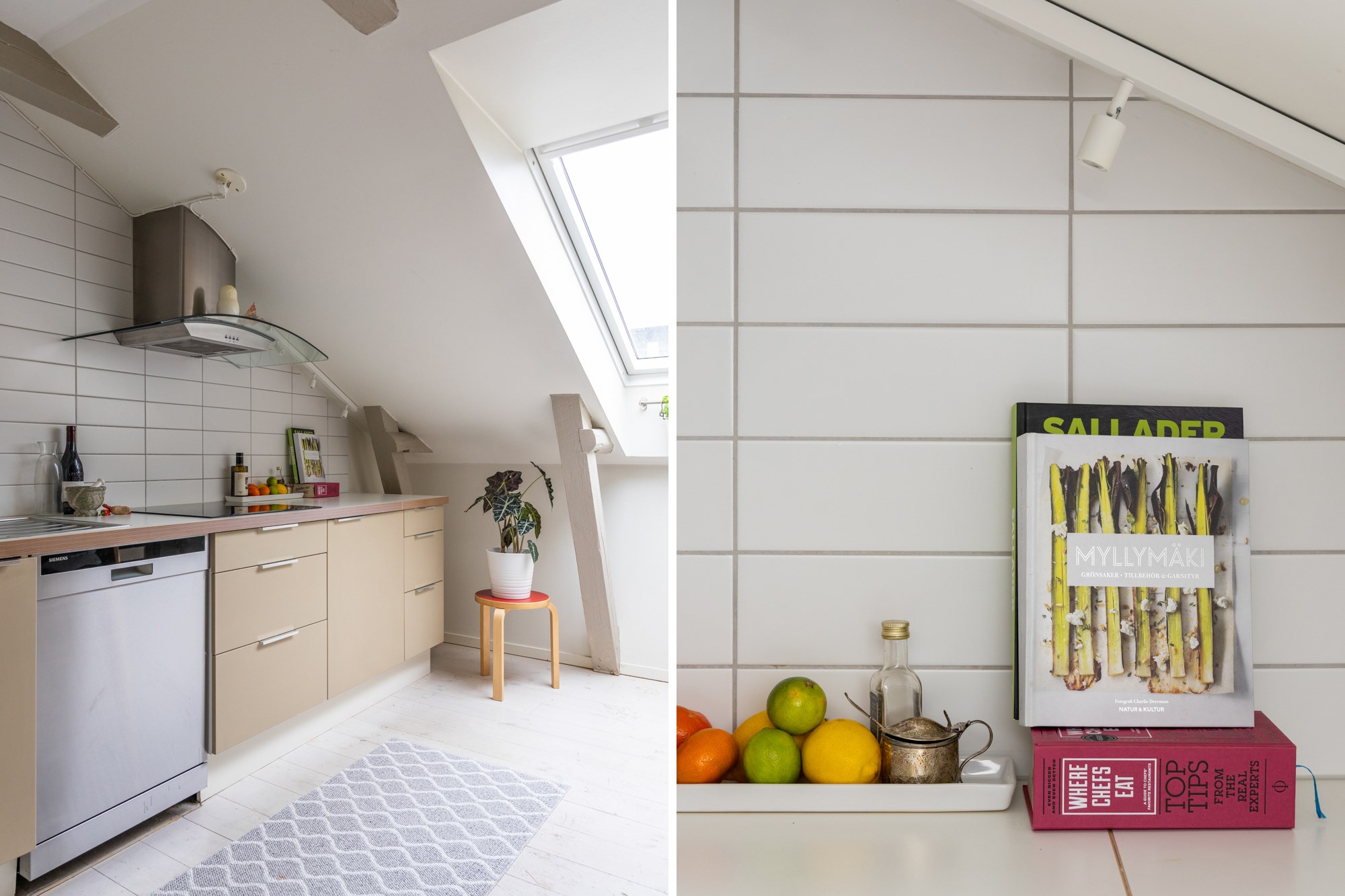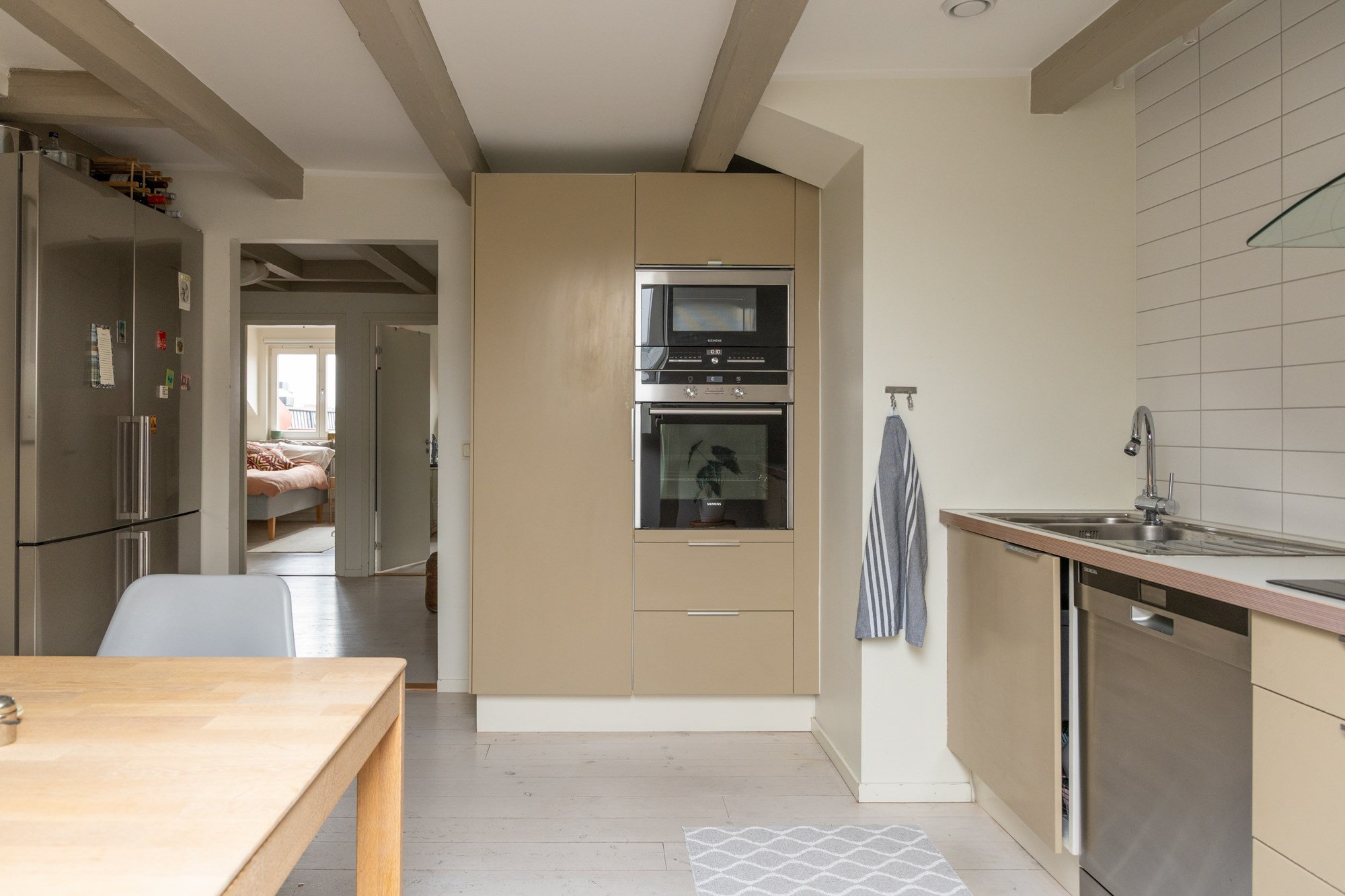 Kök i beige nyans och vitt kakel. Utrustat med spis, ugn, inbyggd mikrovågsugn, diskmaskin och två kyl/frys. Plats för större matbord.