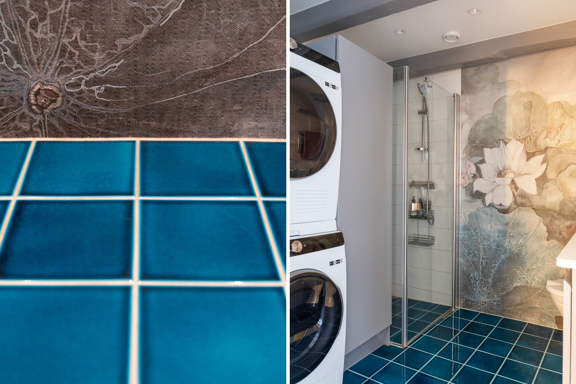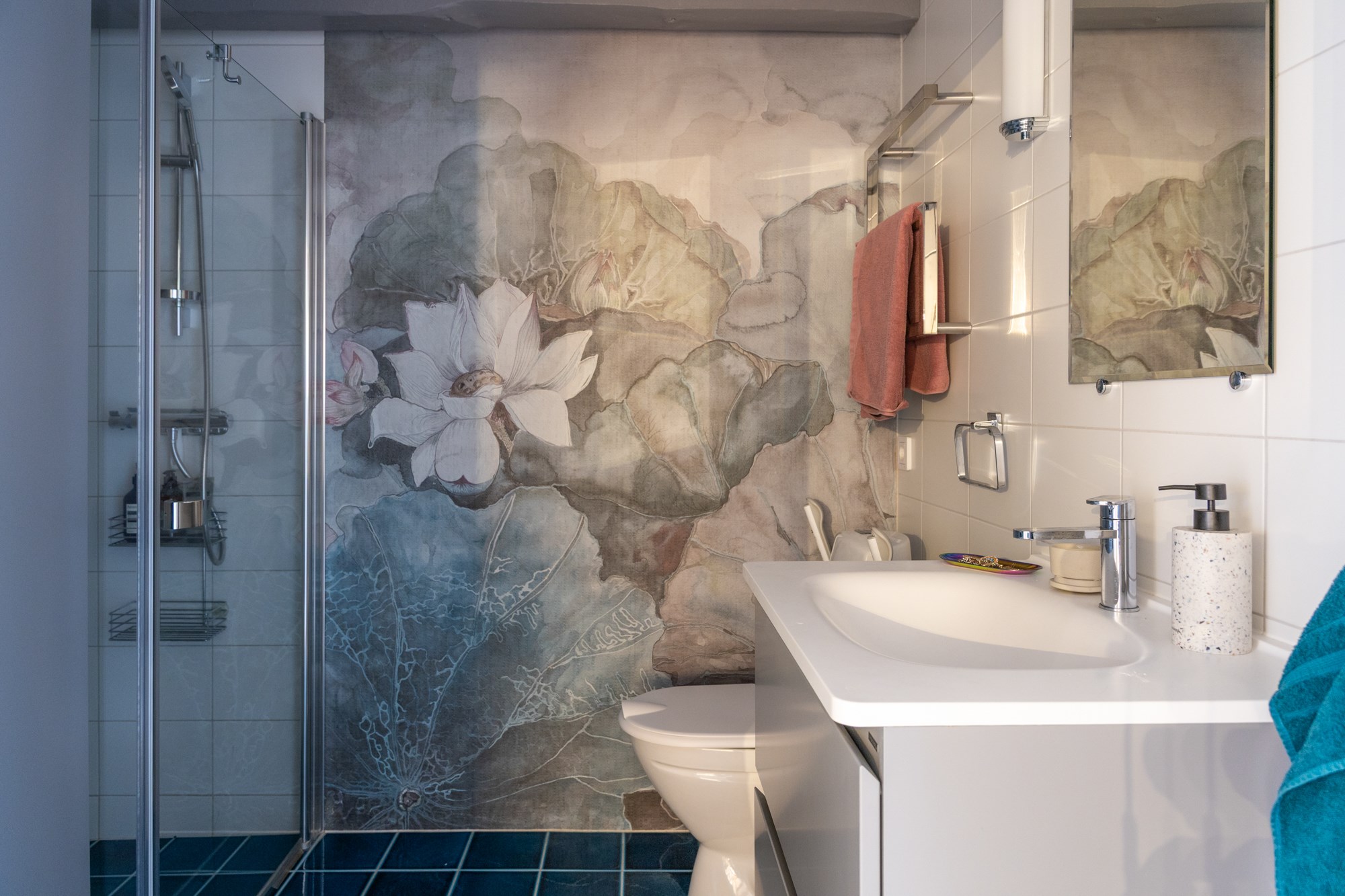 Helkaklat badrum med en badrumstapet. Tvättmaskin, torktumlare, wc, kommod och dusch. Renoverat badrum 2018.