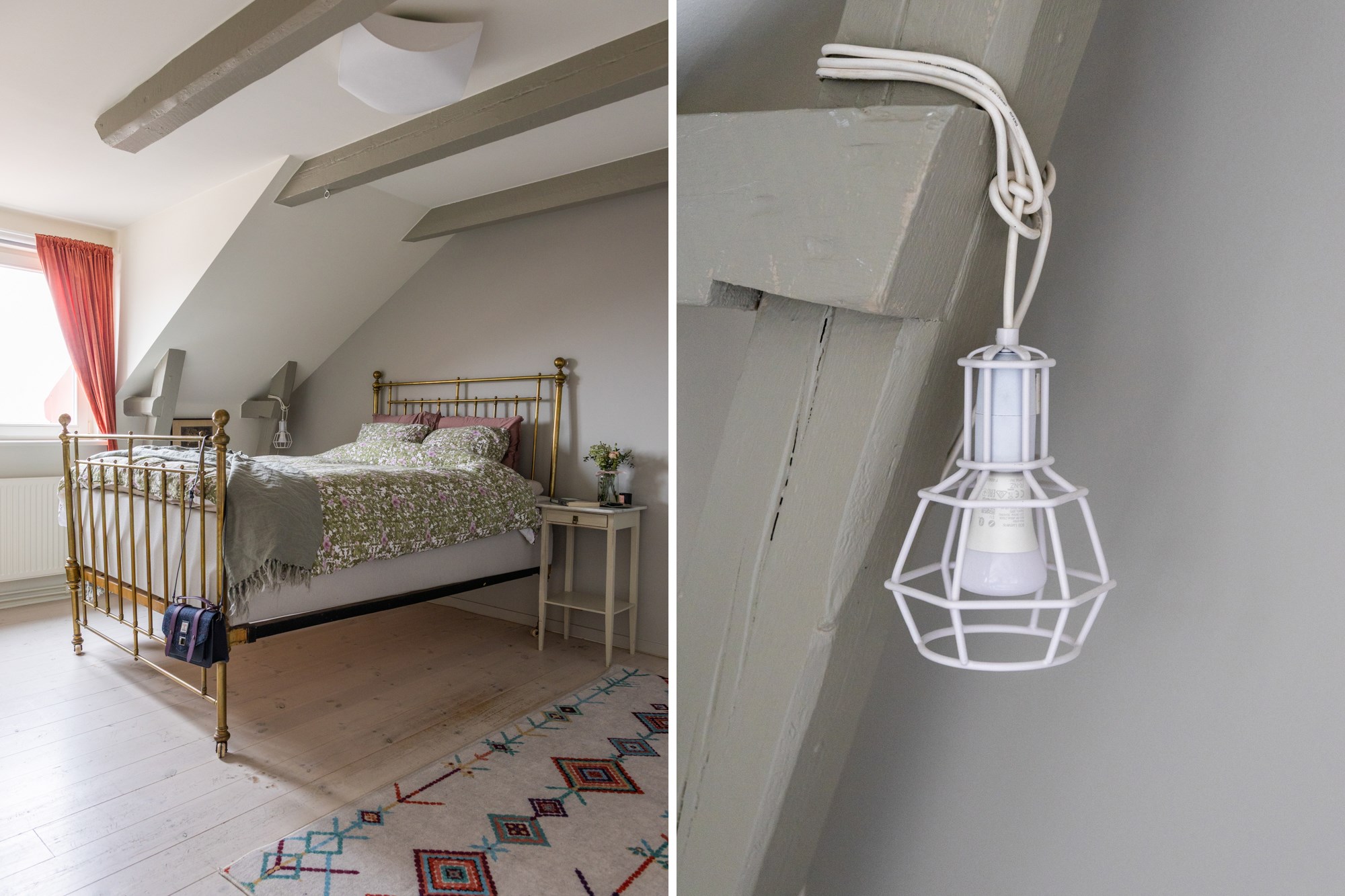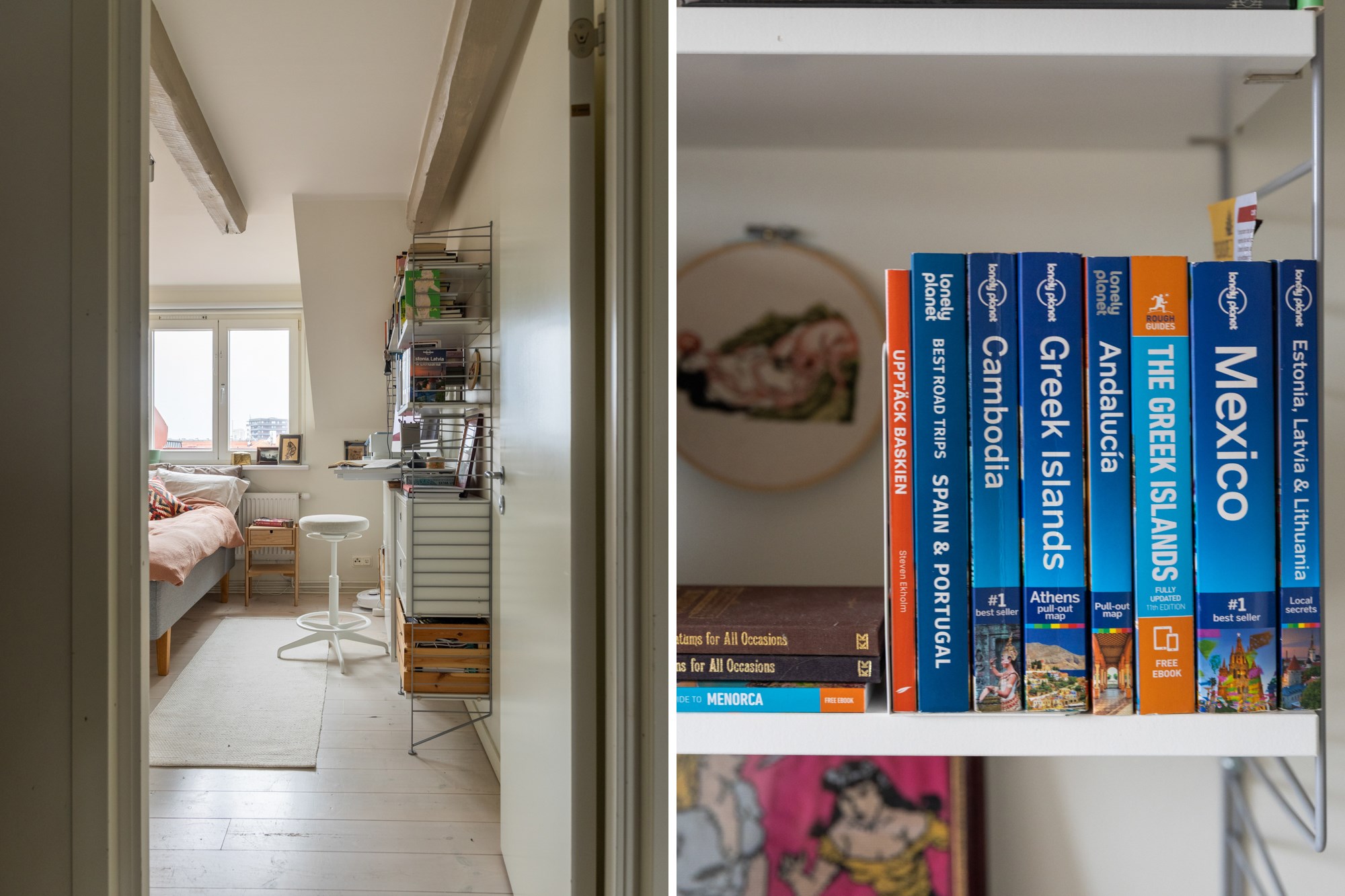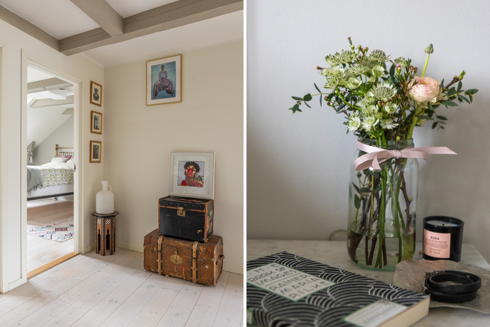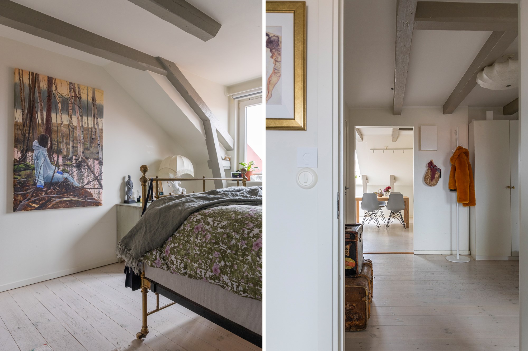 Behandlat brädgolv med vita släta väggar. Garderobsförvaring.