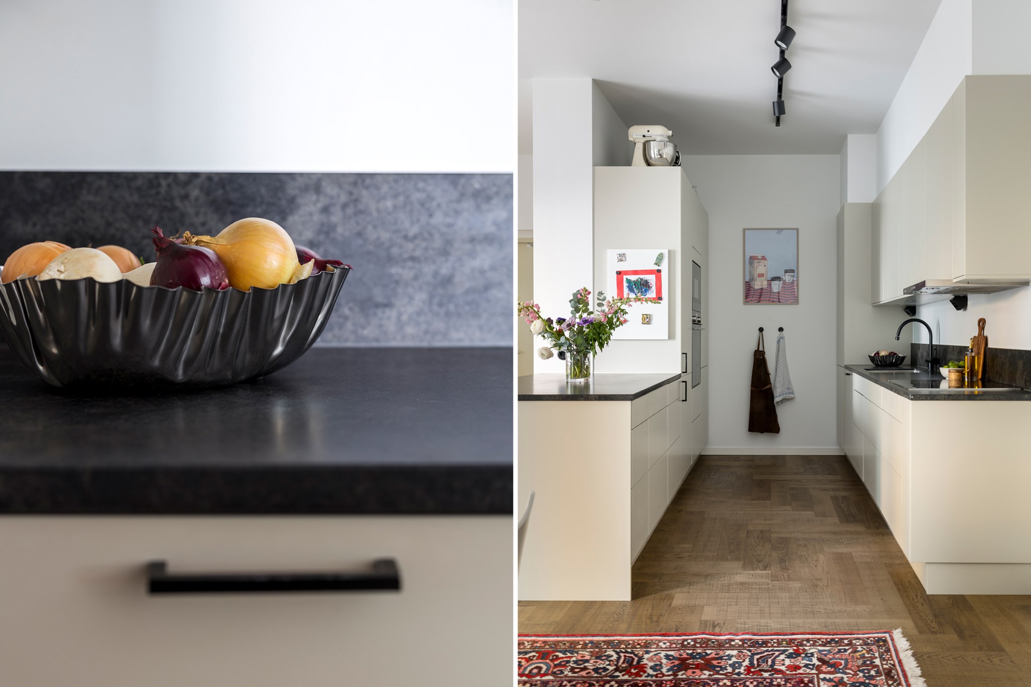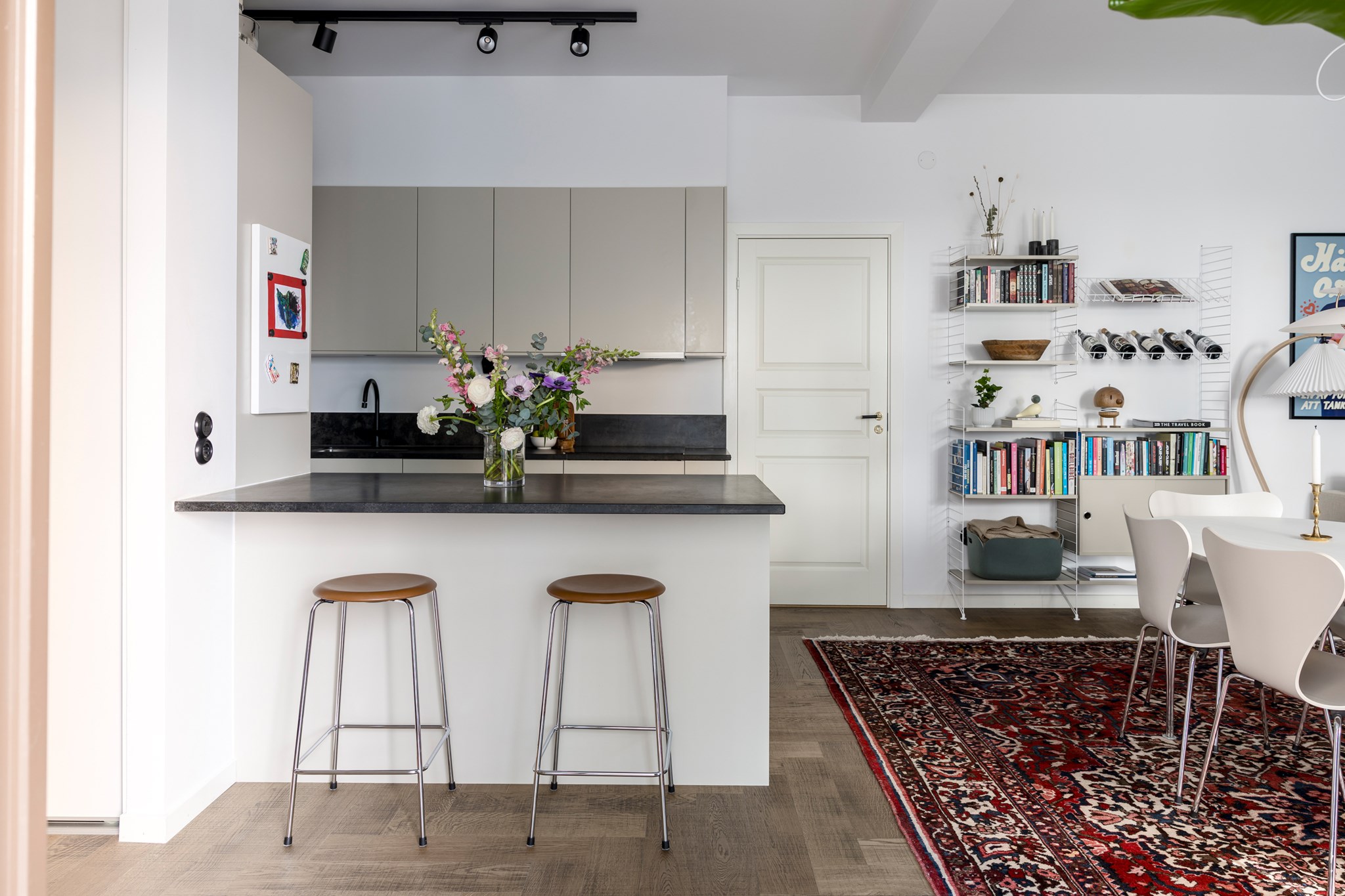 Parkettgolv och ljusa väggar. Ljus köksinredning. Maskinell utrustning i form av induktionshäll och fläkt, ugn, mikrovågsugn, diskmaskin, delad kyl och frys. Köksö med sittplats.