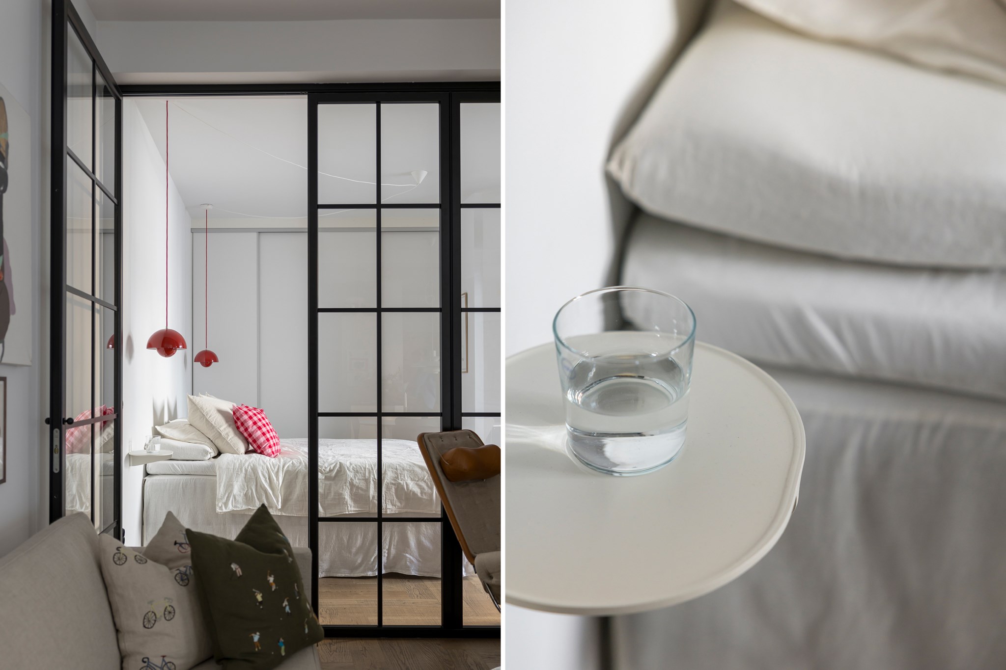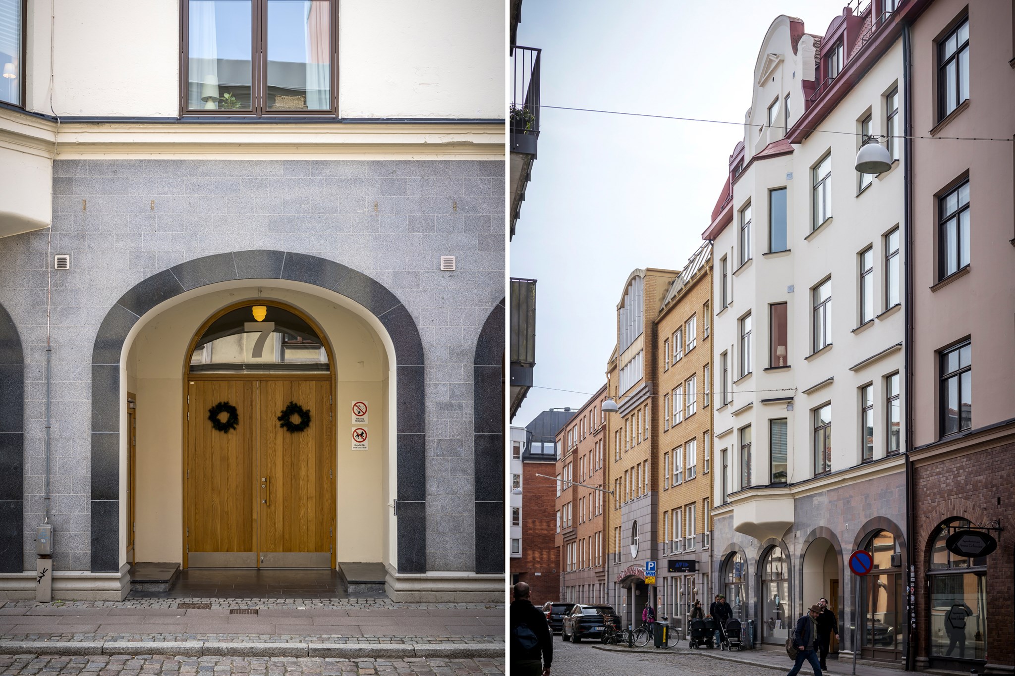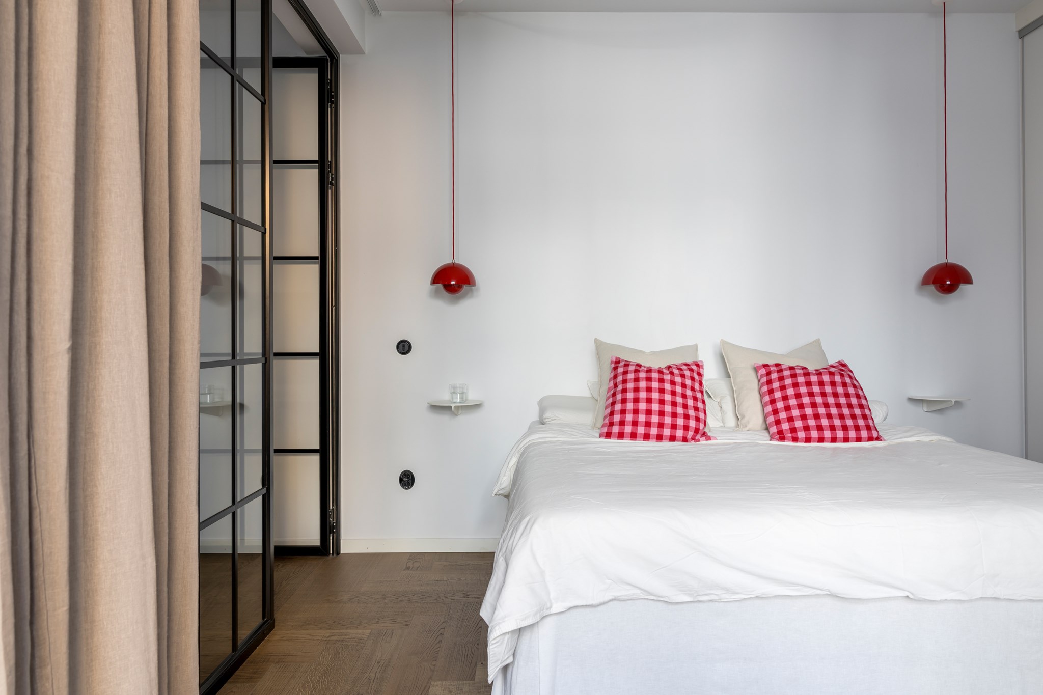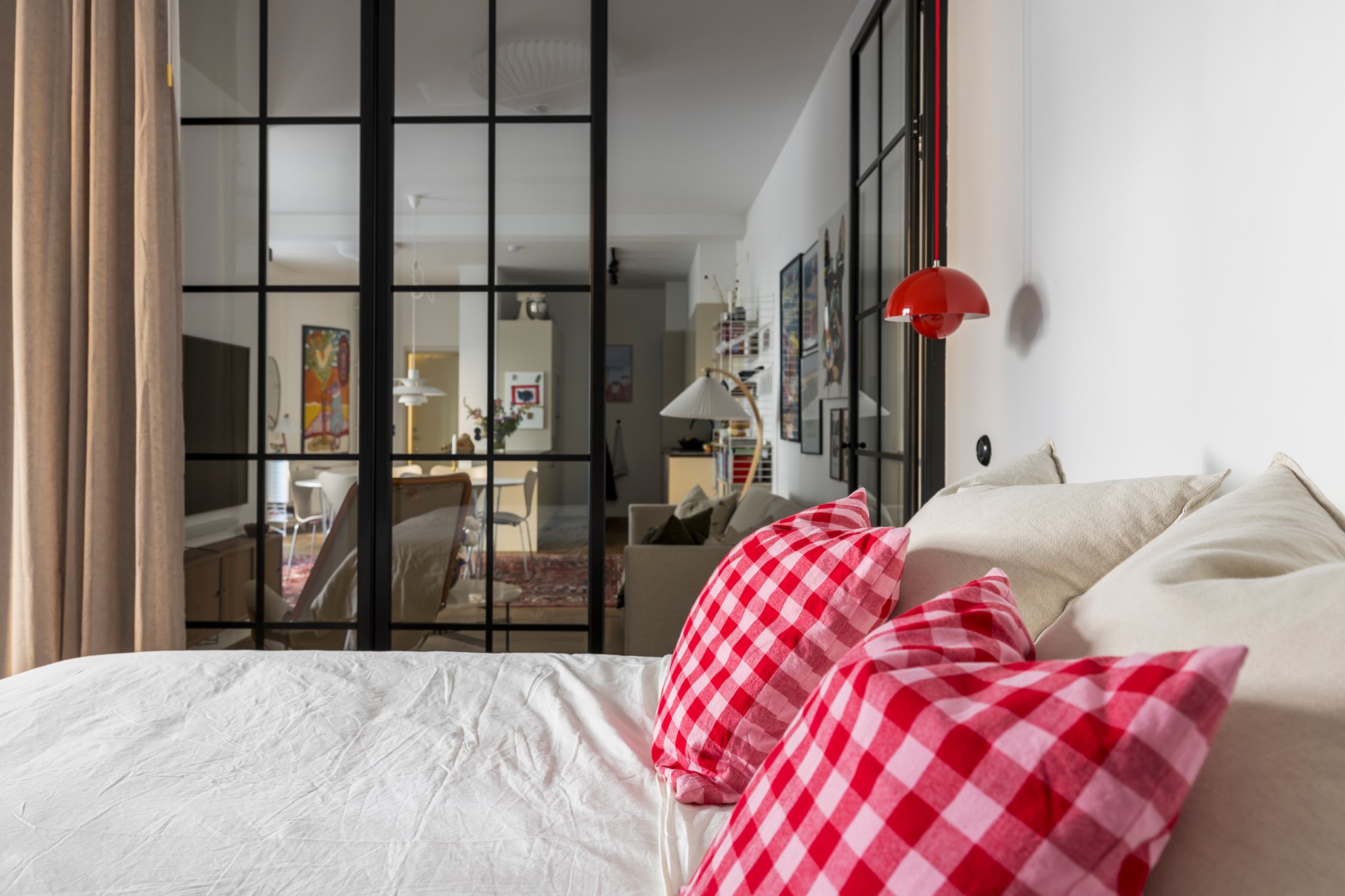 Parkettgolv och ljusa väggar. Generöst med garderobsförvaring. Dörröppning till fransk balkong.