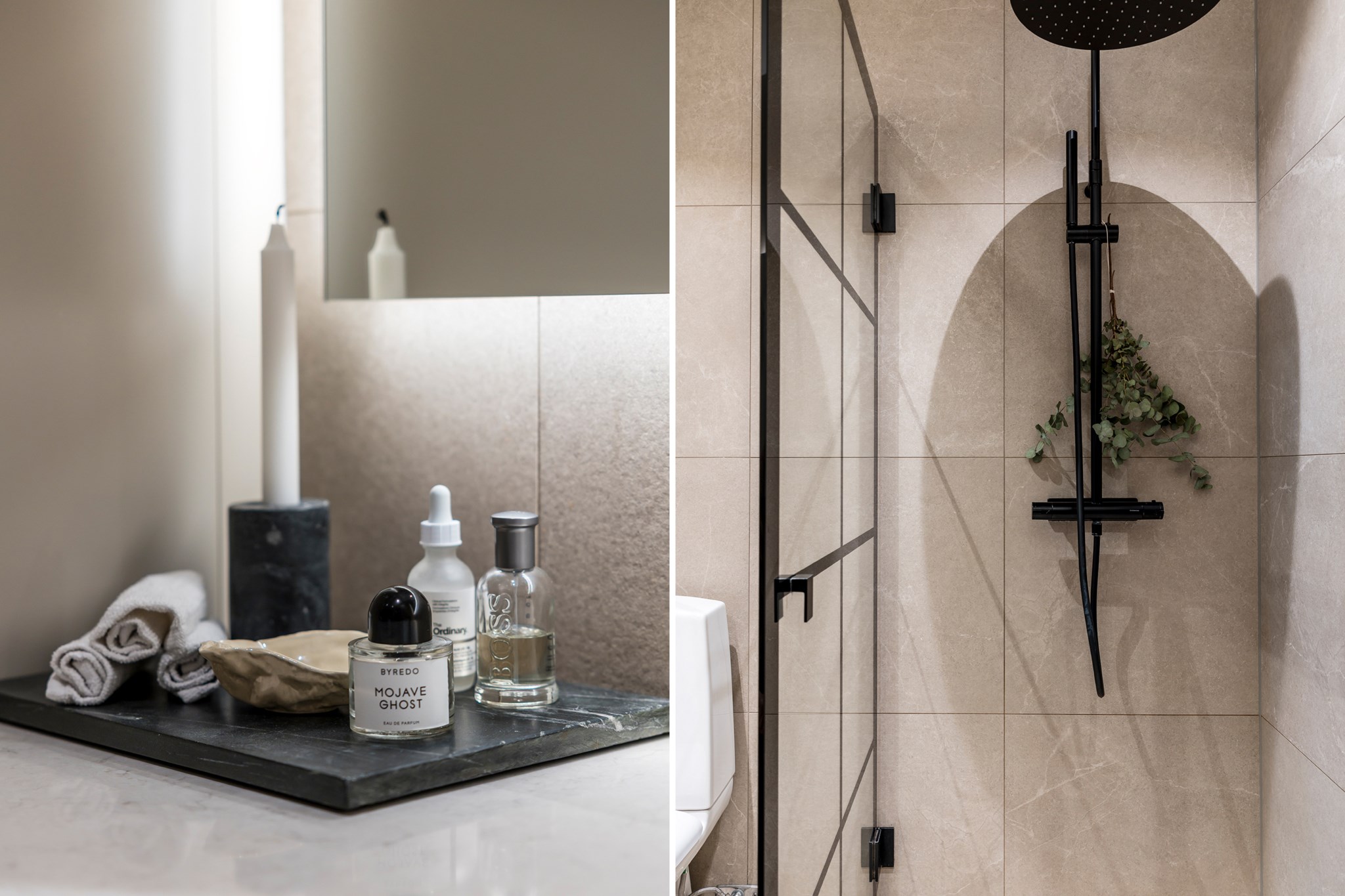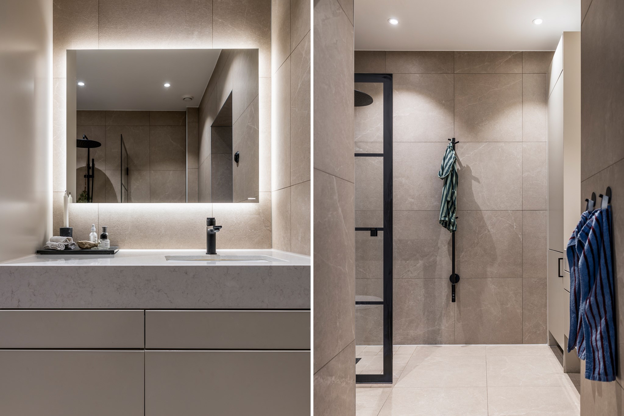 Helkaklat badrum. Ljust klinker och kakel. Utrustad med WC, handfat med ljus kommod, spegel, dusch, handdukstork, tvättmaskin och torktumlare.