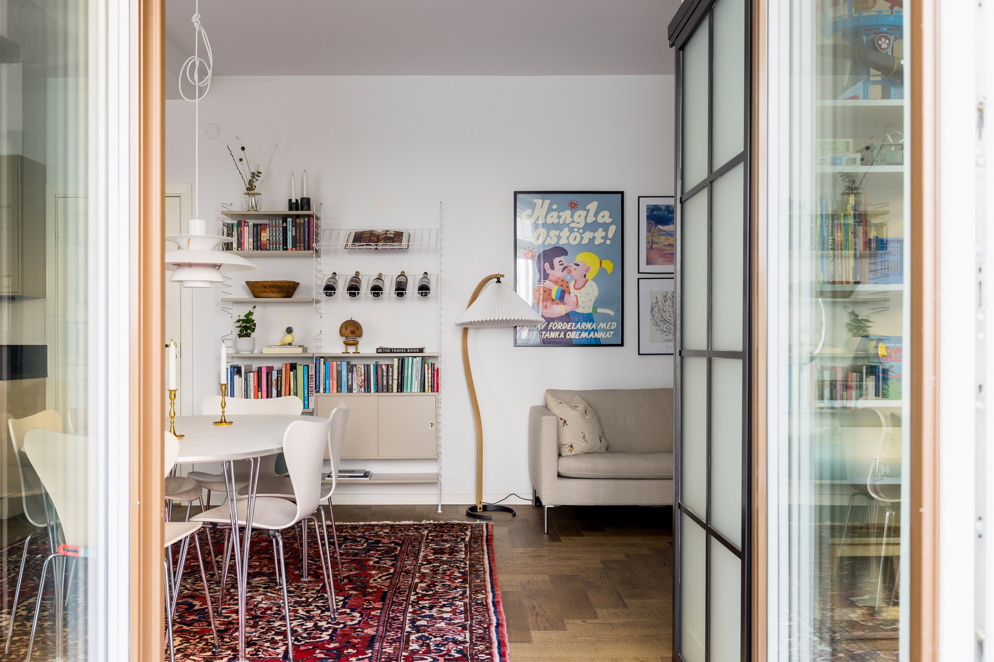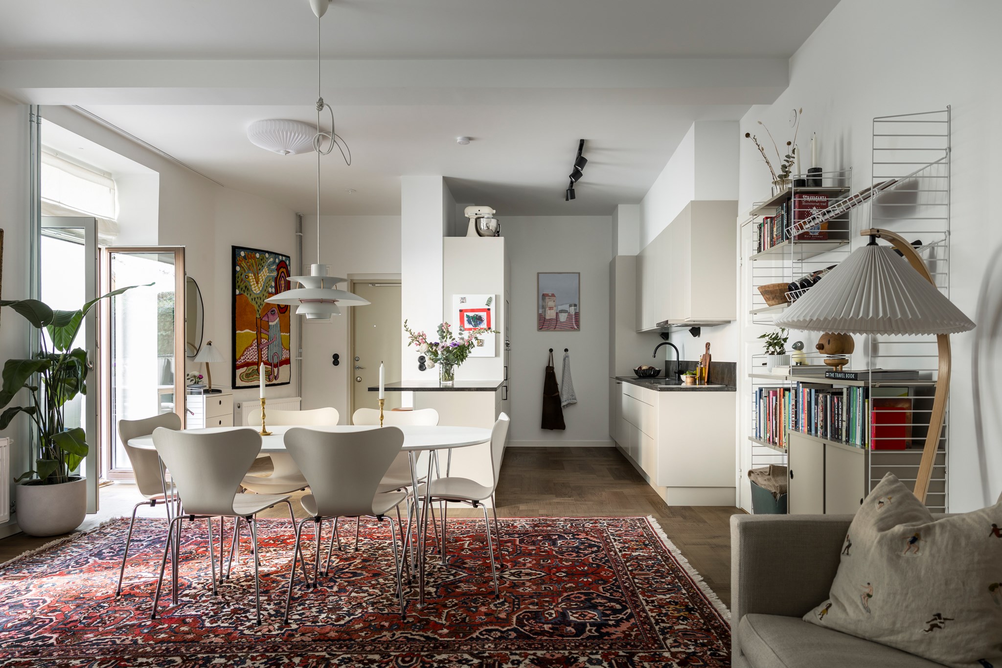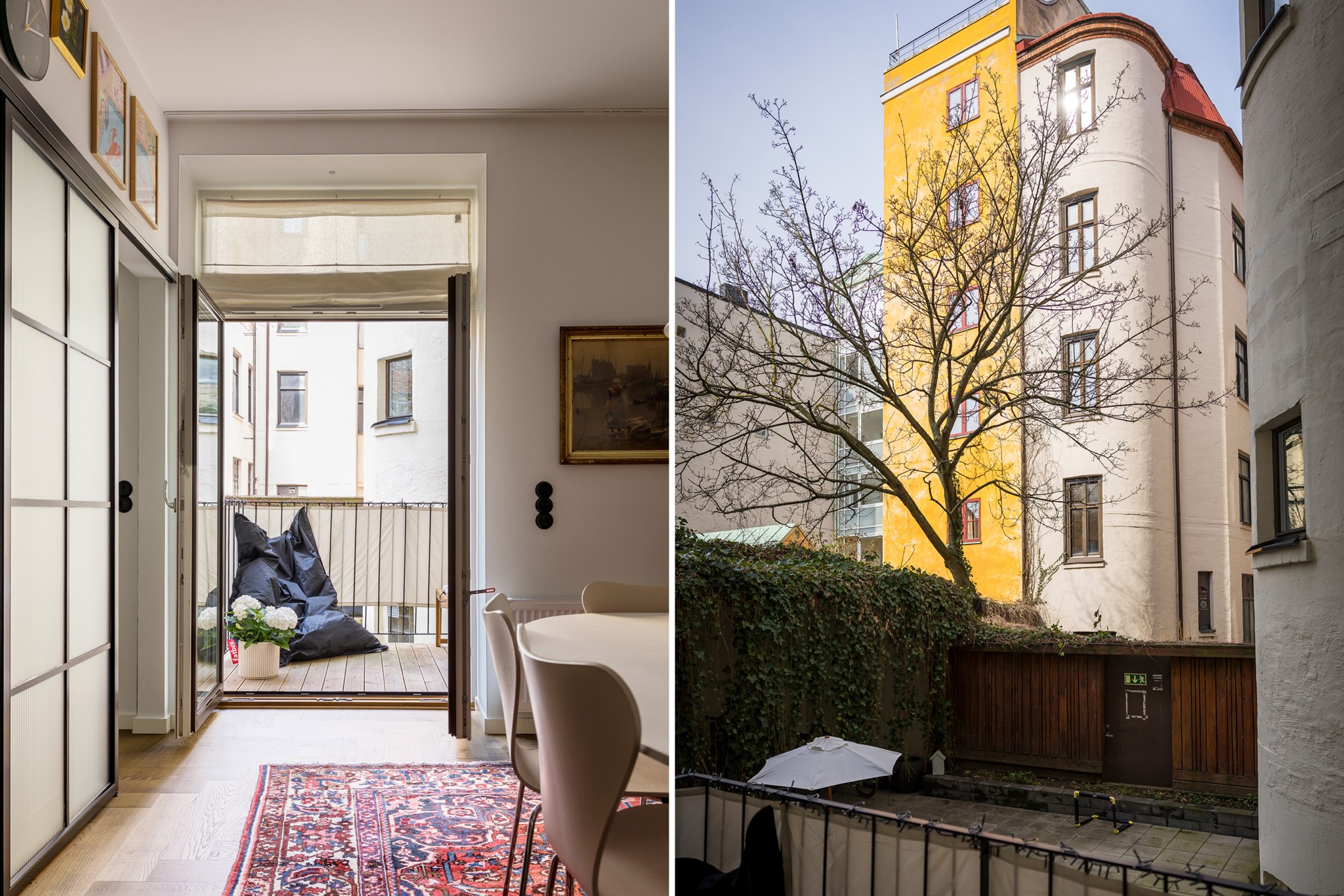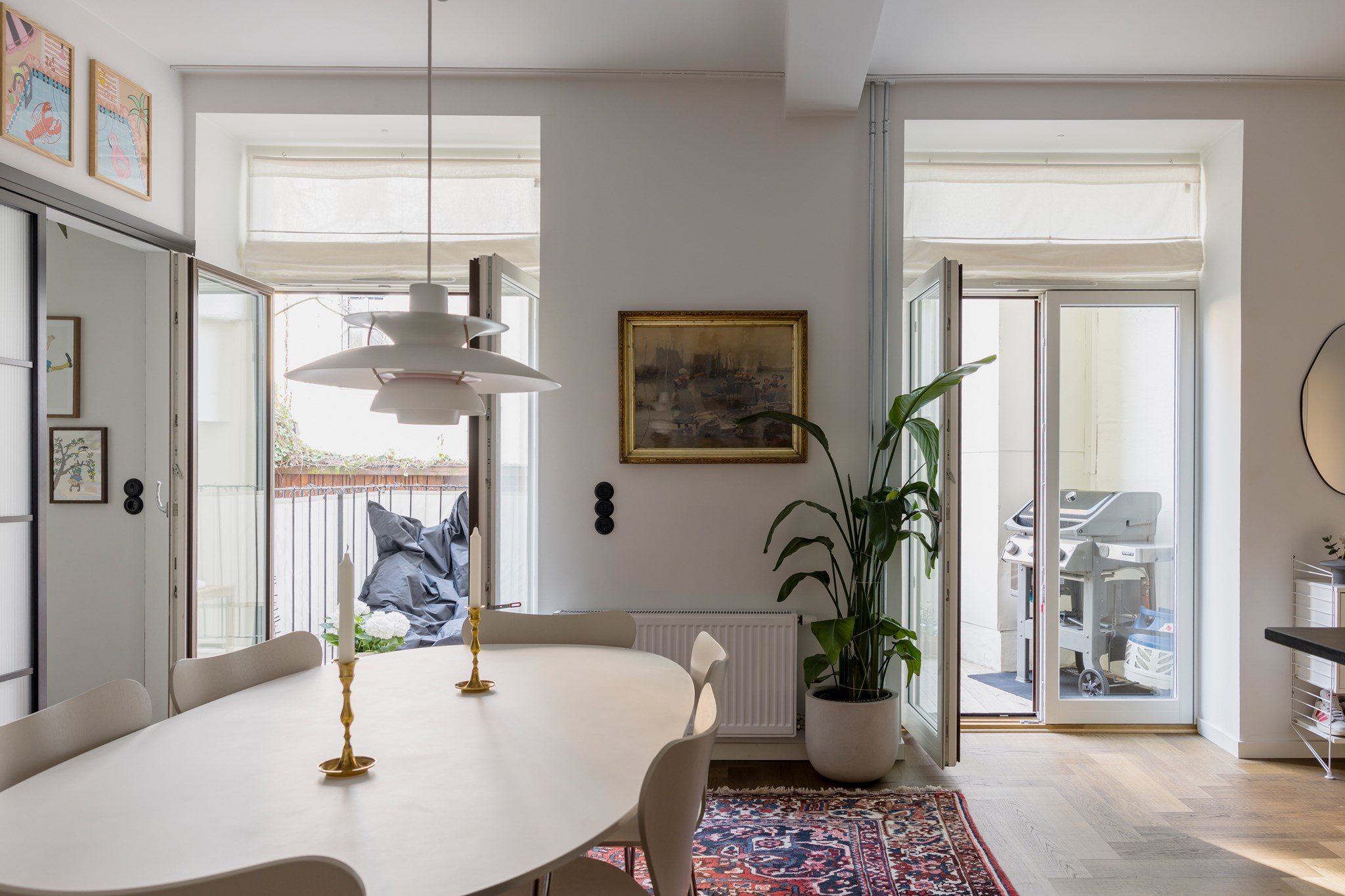 Parkettgolv och ljusa väggar. Plats för soffgrupp och matplats. Utgång till balkong.
