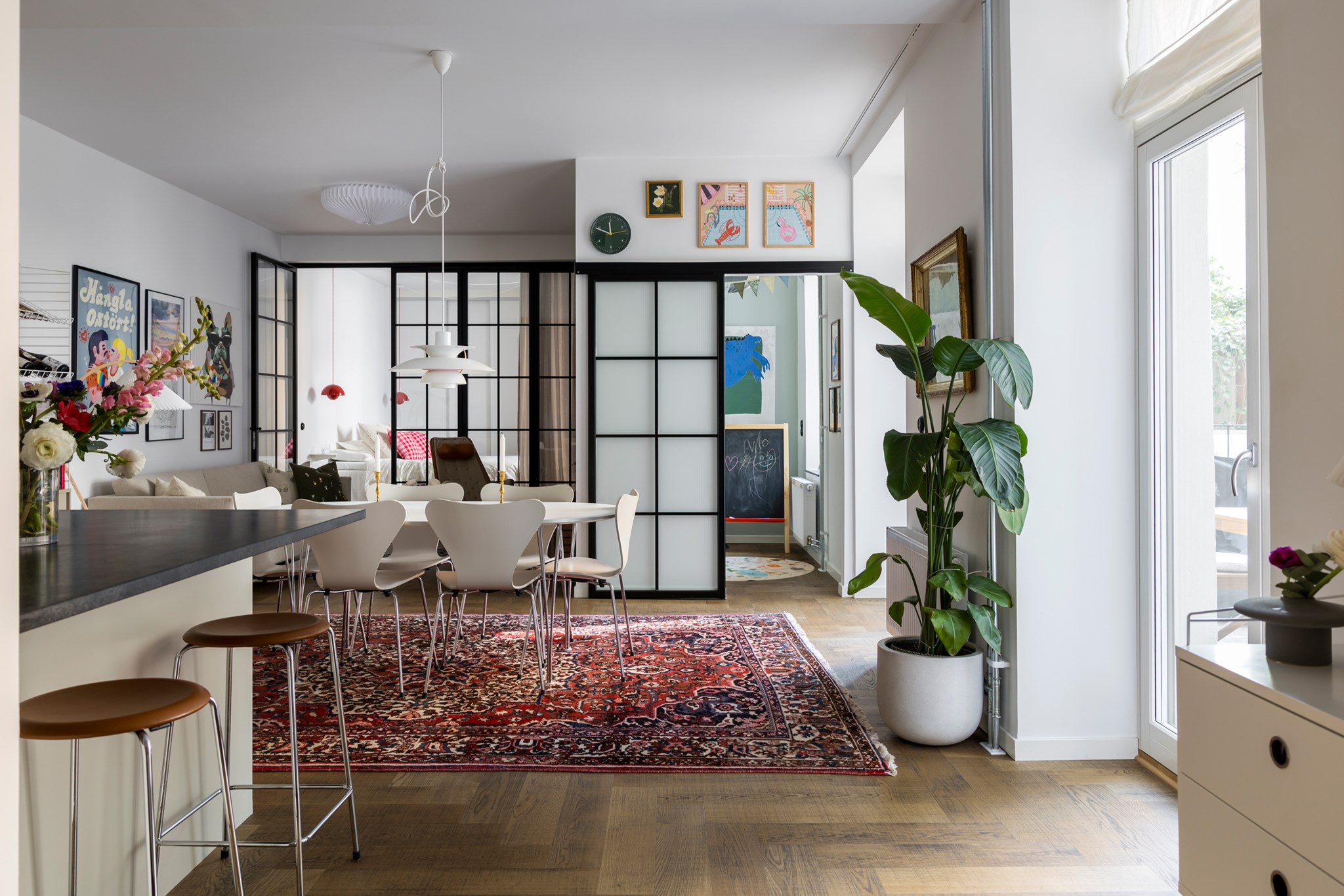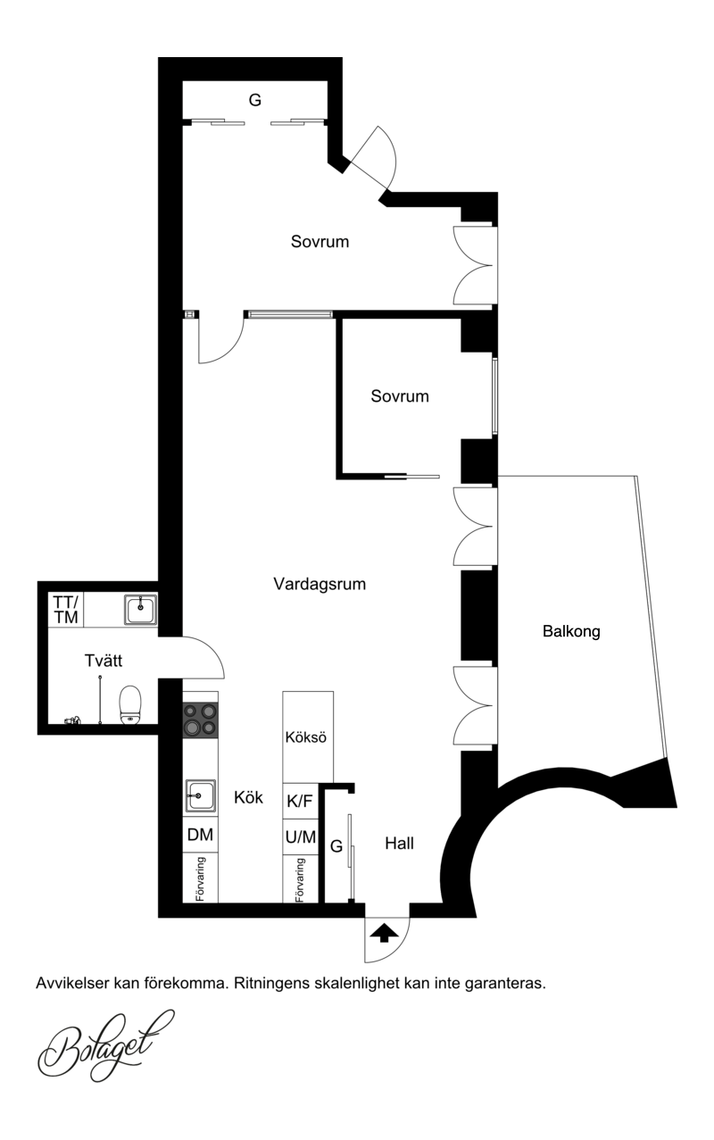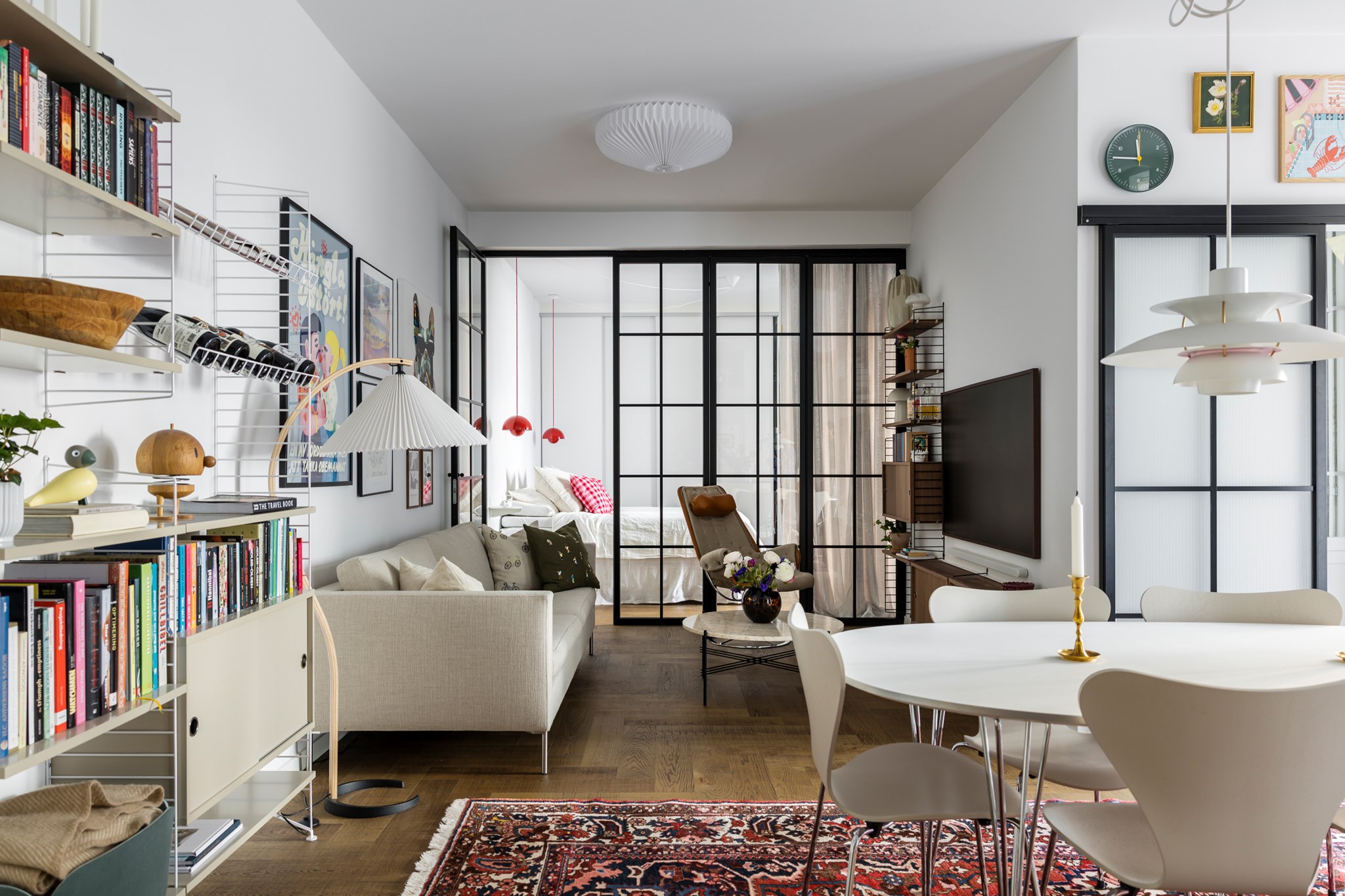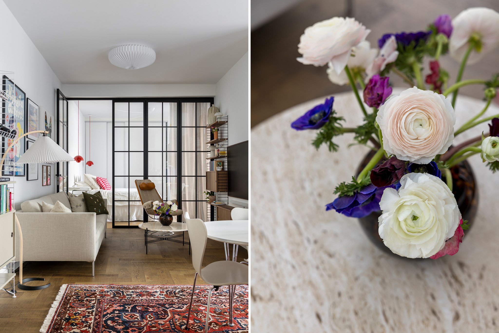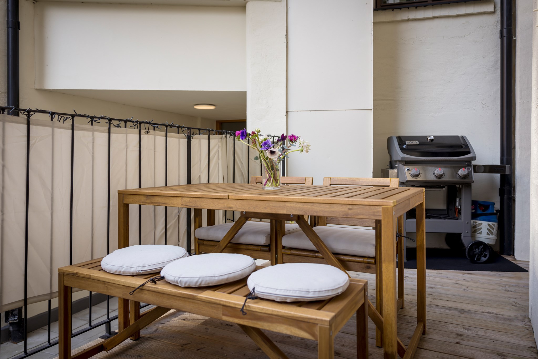 Parkettgolv och ljusa väggar. Plats för soffgrupp och matplats. Utgång till balkong.