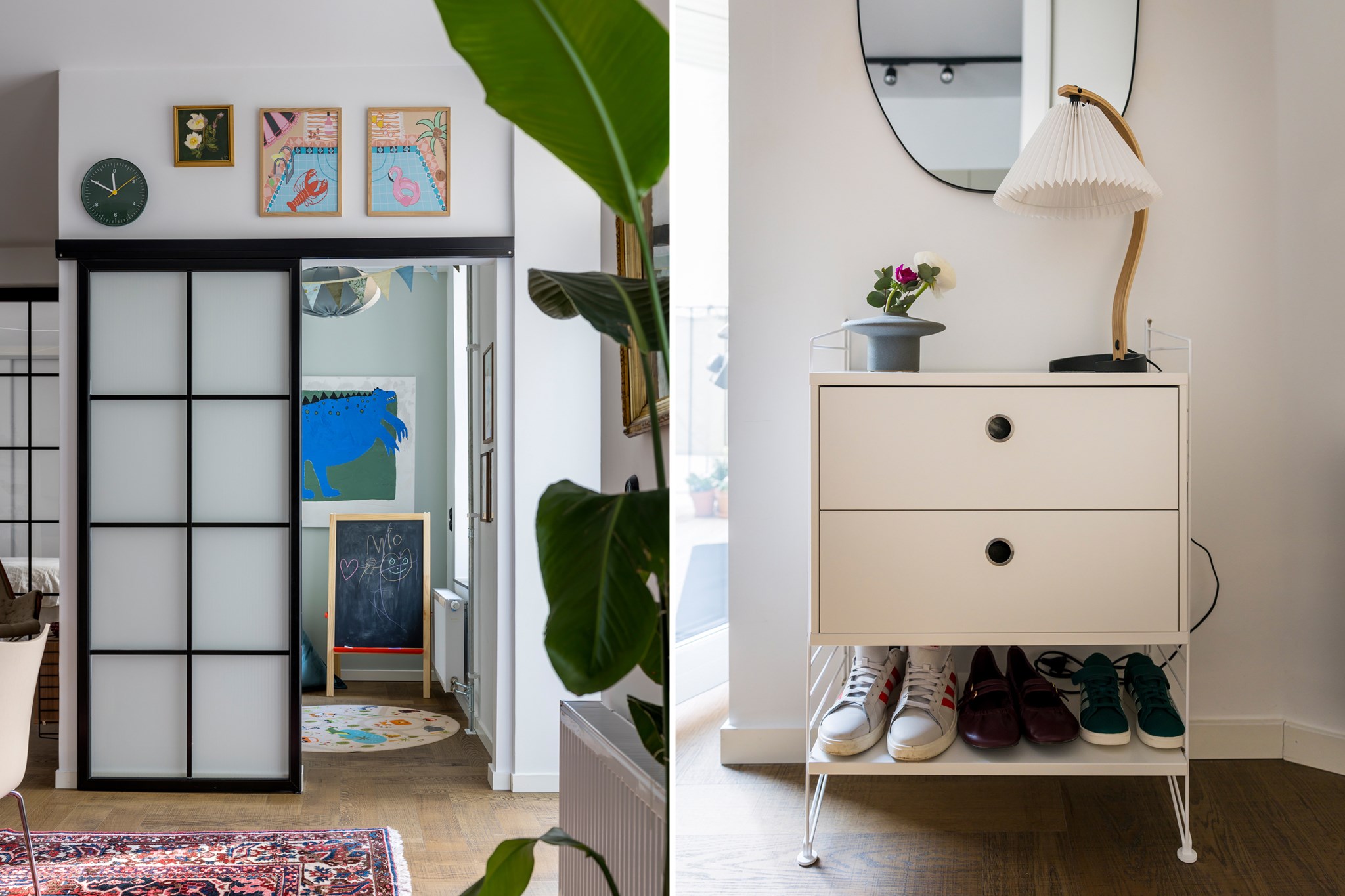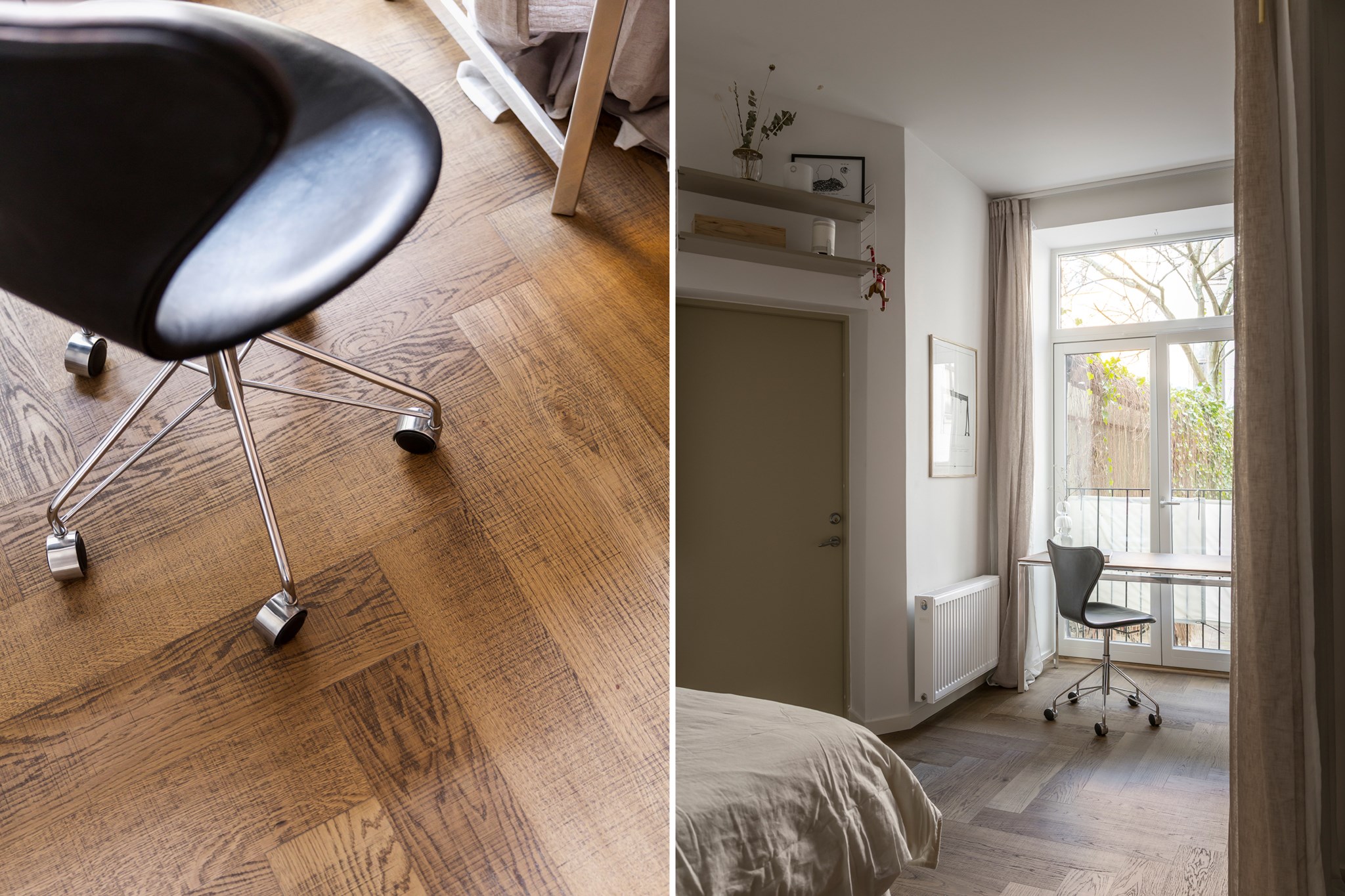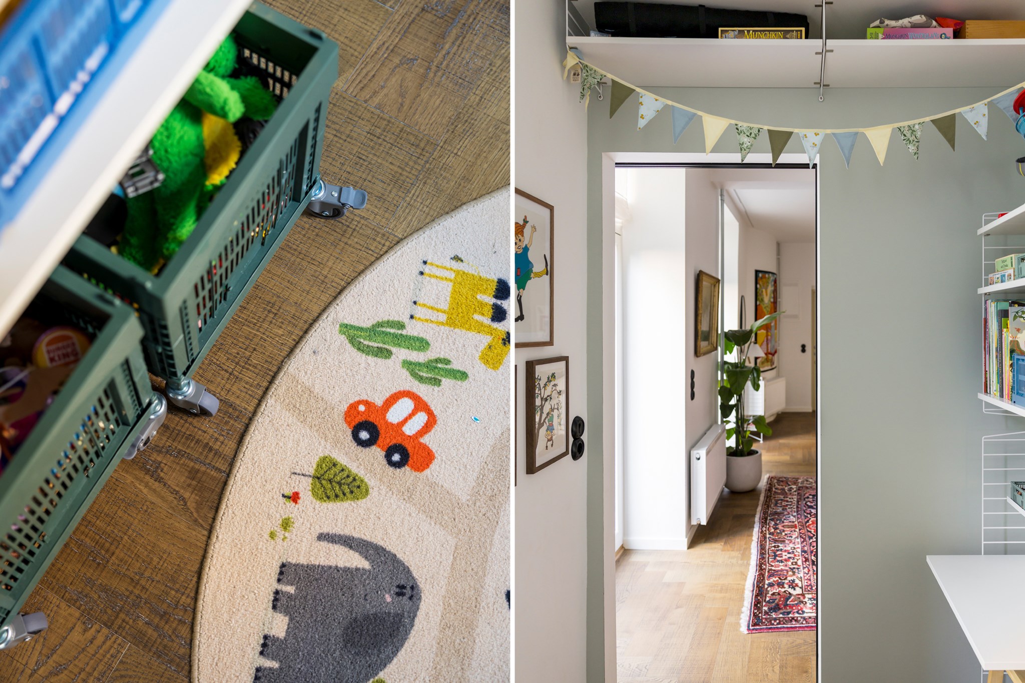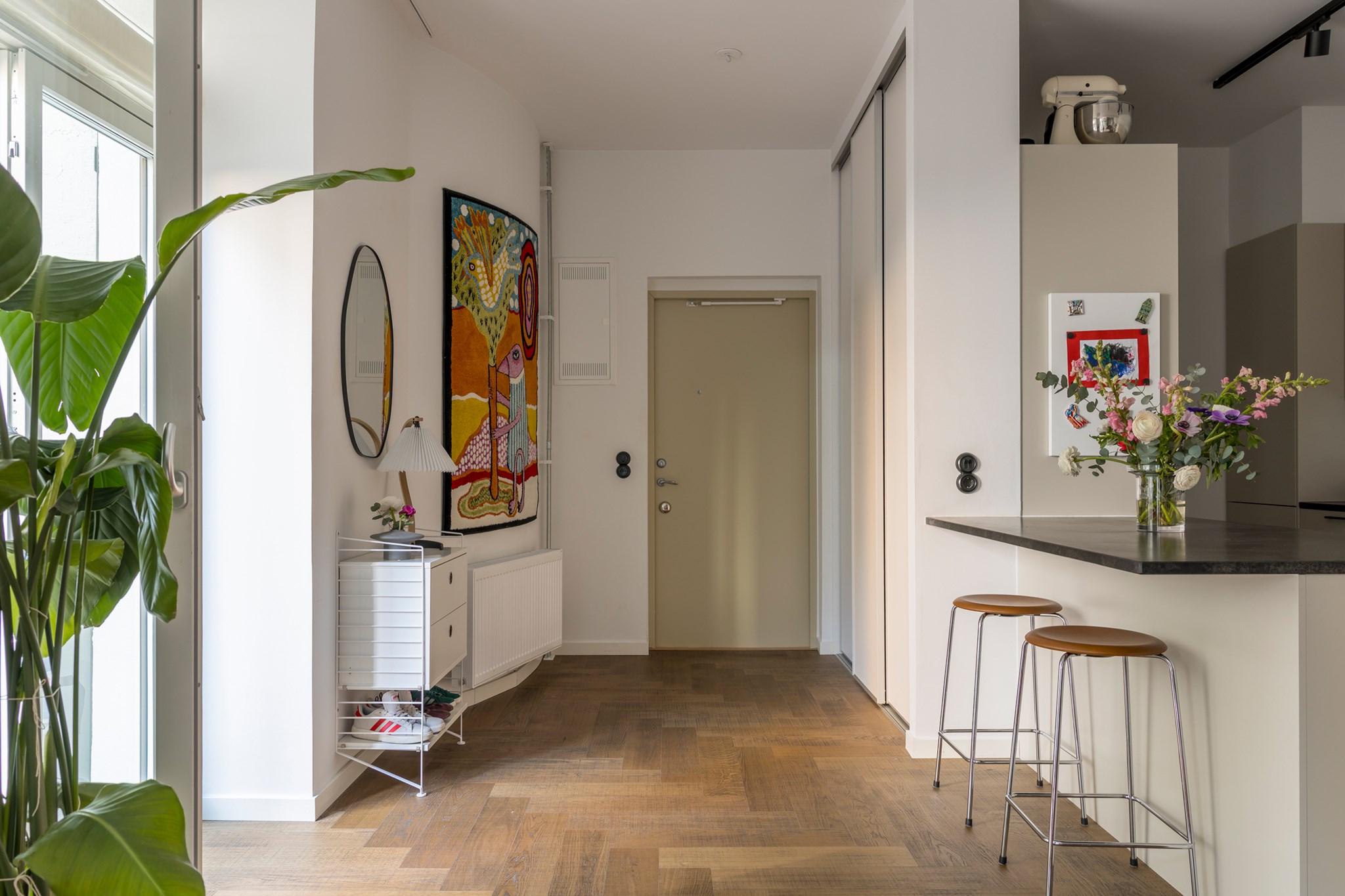 Parkettgolv och ljusa väggar. Garderobförvaring.