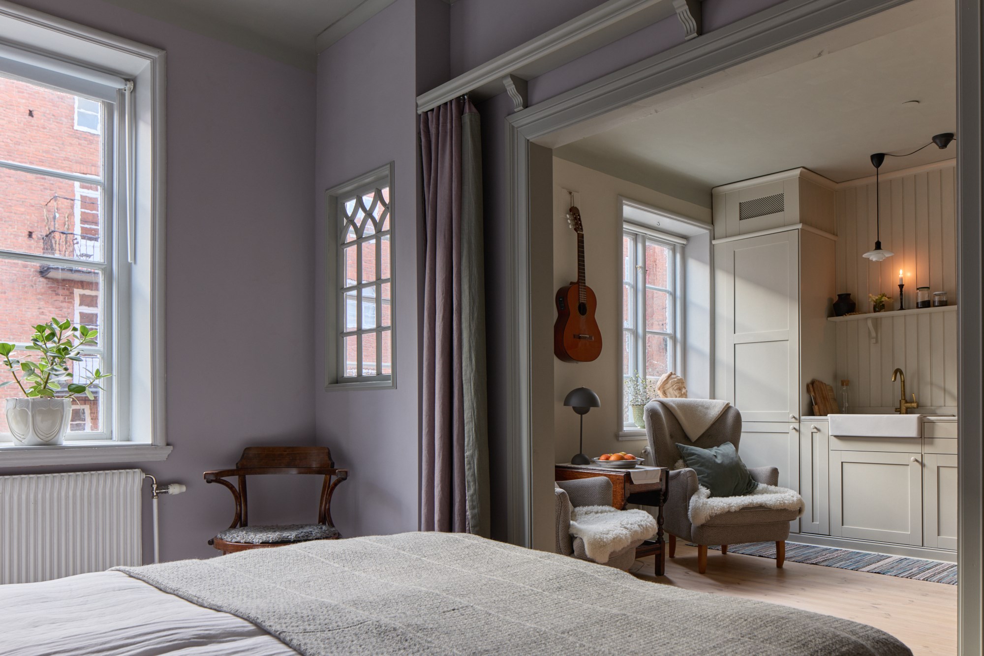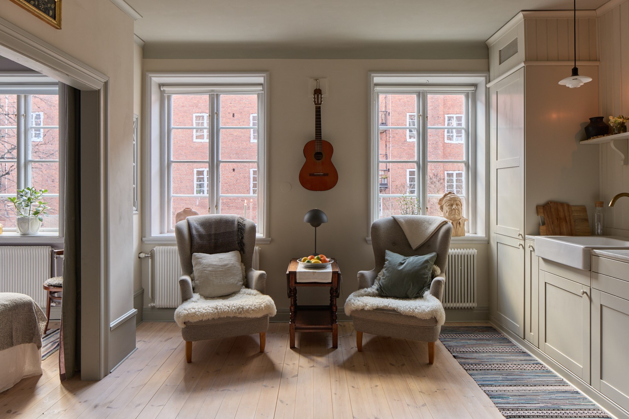 Ljust brädgolv och släta väggar. Dekorativ kakelugn.