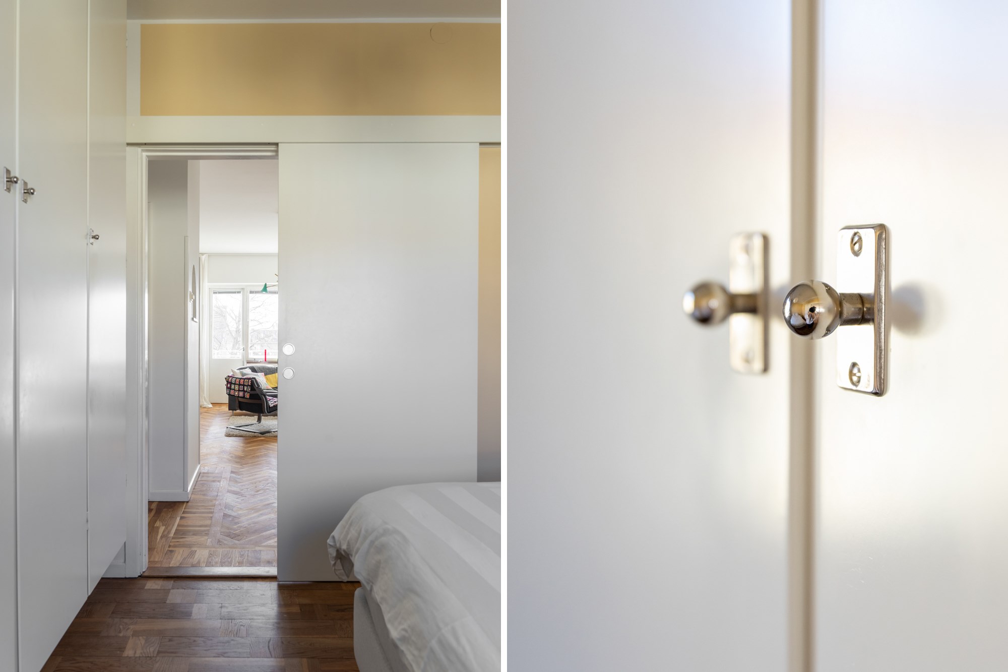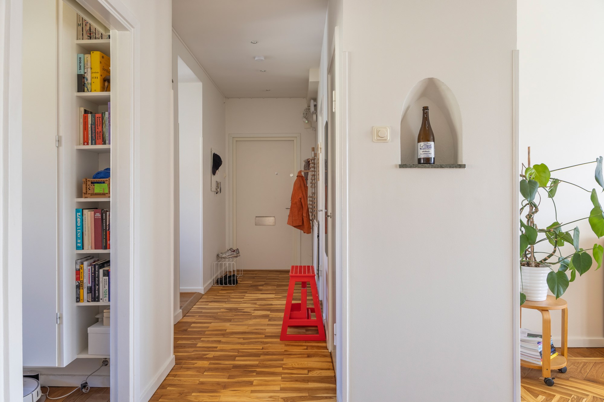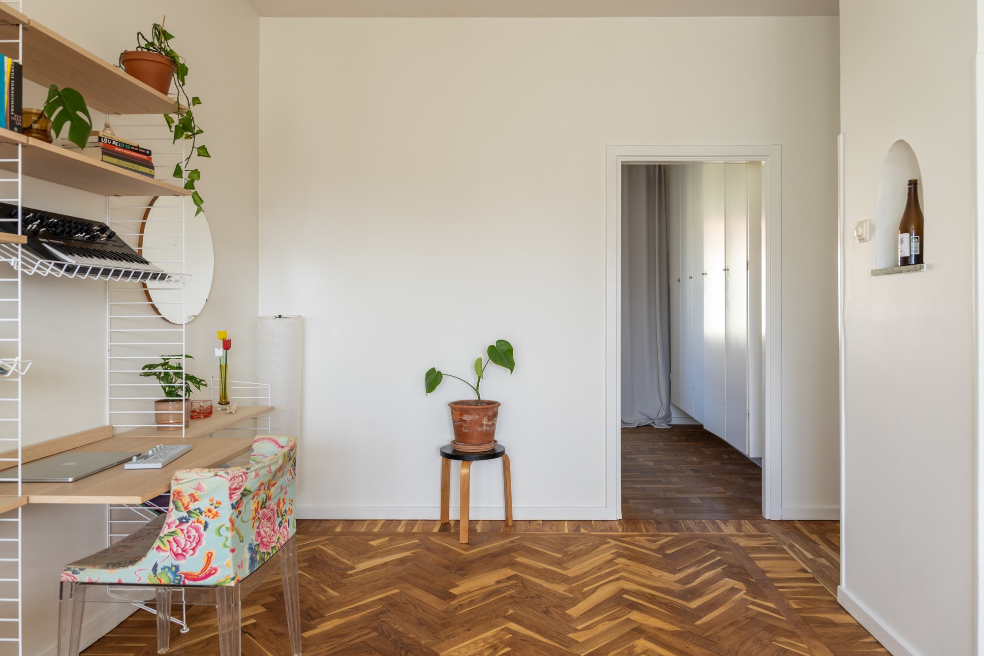Parkettgolv och ljusa väggar. Generöst med garderobsförvaring.