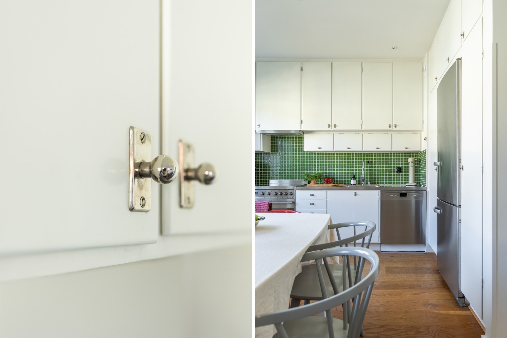 Parkettgolv och ljusa väggar. Vit köksinredning. Maskinell utrustning i form av fristående spis och fläkt, ugn, diskmaskin, delad kyl och frys. Direkt i anslutning till matplats.