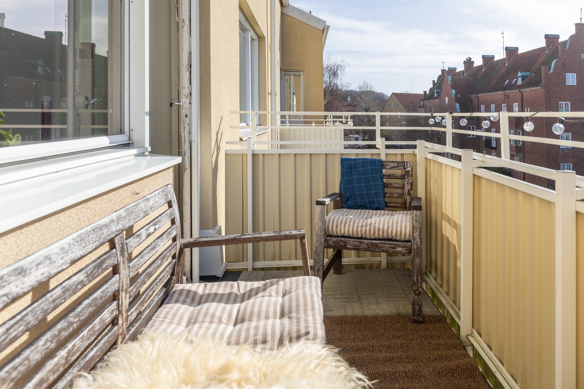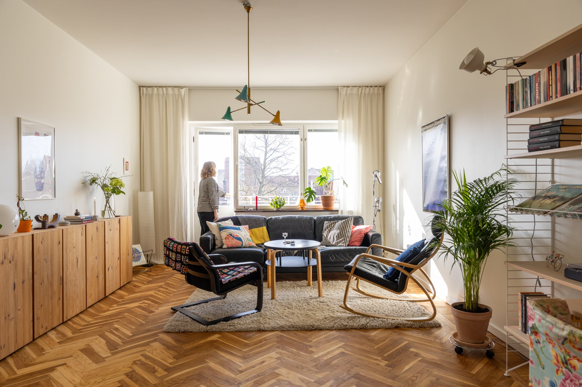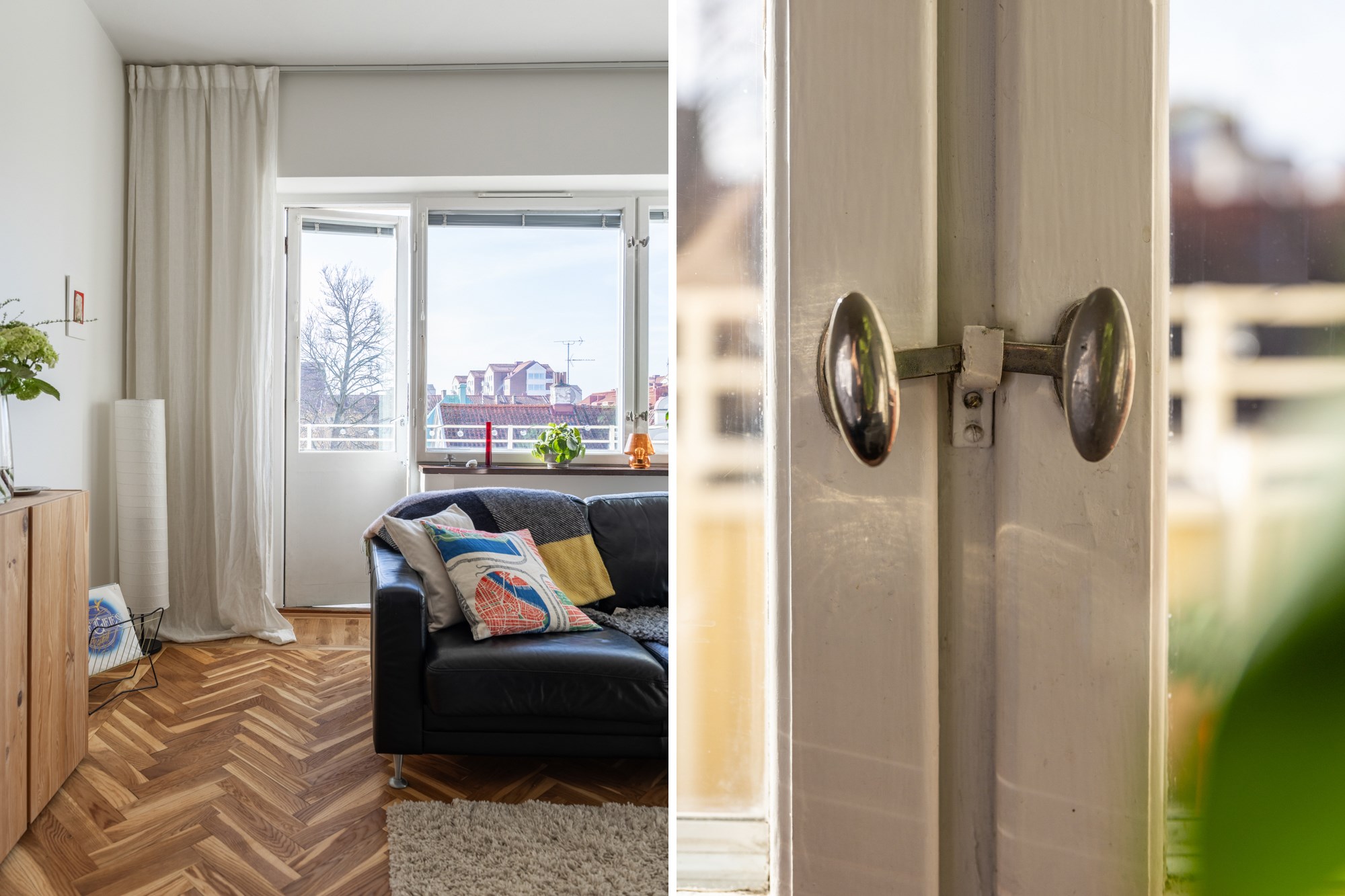 Parkettgolv och ljusa väggar. Plats för soffgrupp. Utgång till balkong.