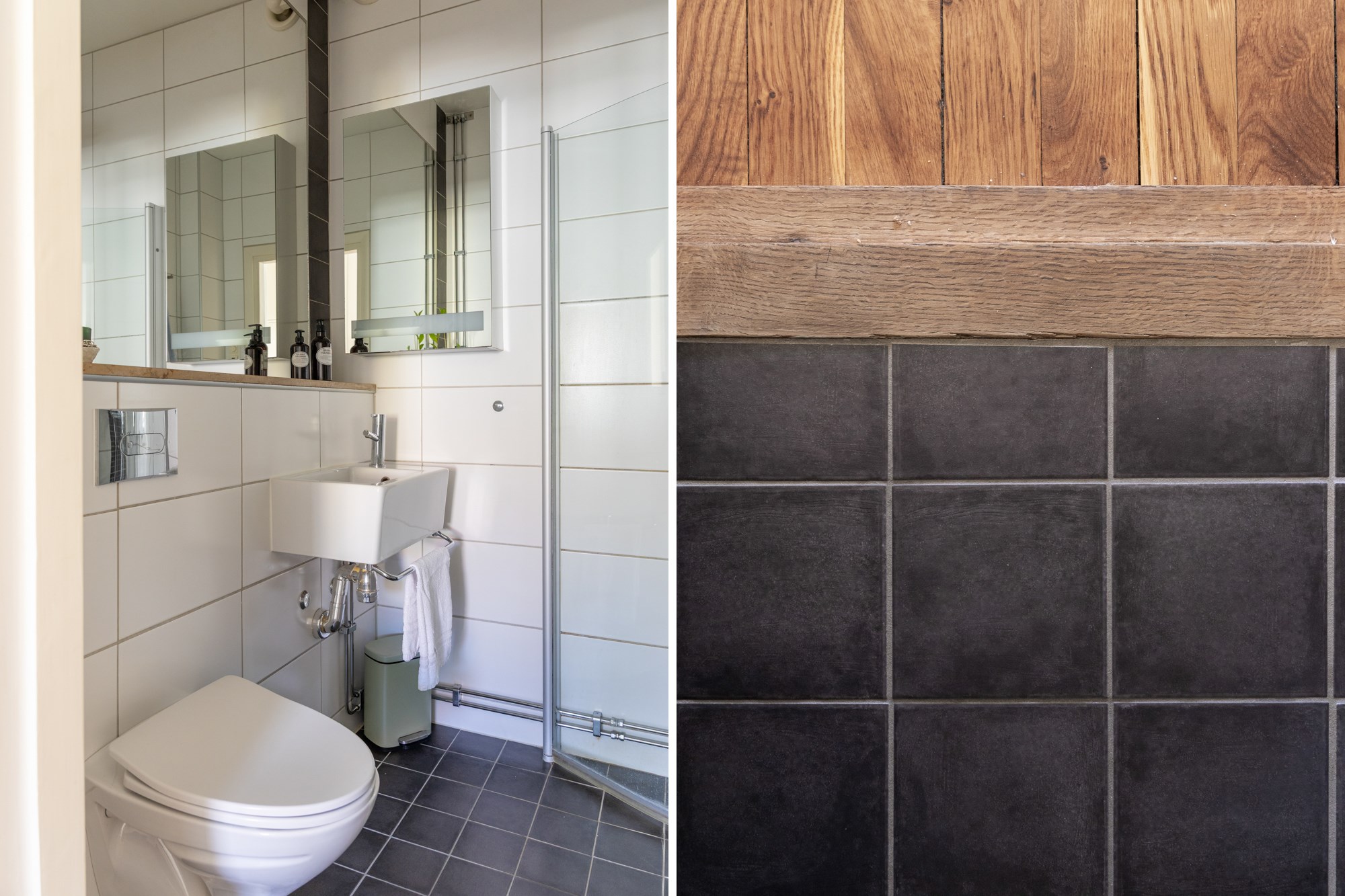 Helkaklat badrum. Grått klinker till golv och vita kaklade väggar. Utrustad med WC, handfat, stor spegel och dusch.