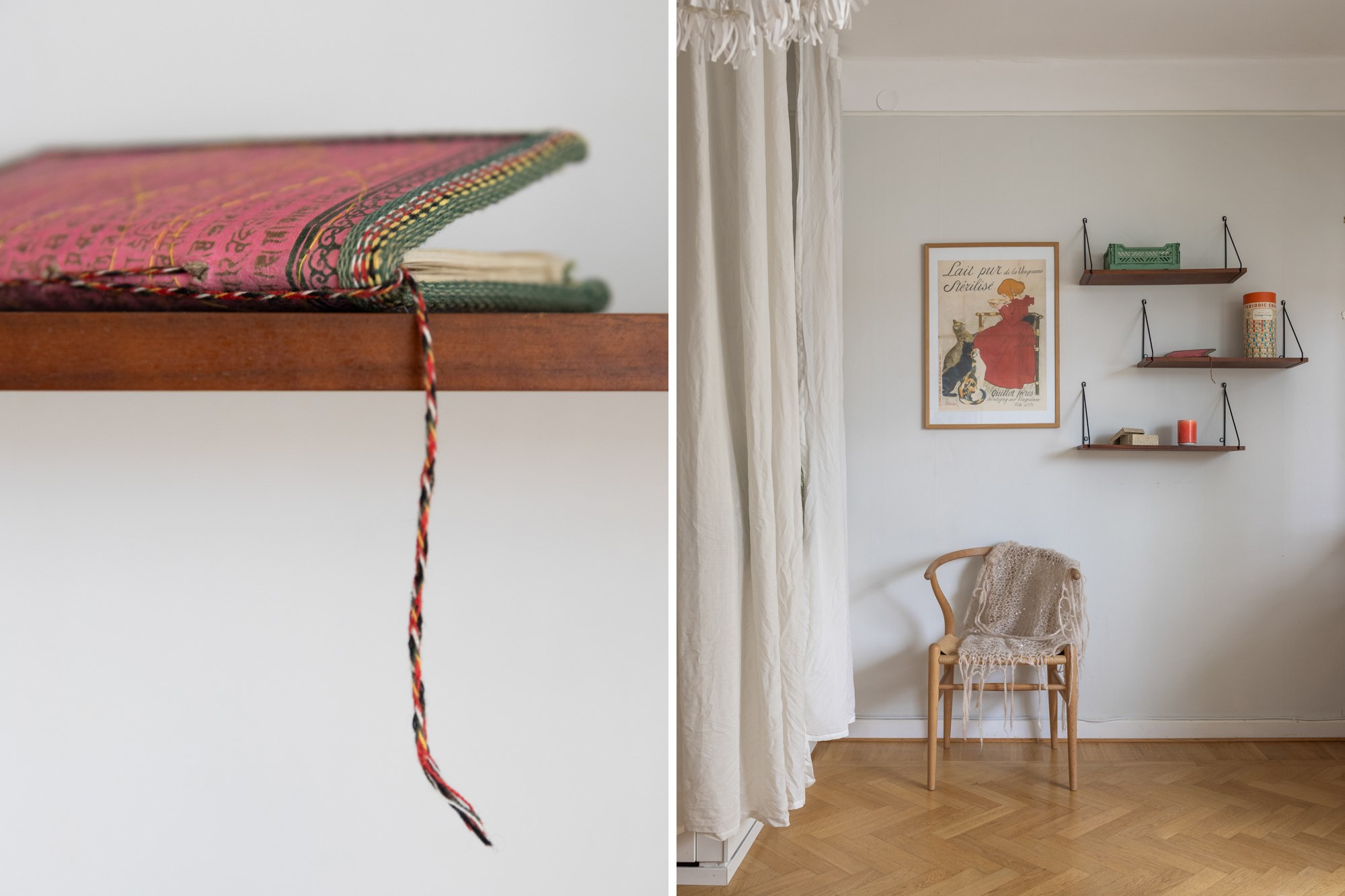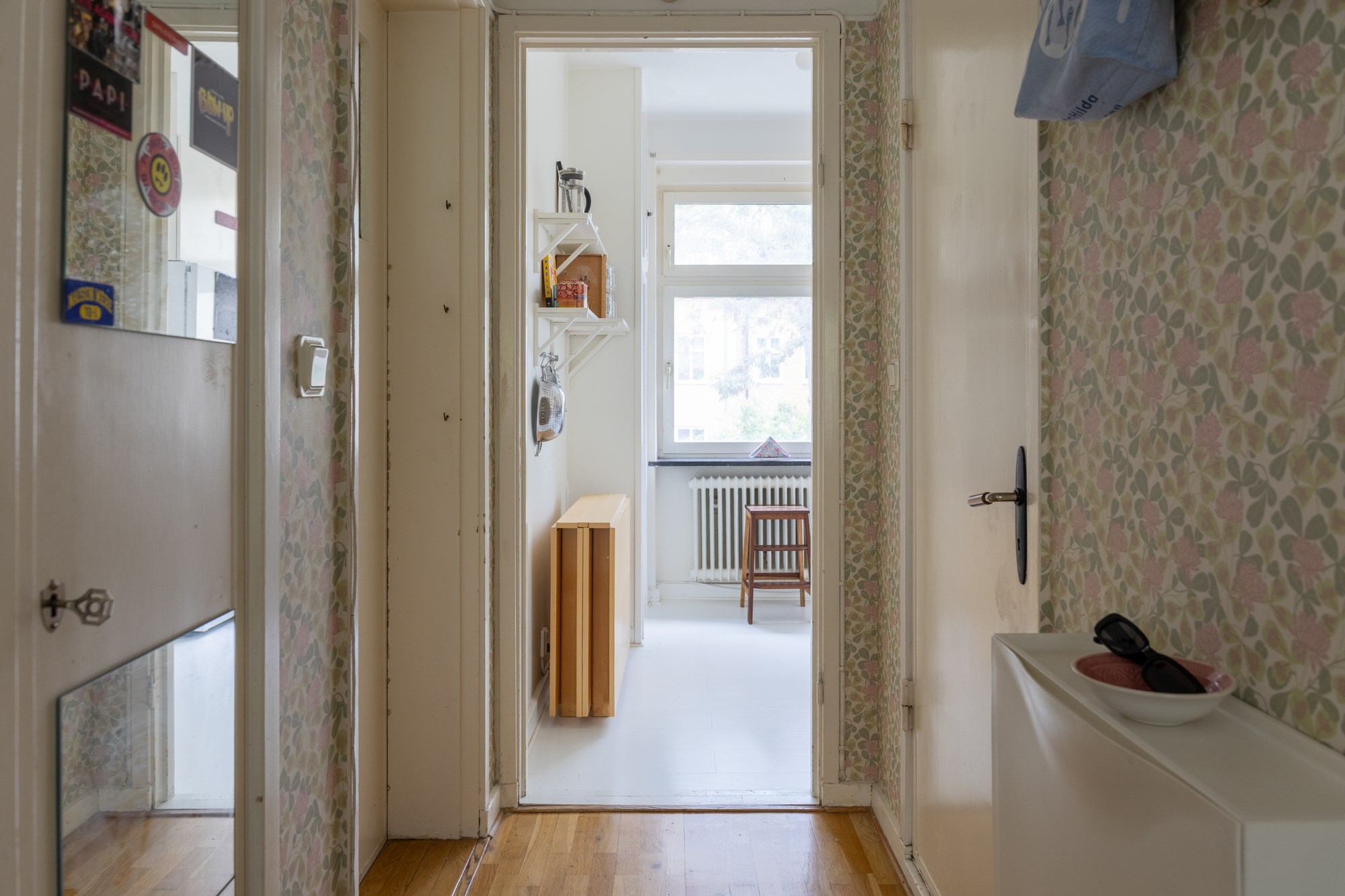 Parkettgolv och mönstrad tapet. Plats för avhängning. Här finns även en mindre inbyggd garderob.