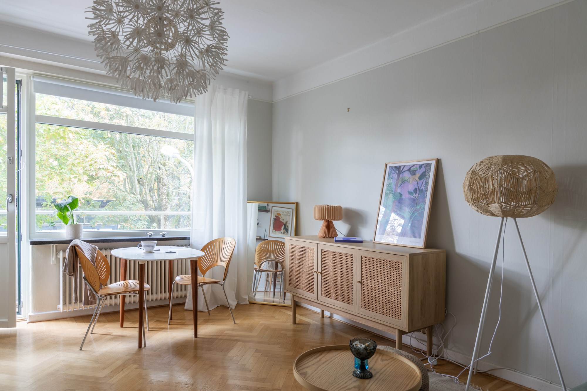 Fiskbensparkett och ljusa väggar. Rymligt och socialt rum med plats för soffhörna samt matbord och stolar. Här finns även en platsbyggd säng med förvaring under. Stora fönsterpartier som ger ett härligt ljusinsläpp. I anslutning till rummet finns dessutom en balkong i söderläge mot allén.
