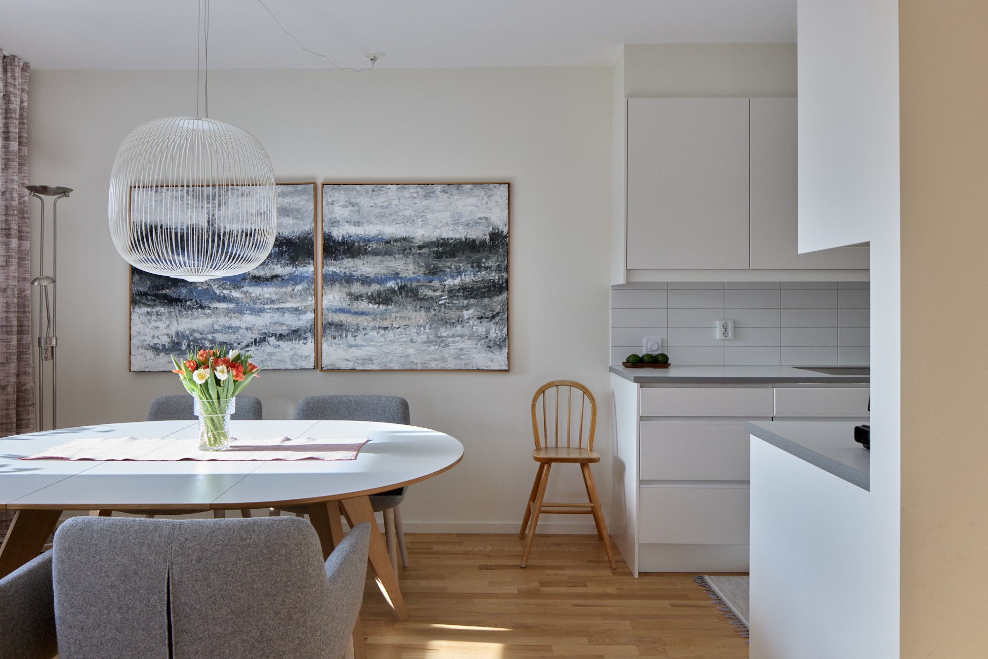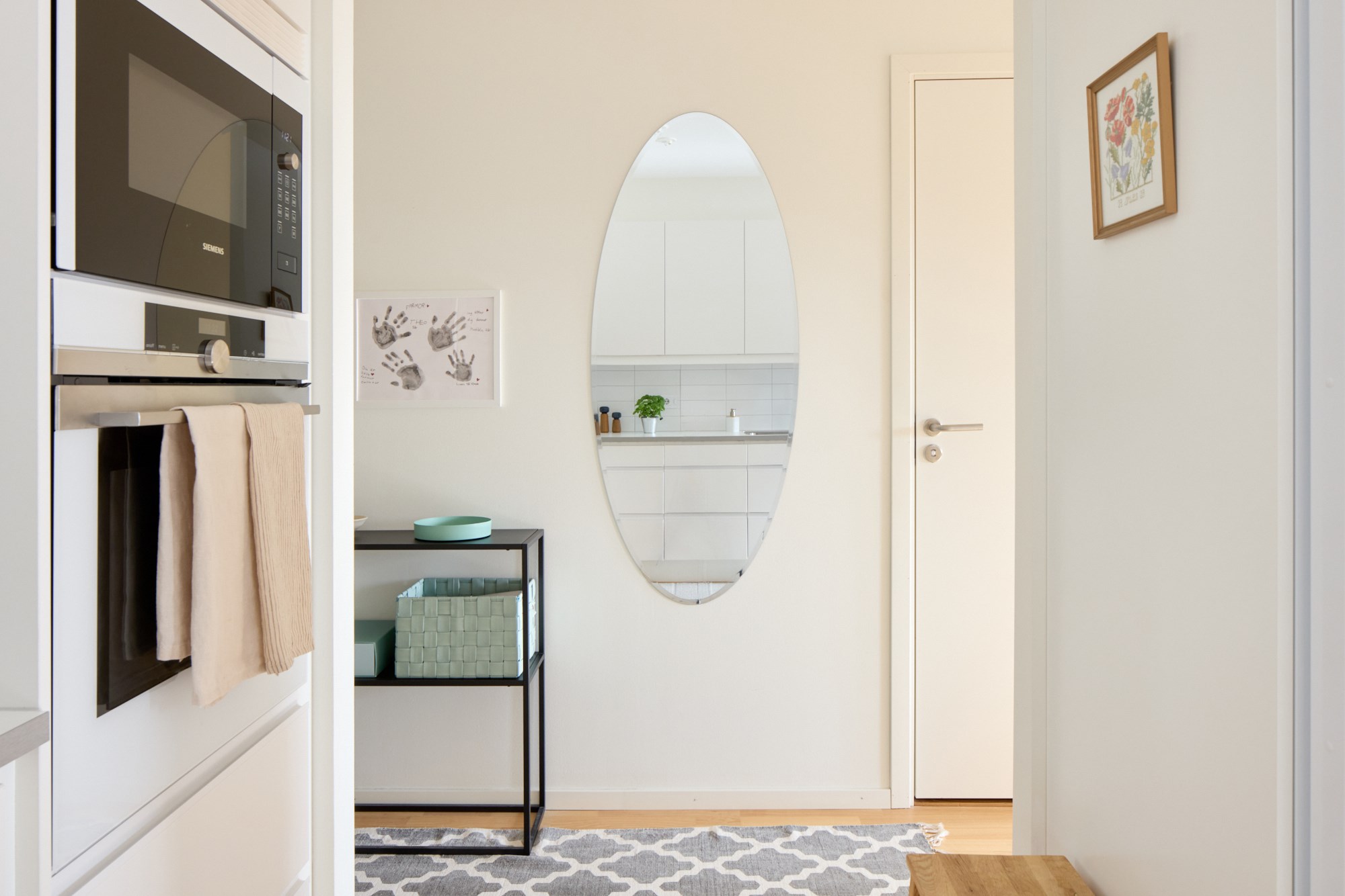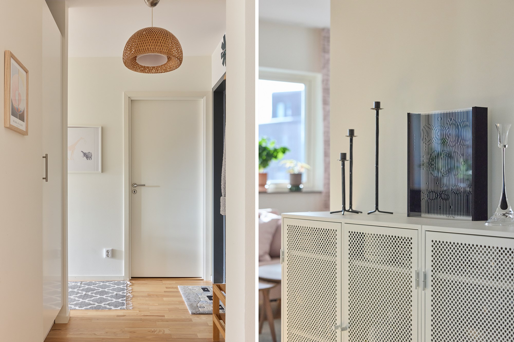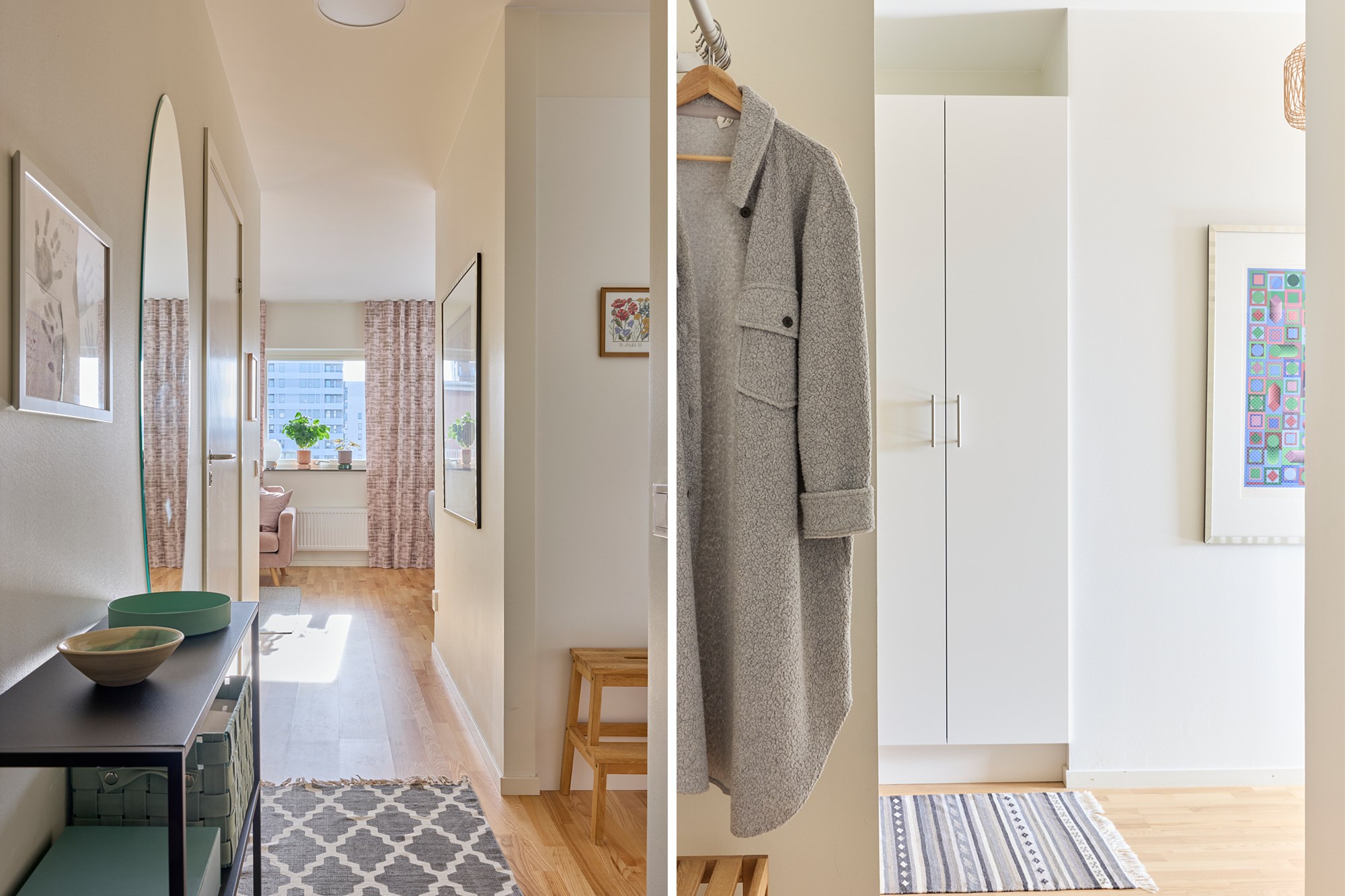 Parkettgolv och ljusa väggar. Plats för avhängning. Garderobförvaring.