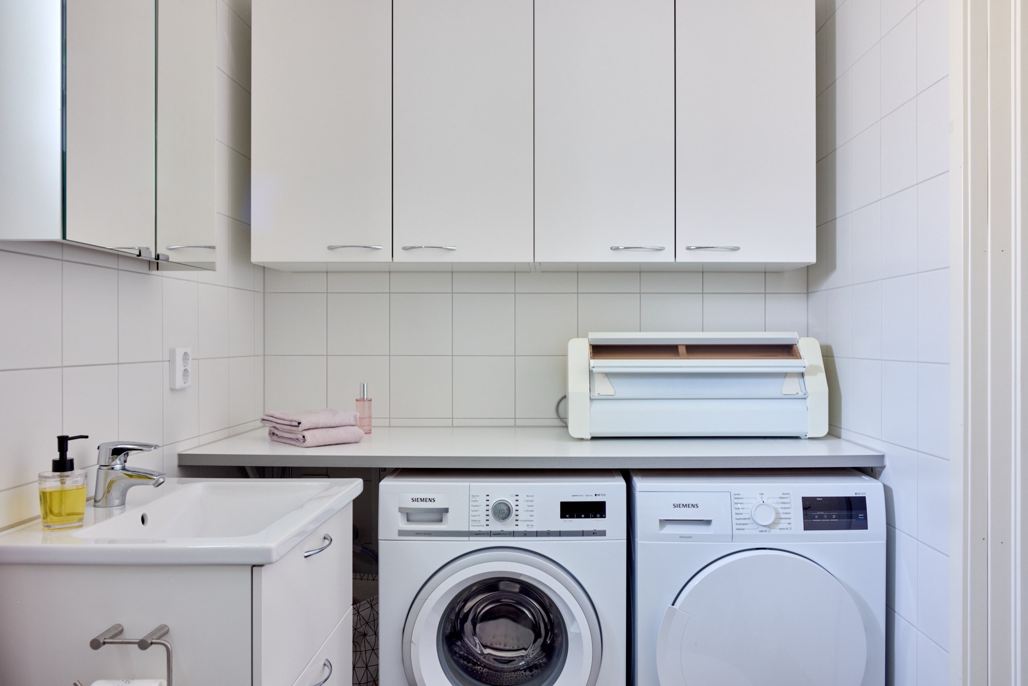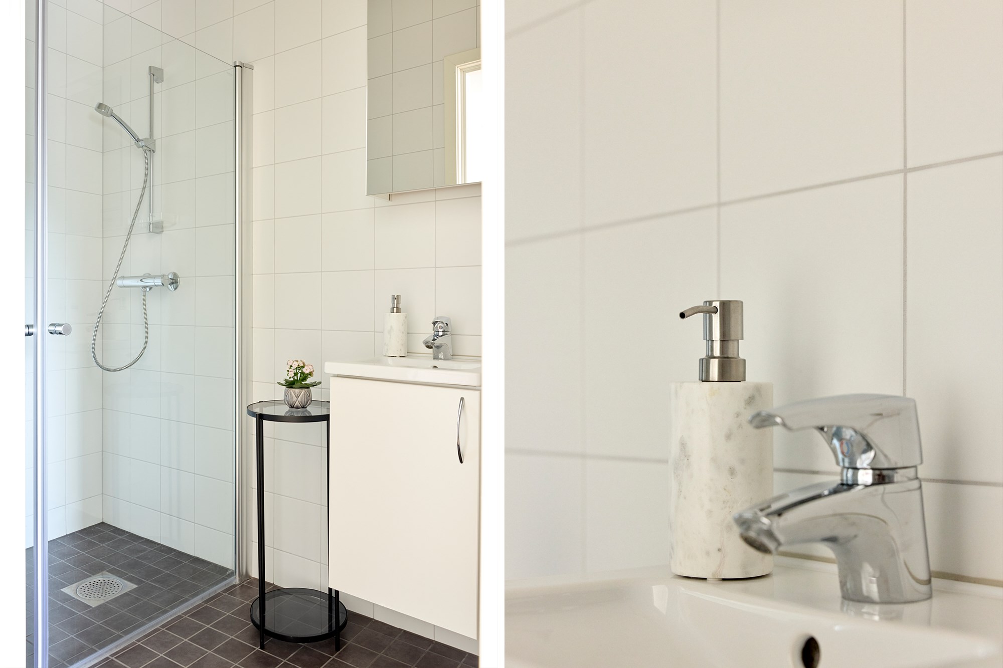 Helkaklat badrum. Grått klinker till golv och vita kaklade väggar. Utrustad med WC, handfat med vit kommod, spegelskåp, dusch, handdukstork, tvättmaskin och torktumlare.