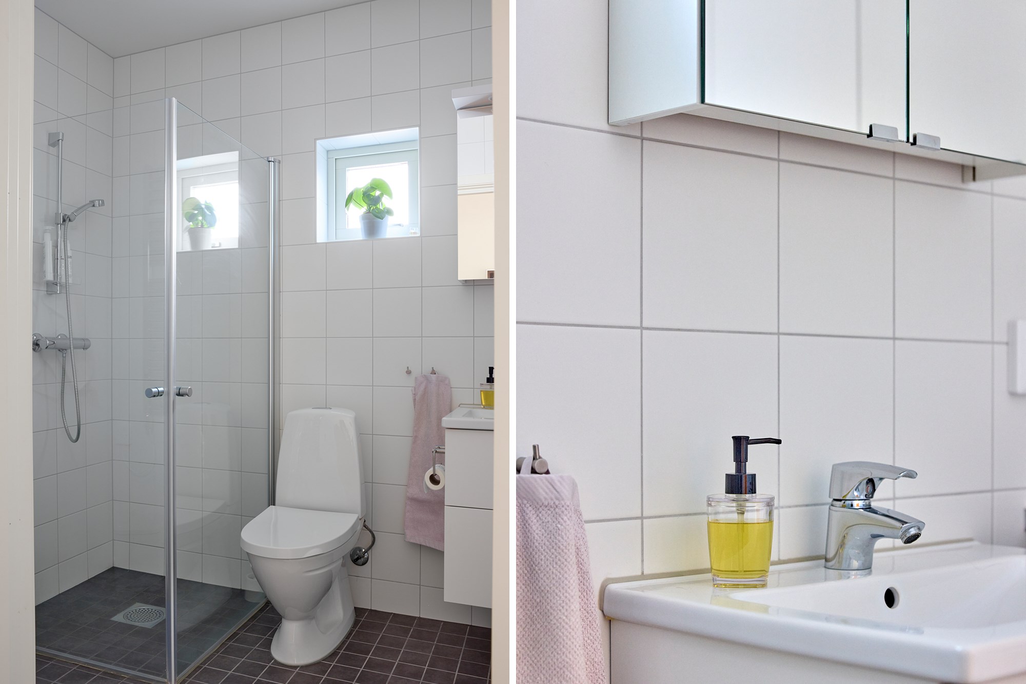Helkaklat badrum. Grått kakel till golv och vita kaklade väggar. Handfat, WC och dusch. Handdukstork.