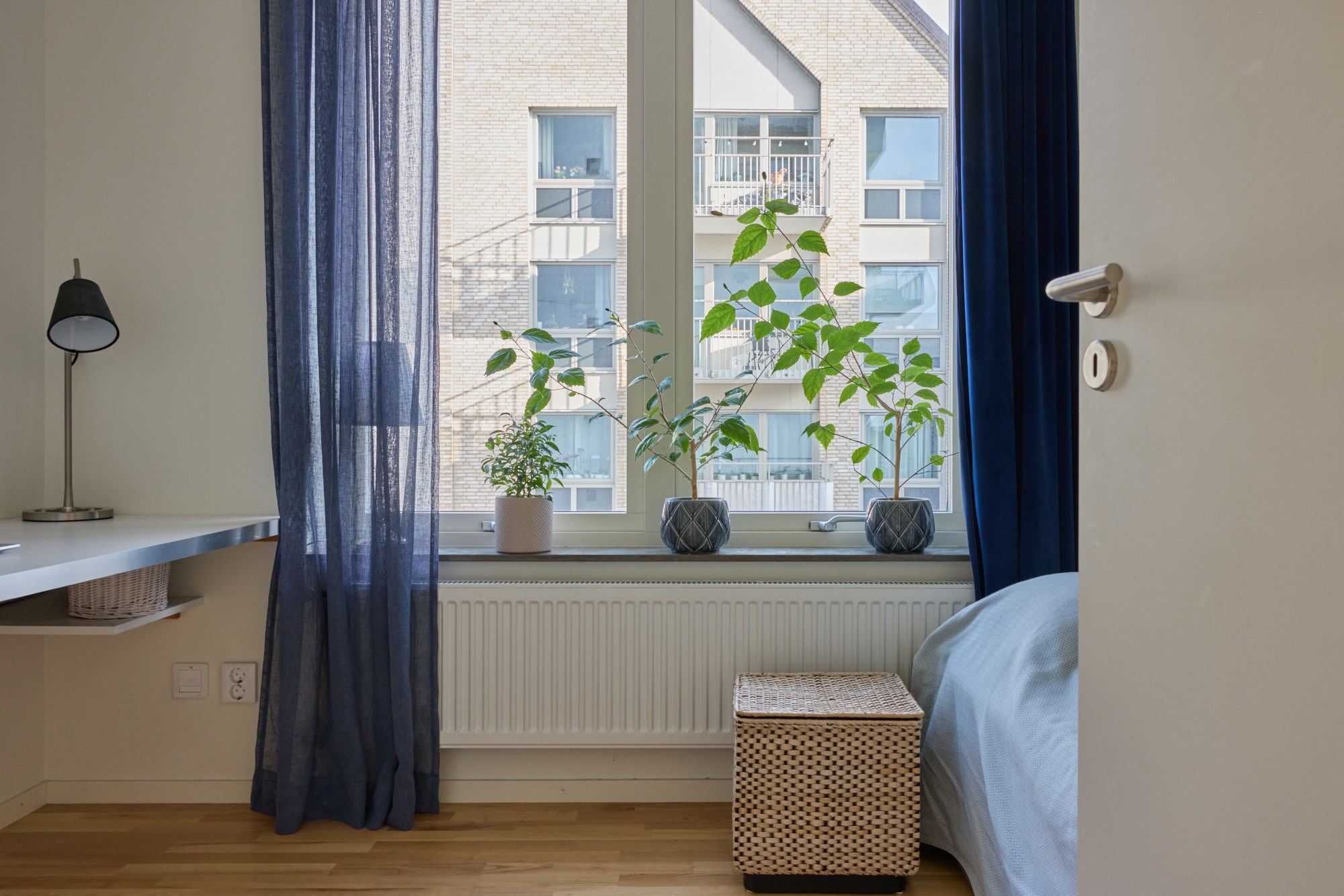 Parkettgolv och ljusa väggar. Garderobsförvaring.
