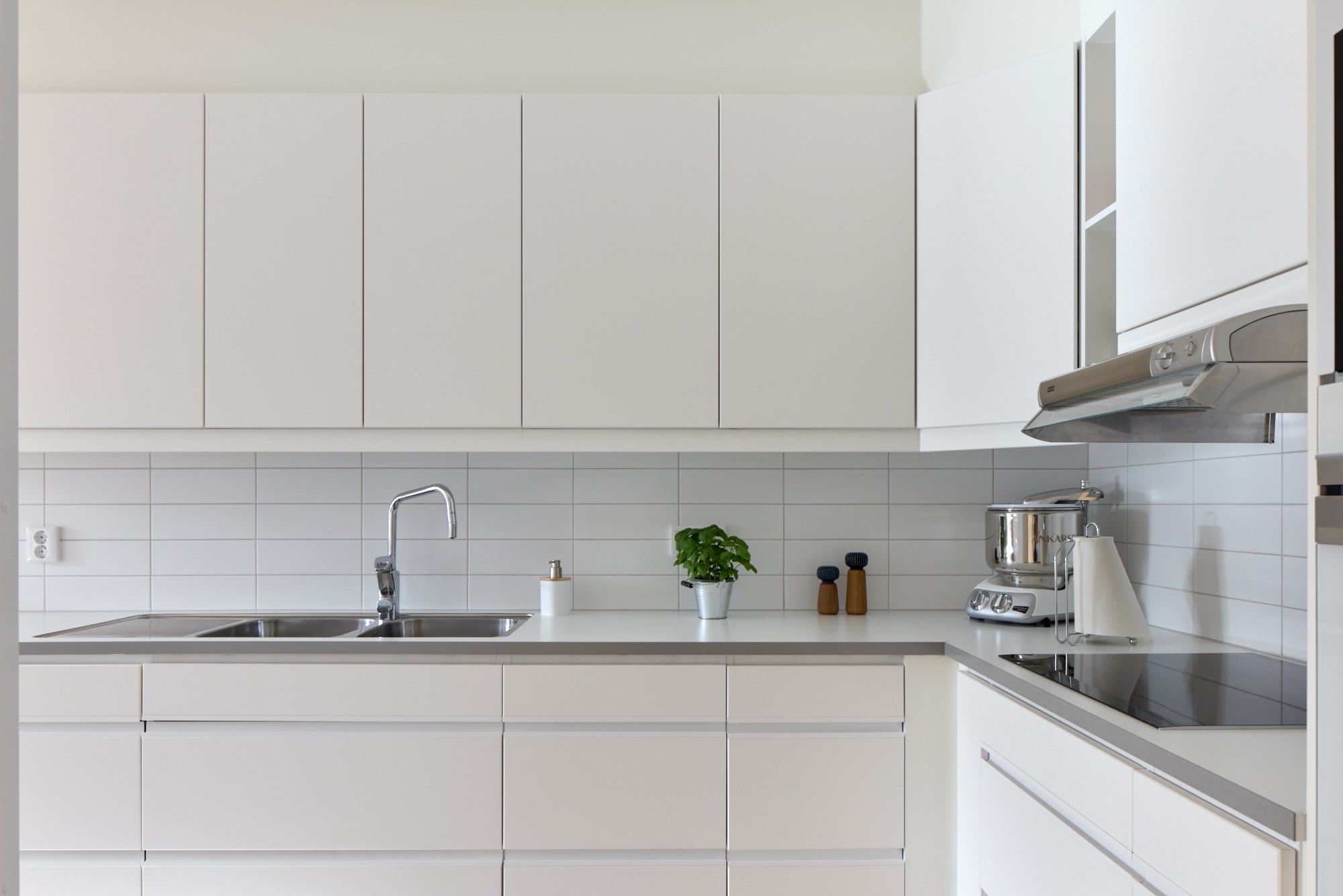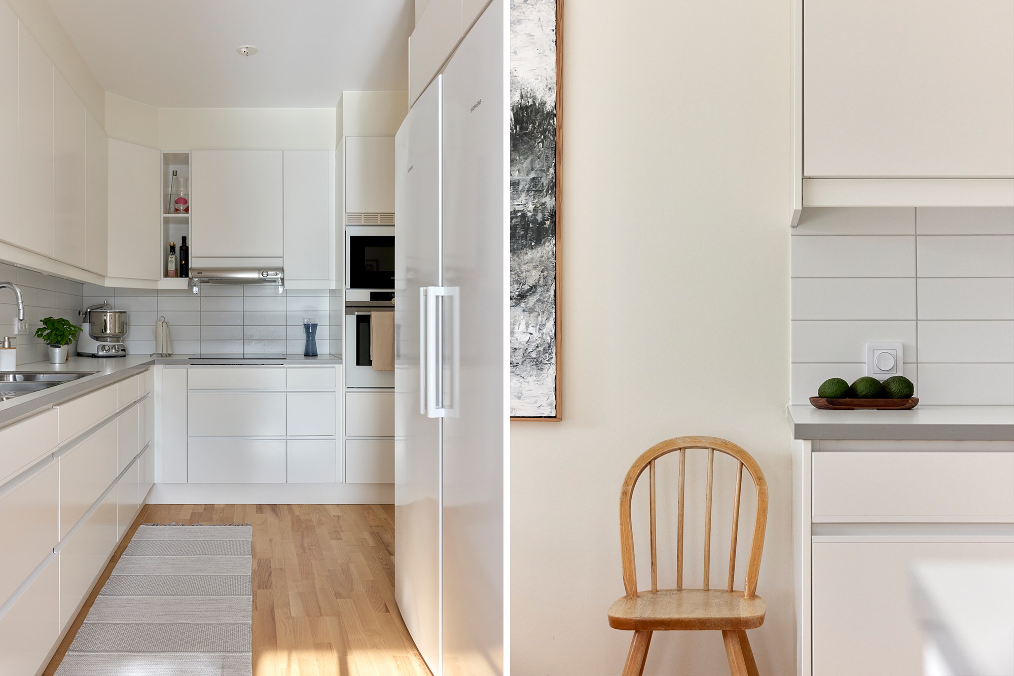 Parkettgolv och ljusa väggar. Vit köksinredning. Maskinell utrustning i form av induktionshäll och fläkt, ugn, integrerad mikrovågsugn, diskmaskin, hel kyl och hel frys. Direkt anslutning till matplats.