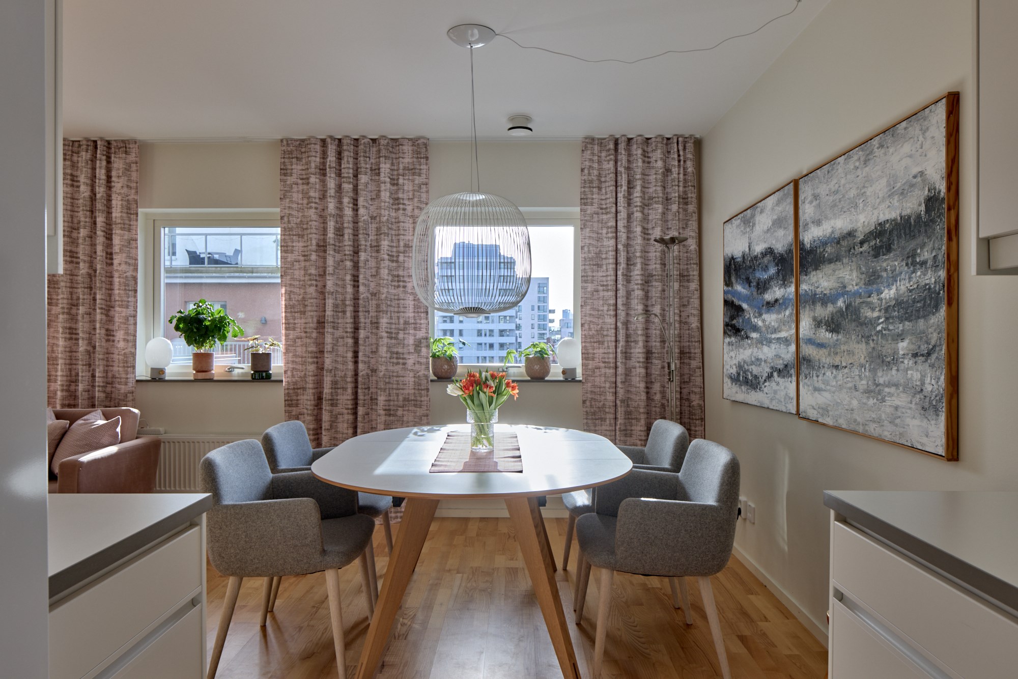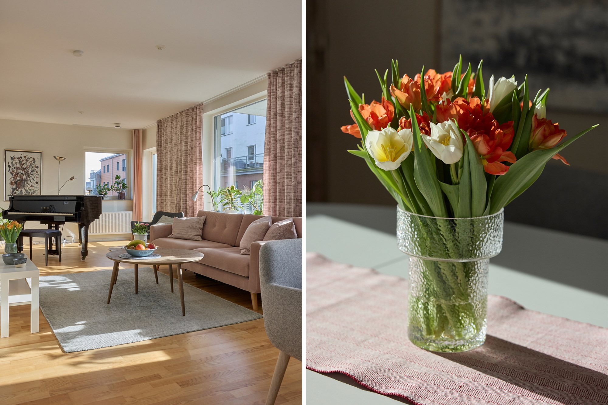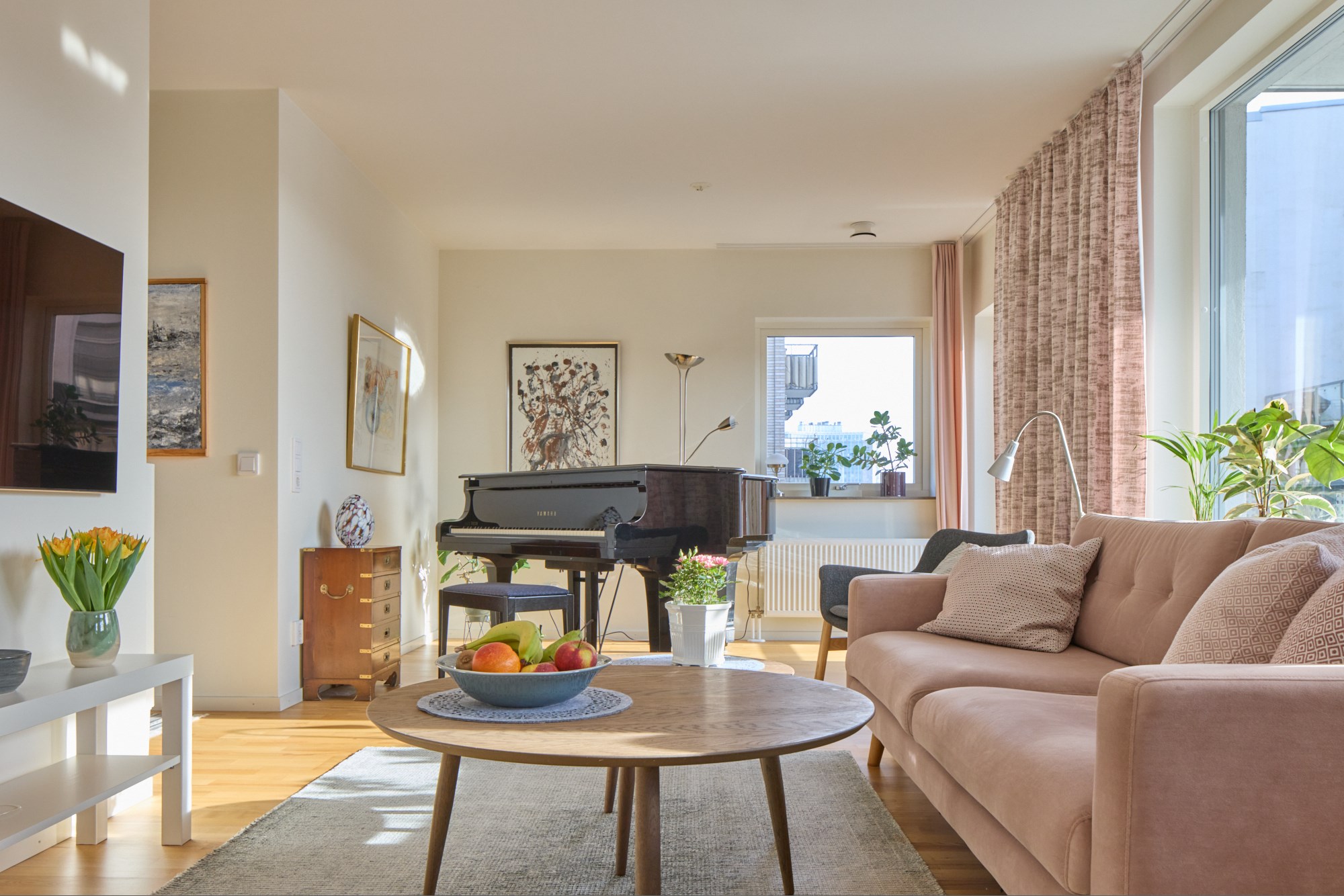 Parkettgolv och ljusa väggar. Plats för soffrupp och matplats. Utgång till balkong.