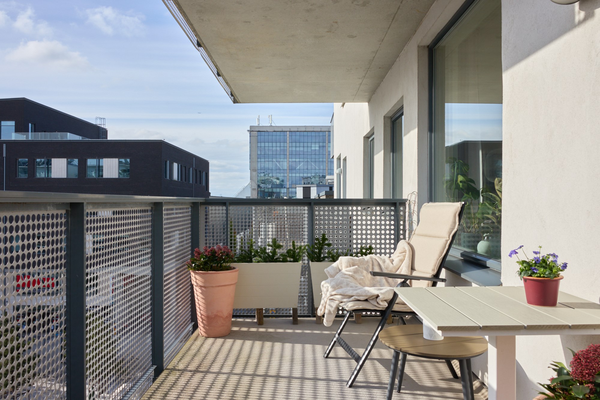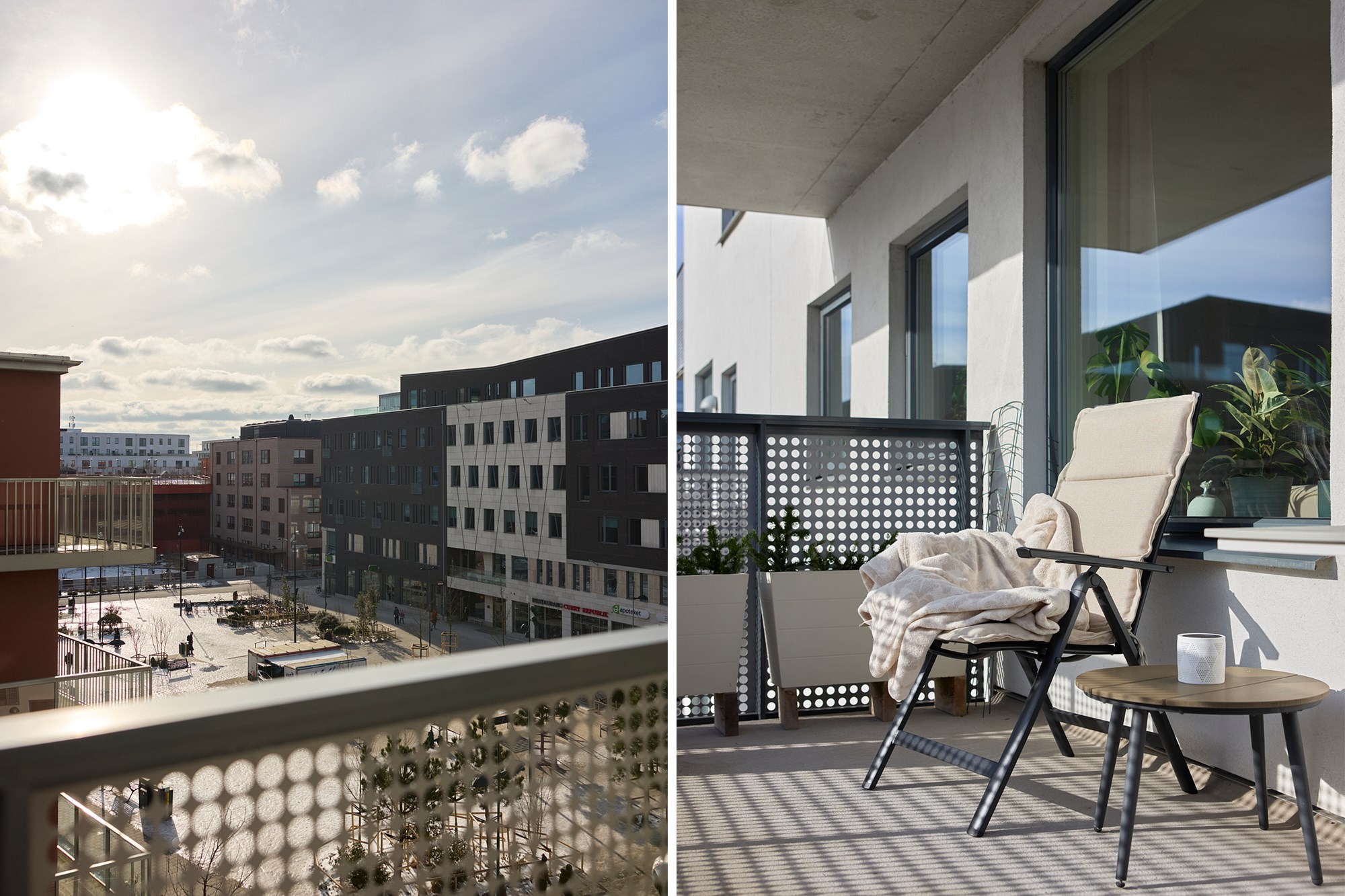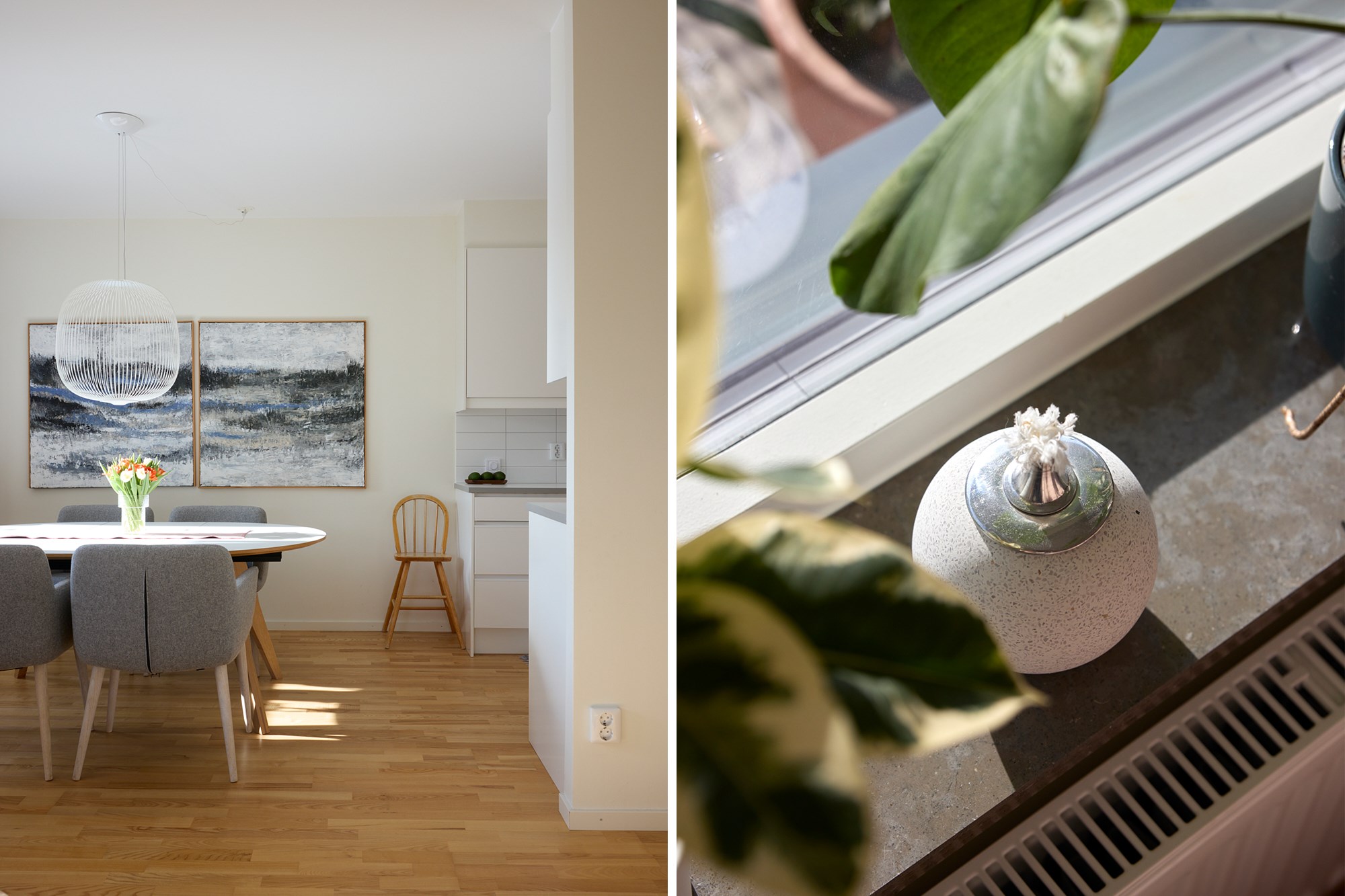 Parkettgolv och ljusa väggar. Plats för soffrupp och matplats. Utgång till balkong.