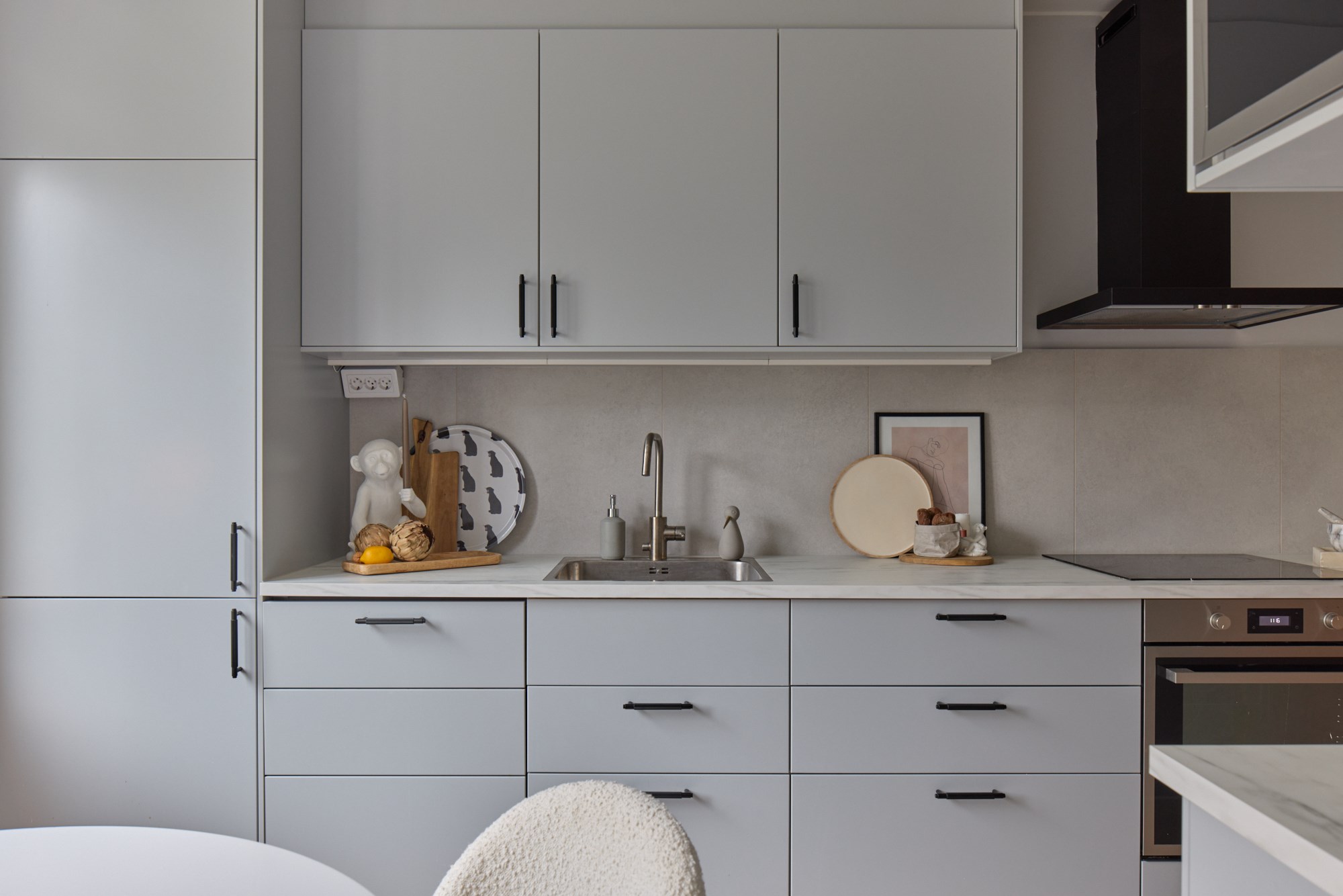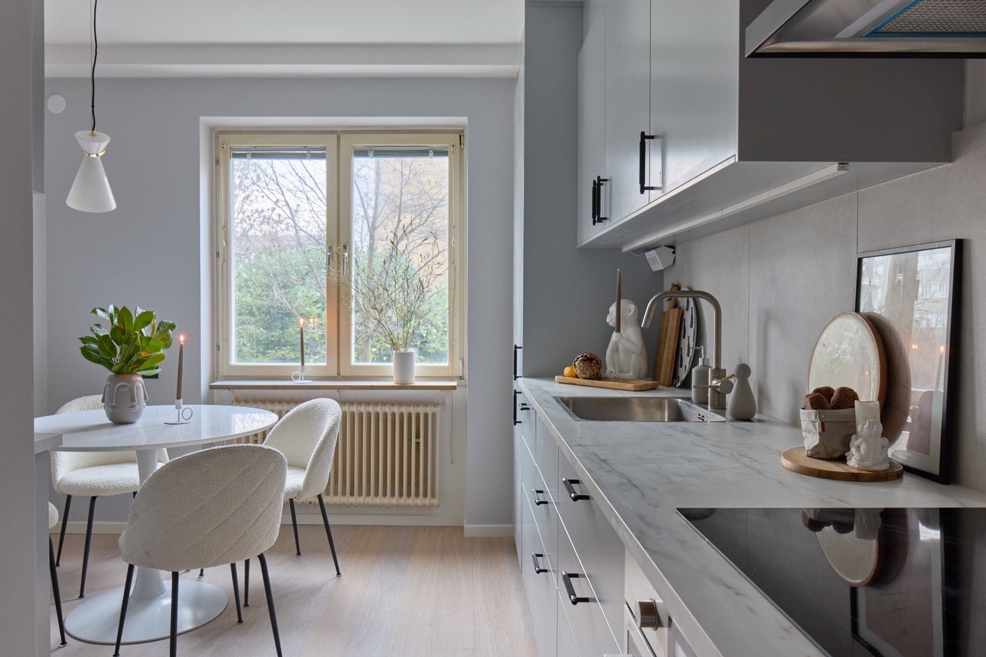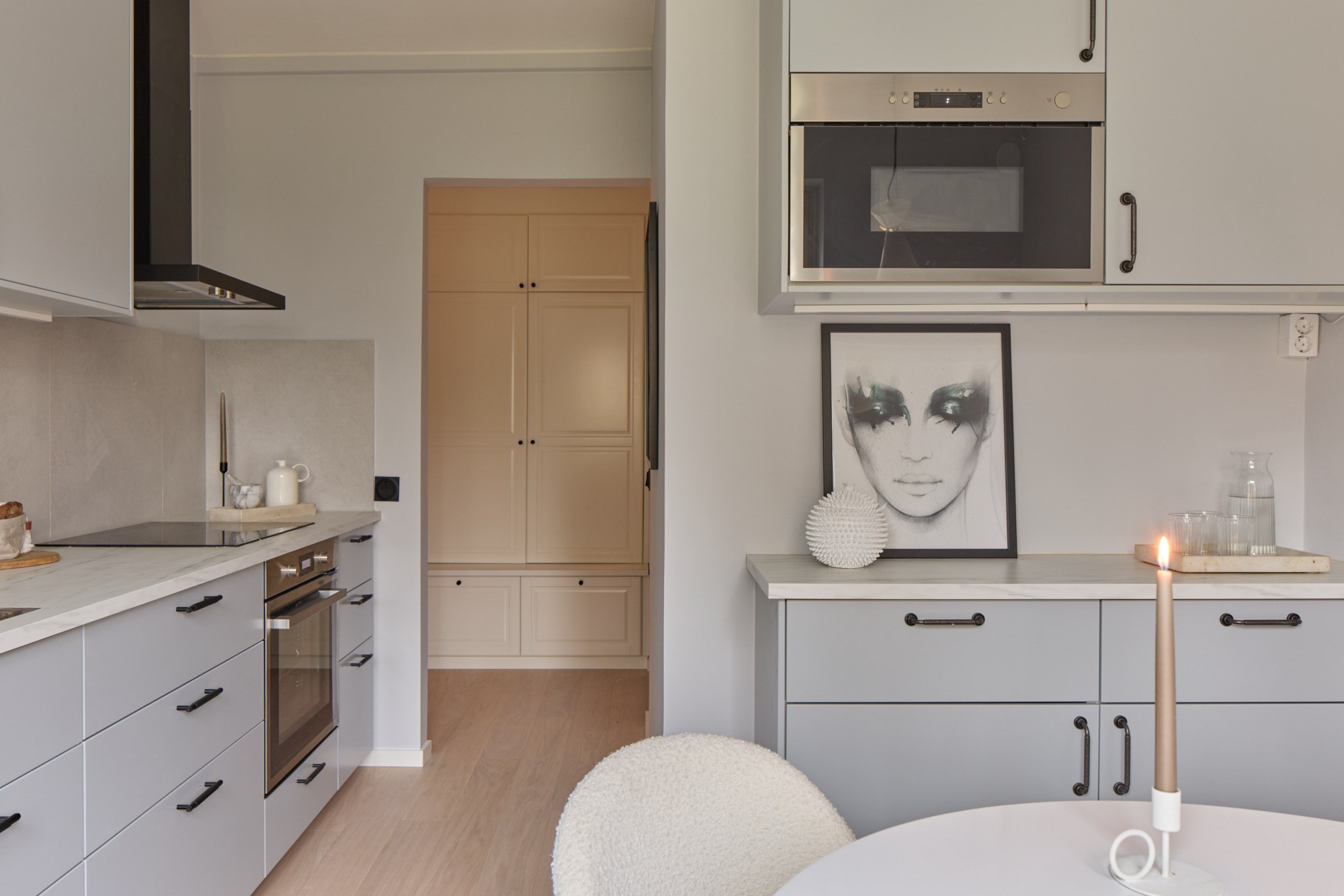 Vitpigmenterade parkett och ljusa väggar. Ljus köksinredning och bänkskiva i kalksten. Maskinell utrustning i form av spishäll, ugn, fläkt, kyl/frys, diskmaskin. Plats för matplats.