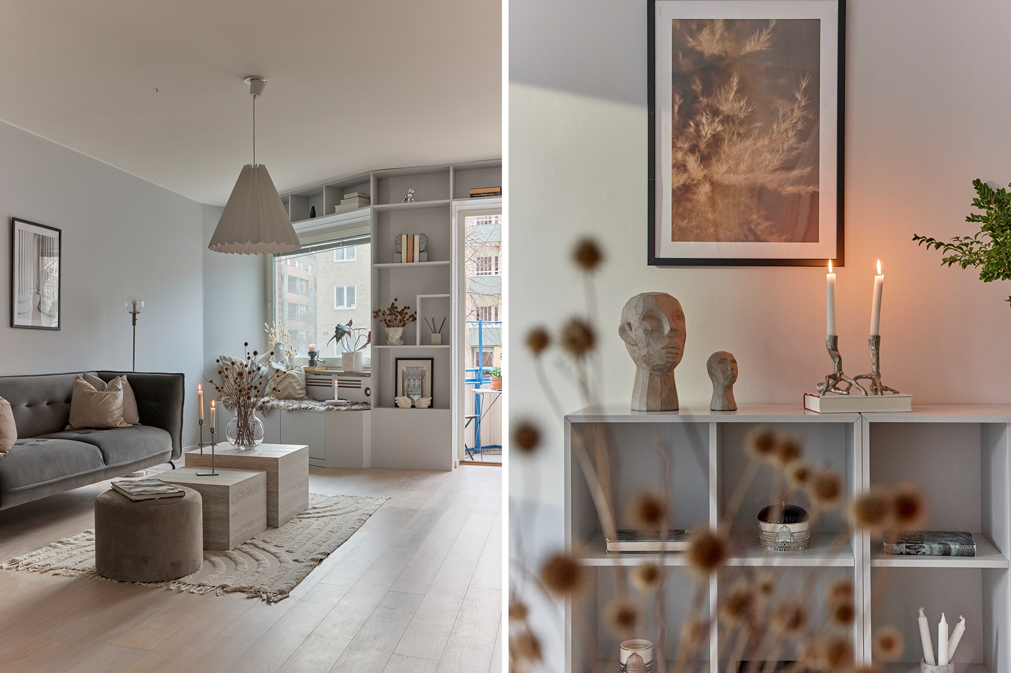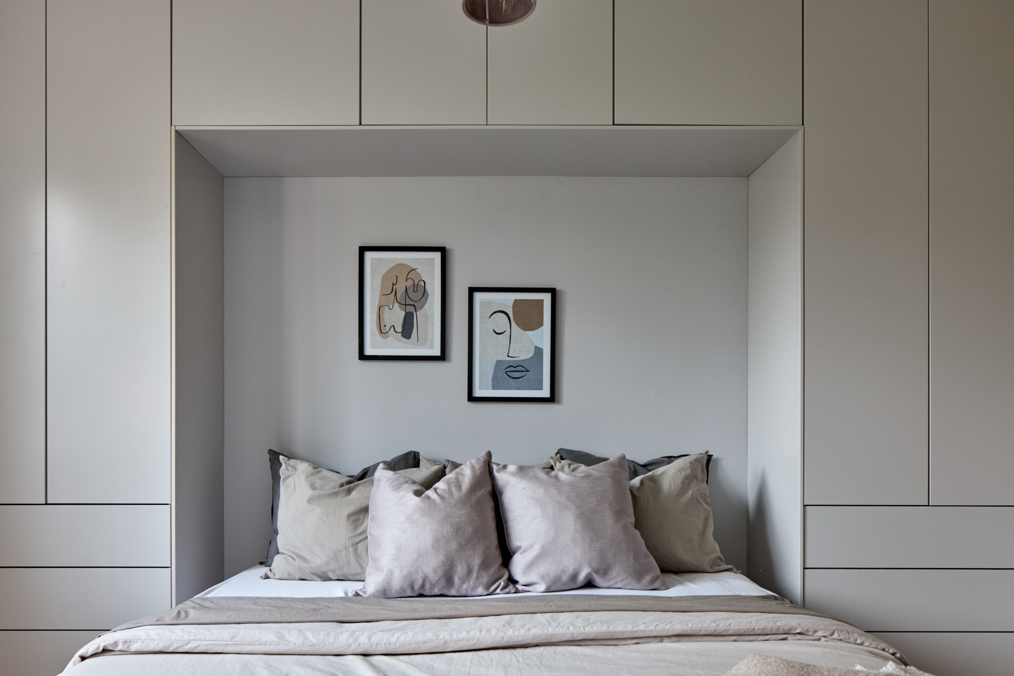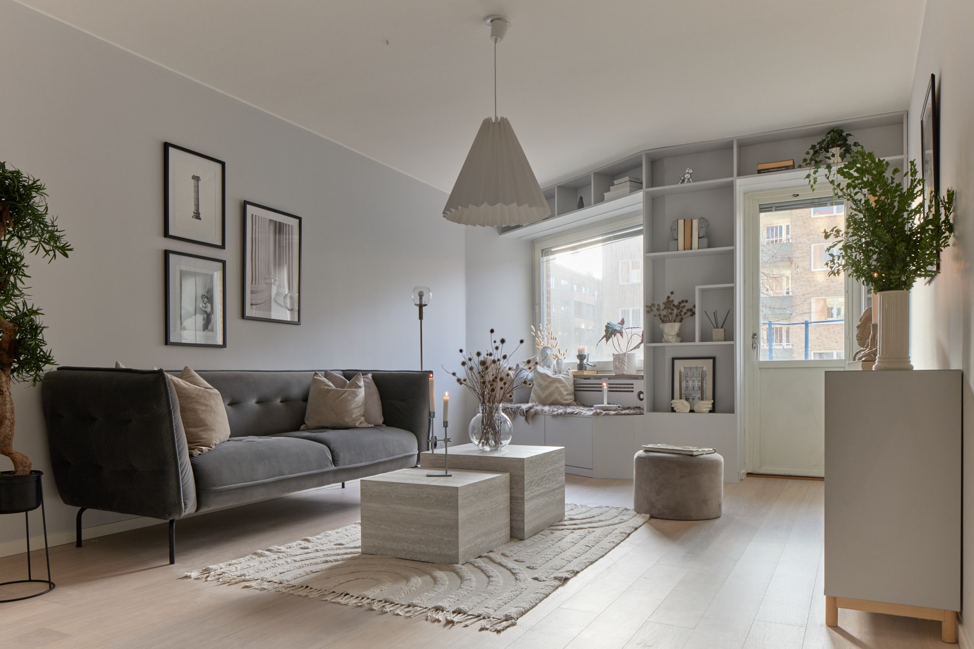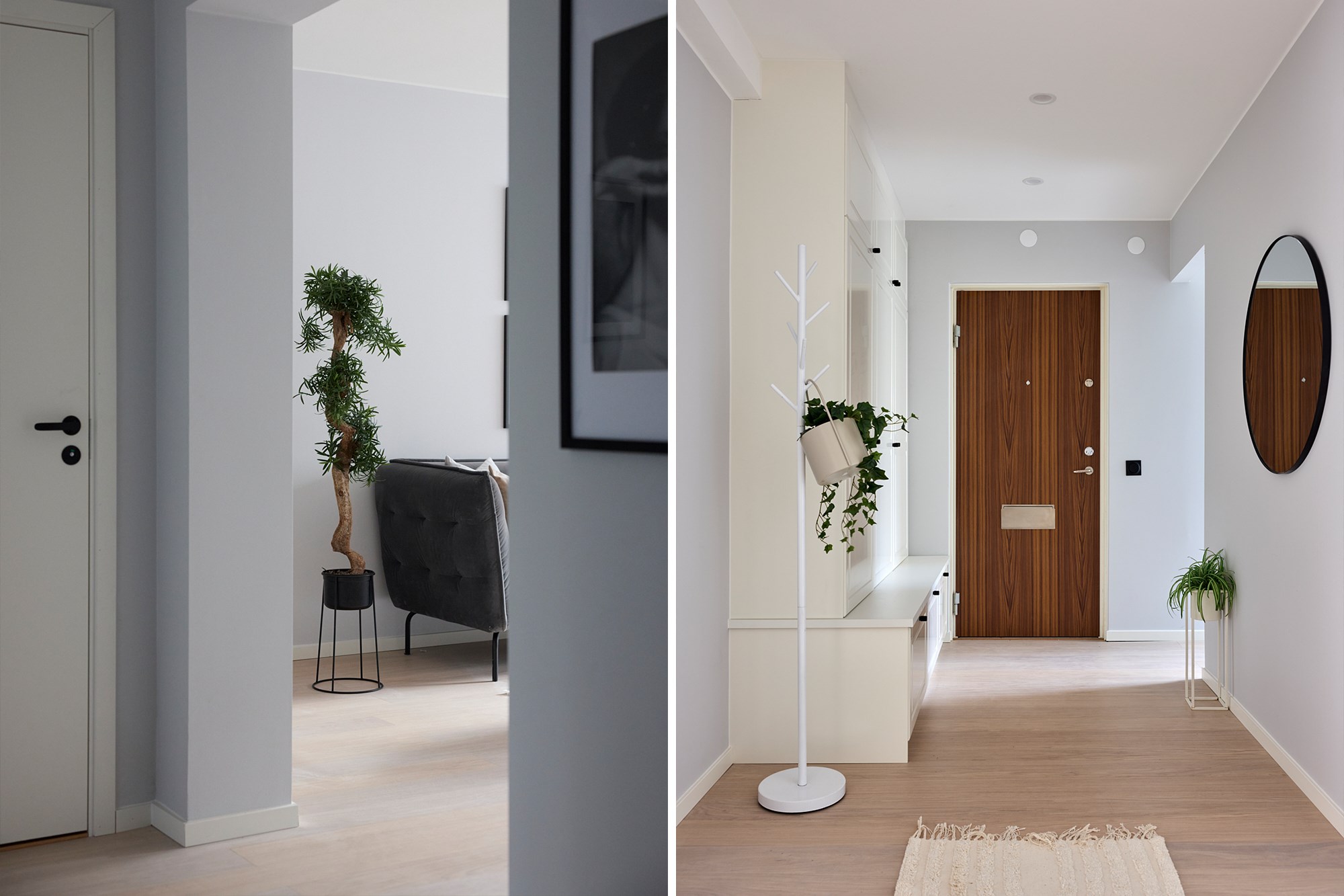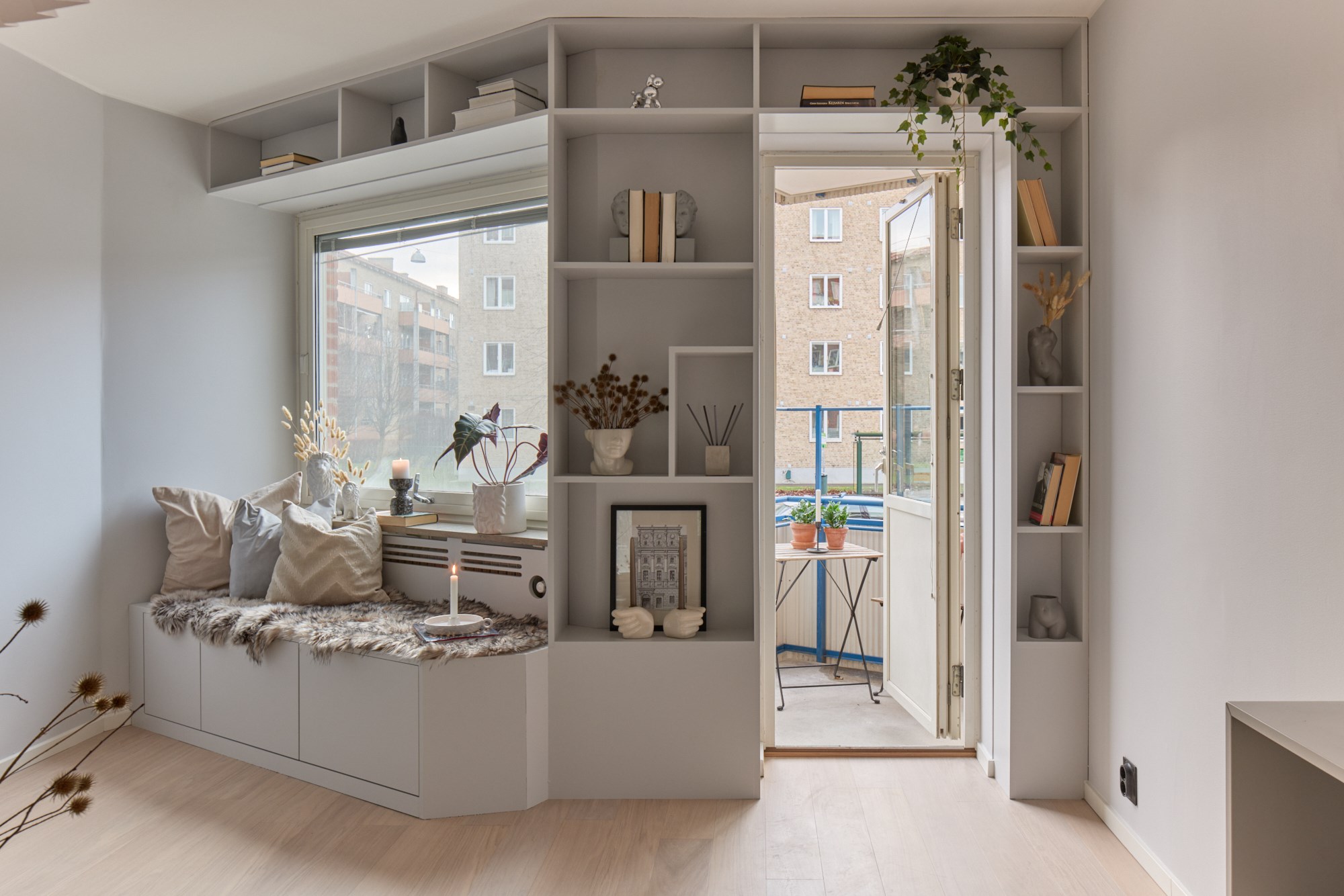 Vitpigmenterade parkett och ljusa väggar. Platsbyggd garderob.