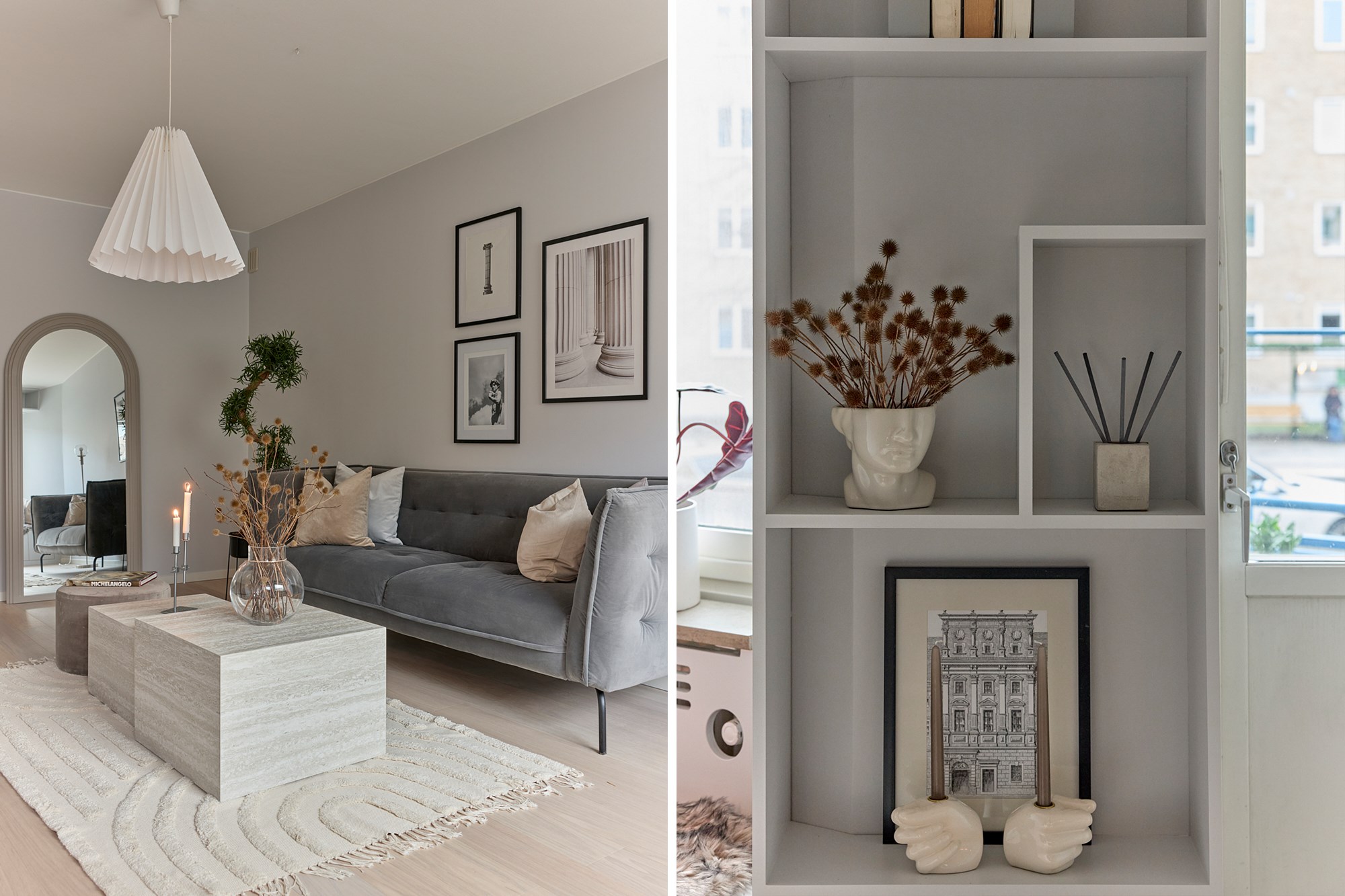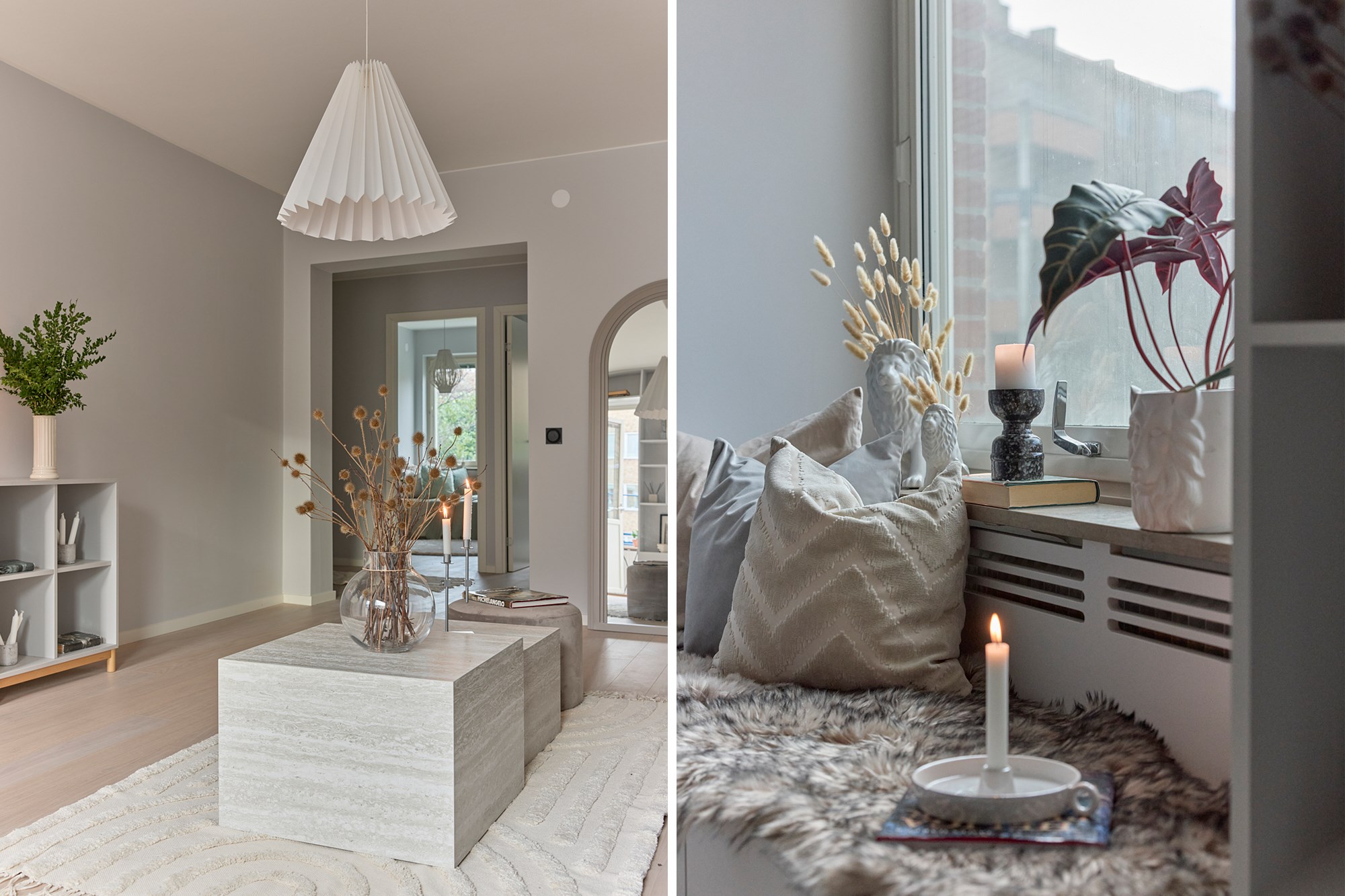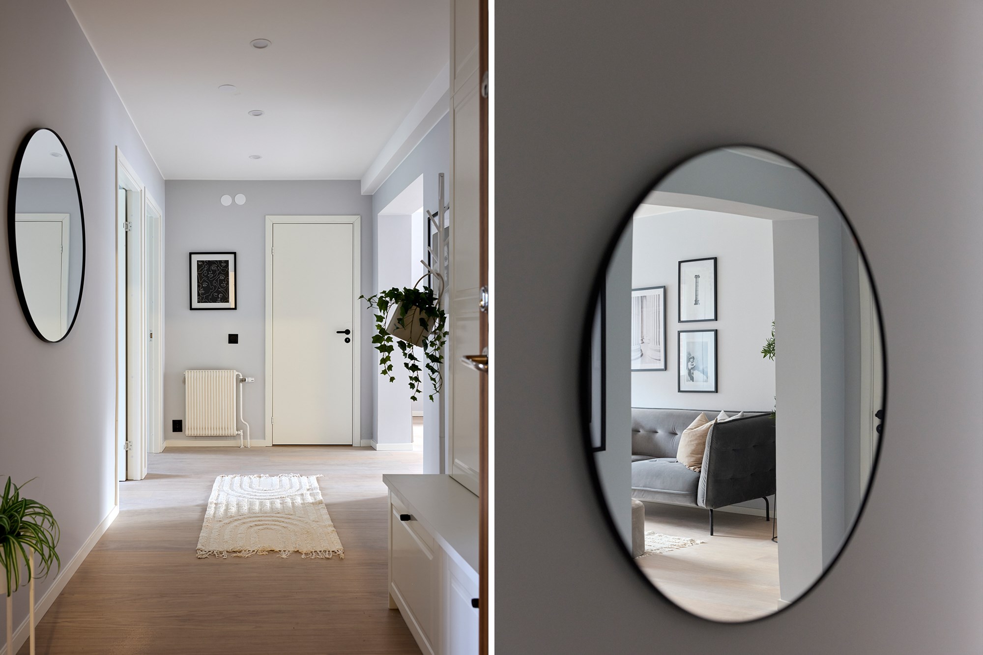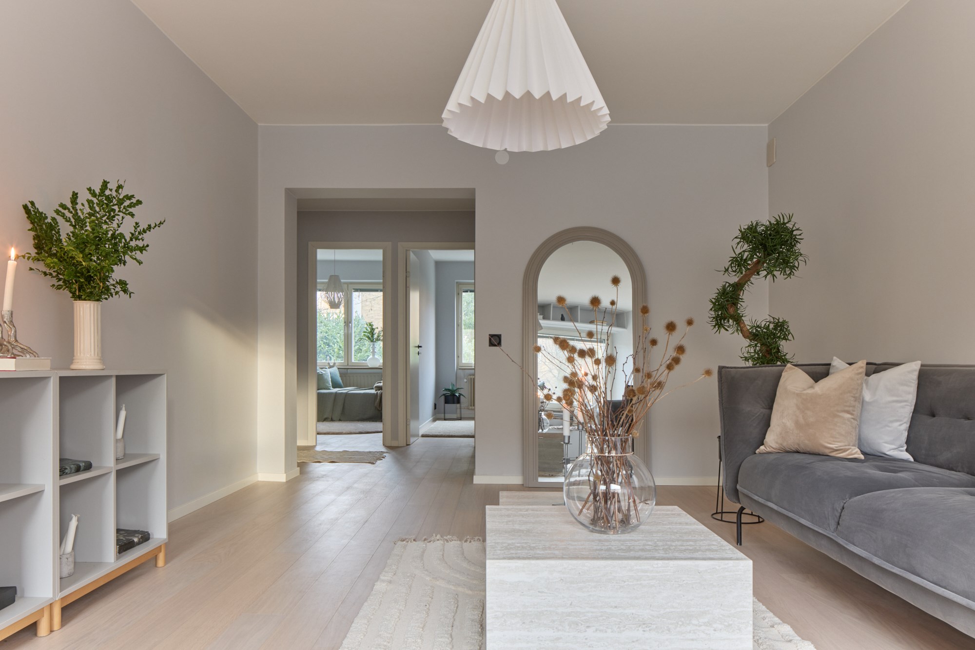 Vitpigmenterade parkett och ljusa väggar.