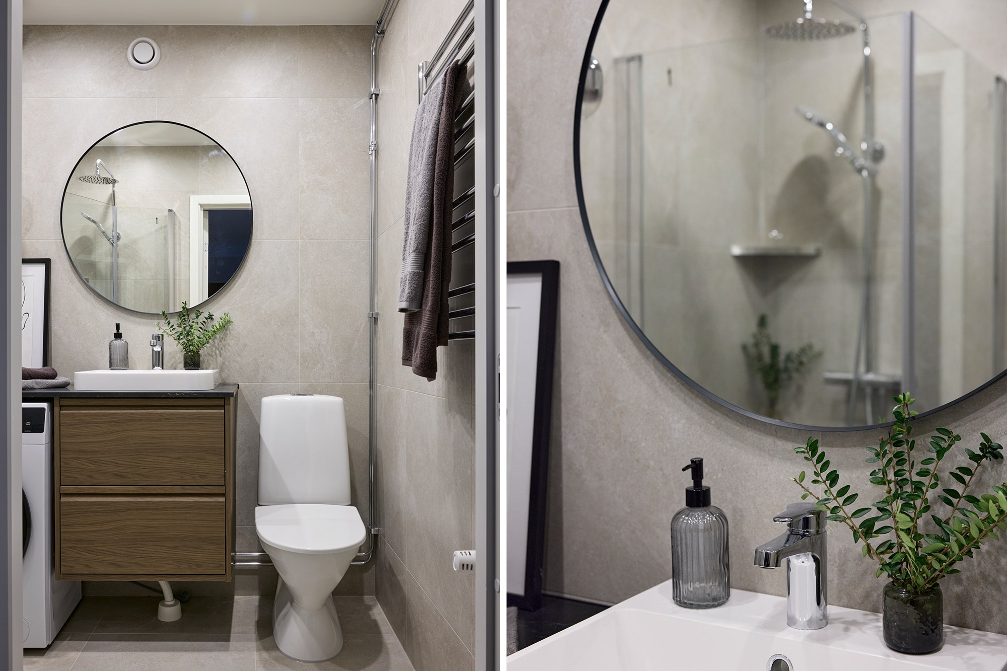 Helkaklat badrum med WC, handdukstork, handfat med kommod, tvättmaskin samt dusch med glasvägg.