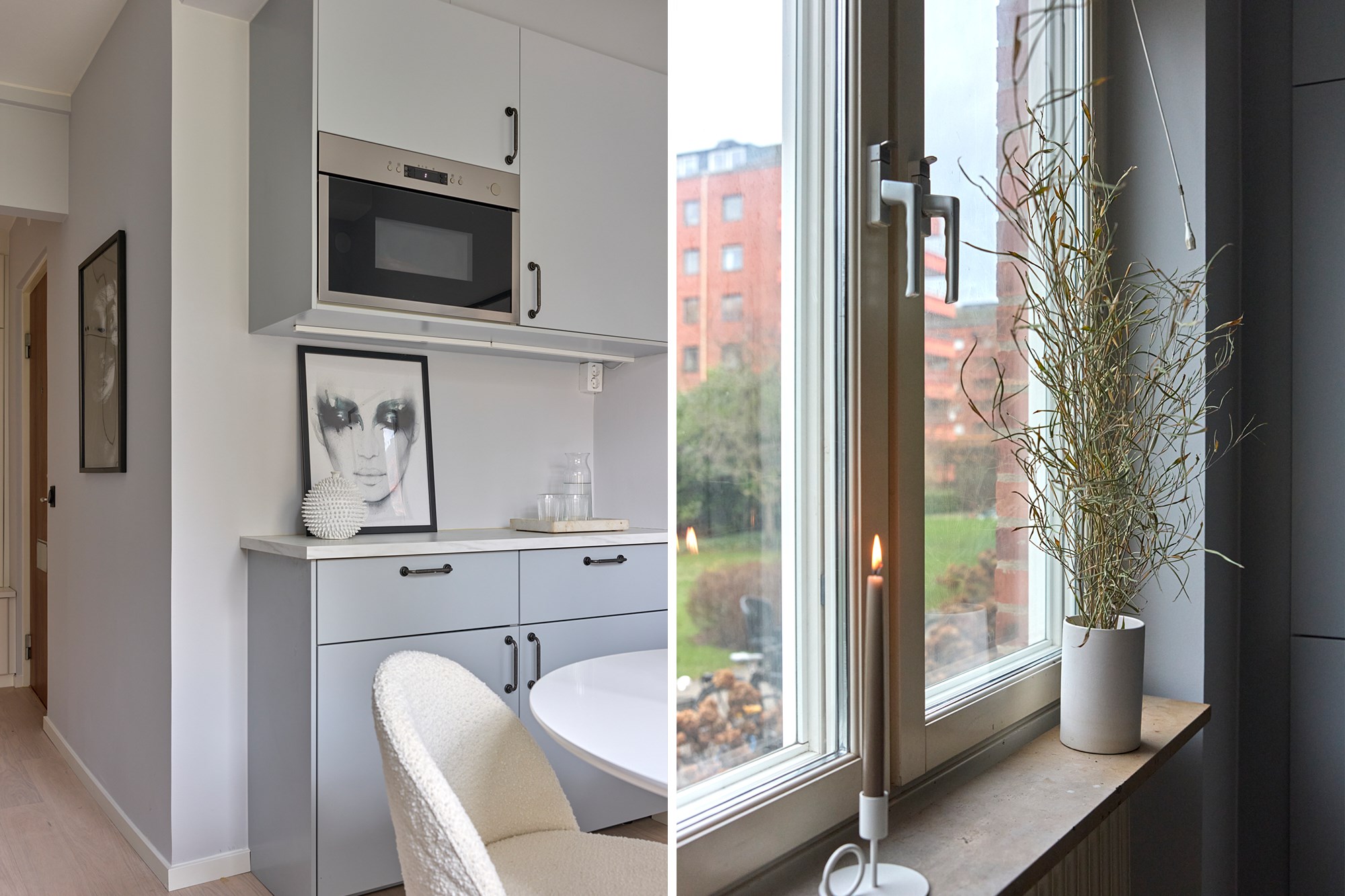 Vitpigmenterade parkett och ljusa väggar. Goda avhängsningsmöjligheter i platsbyggd garderob.