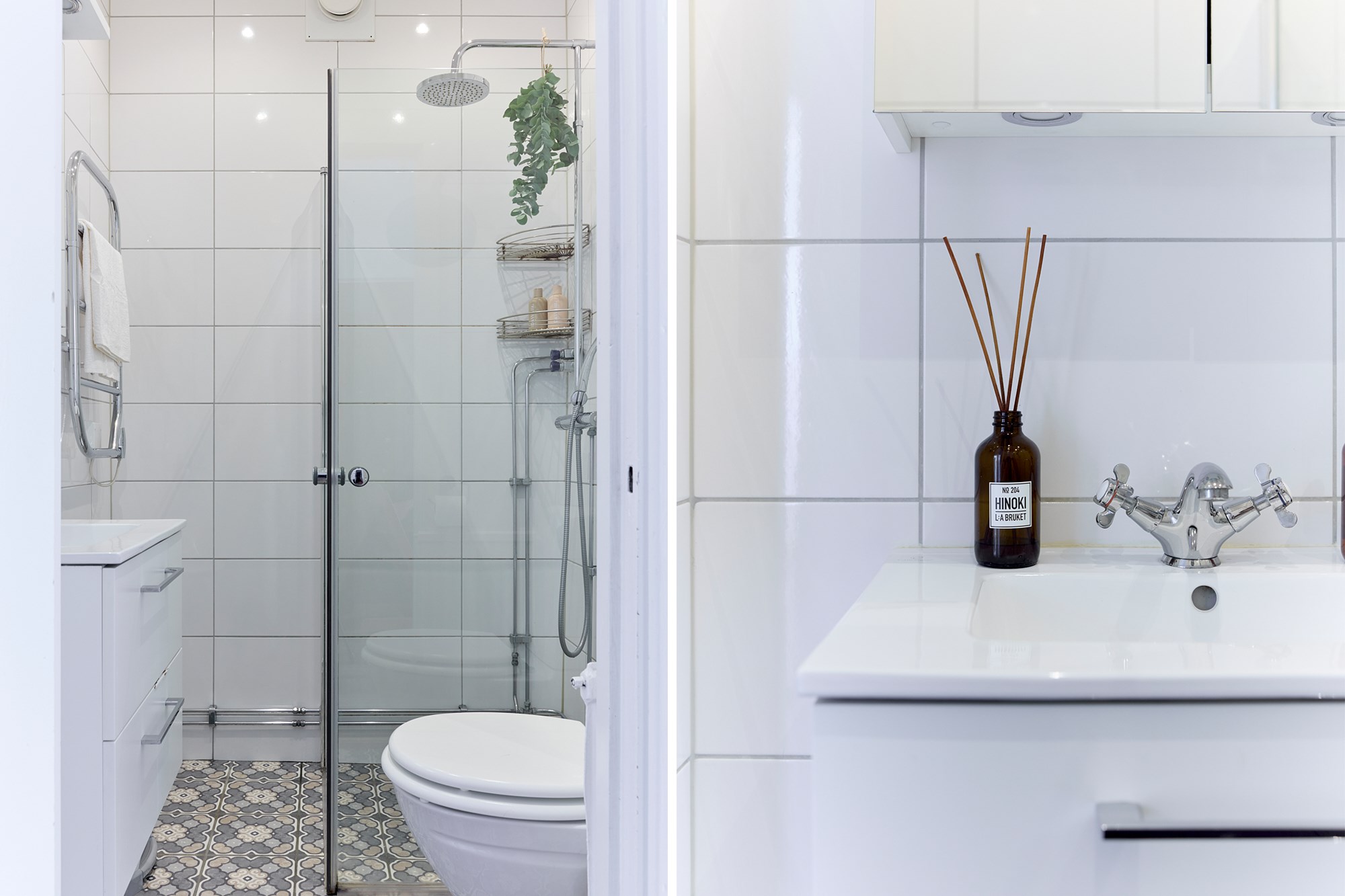 Helkaklat. Dusch, WC, badrumsskåp och handfat med kommod.