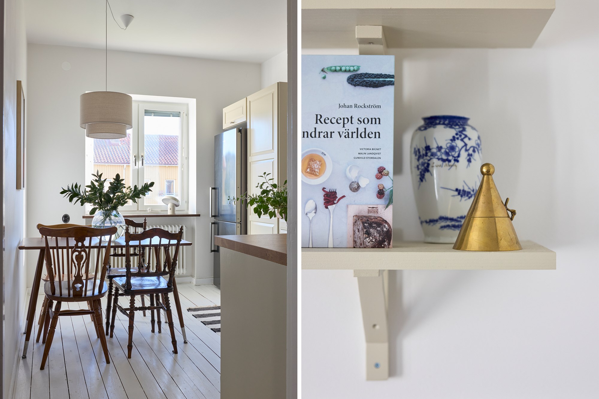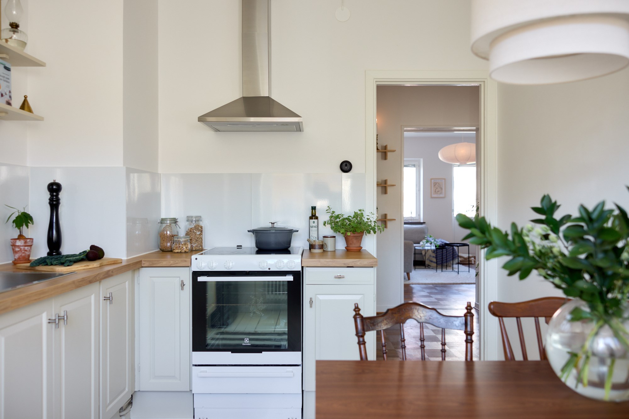 Brädgolv och väggar i vitt. Köket är utrustat med kombinerad kyl/frys och fristående spis. Fönster med fönsterbräda i sten. Plats för matbord.
