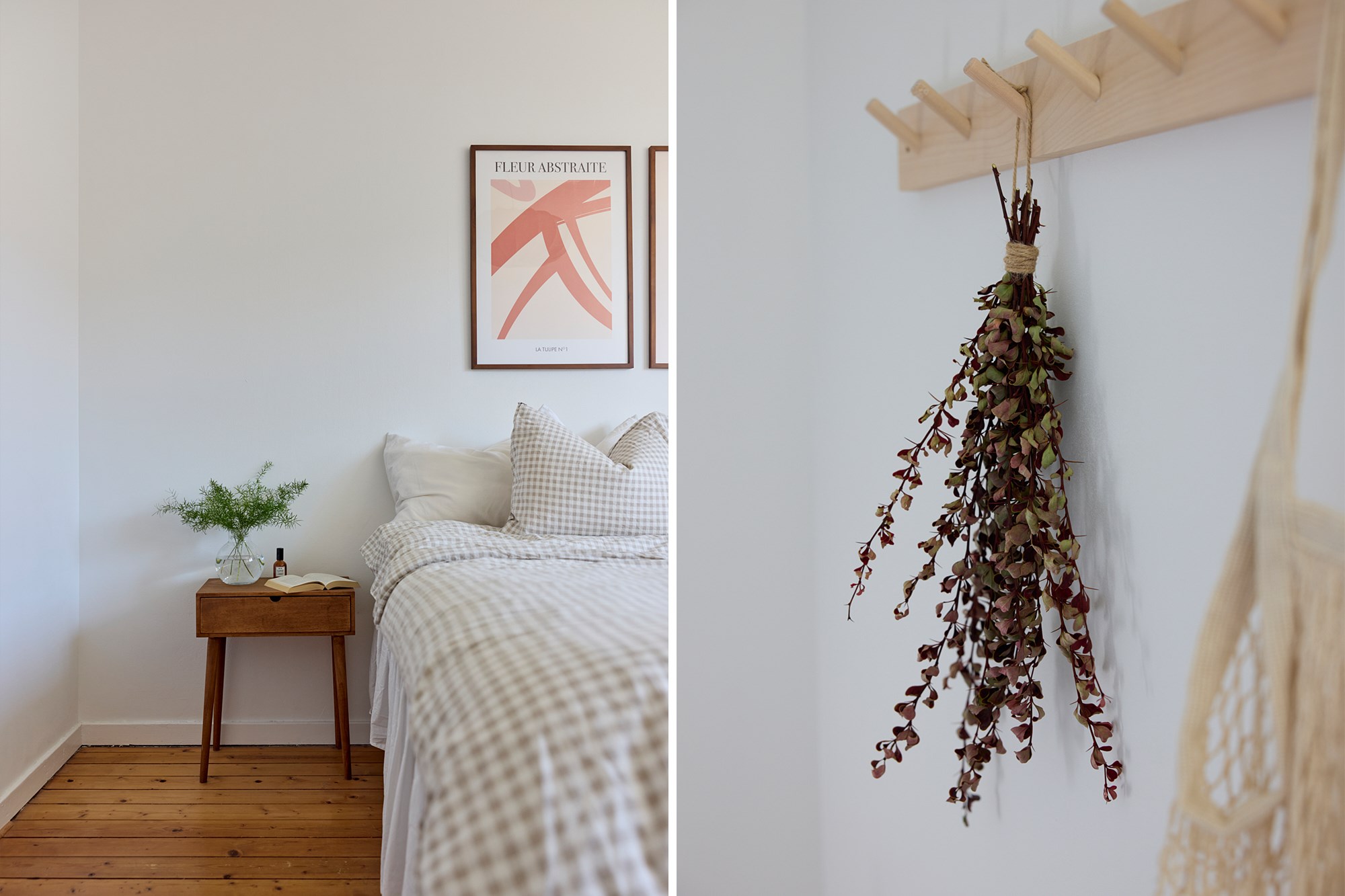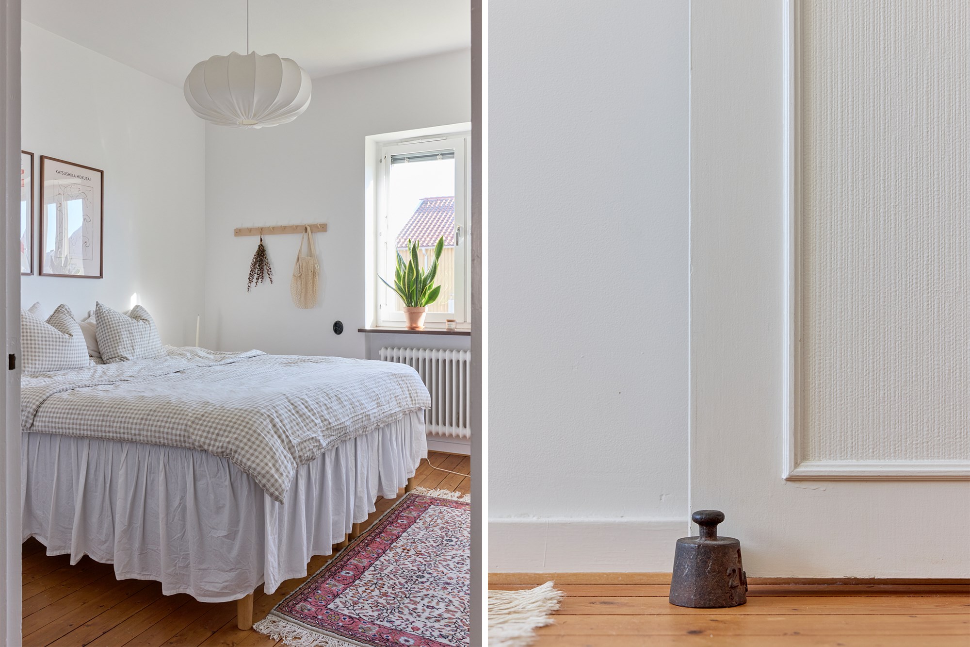 Brädgolv och väggar i vitt. Ligger mot innergården. Gardrobsförvaring.