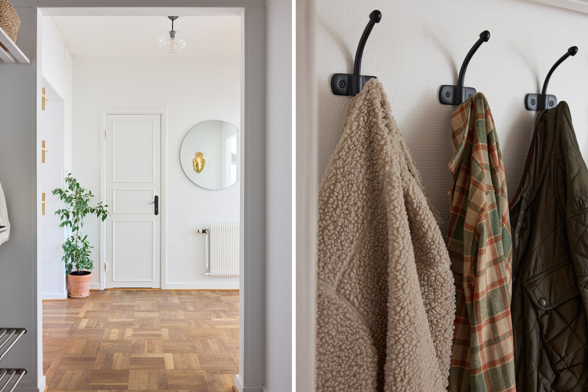 Holländskt parkett och vita släta väggar. Garderobsförvaring.