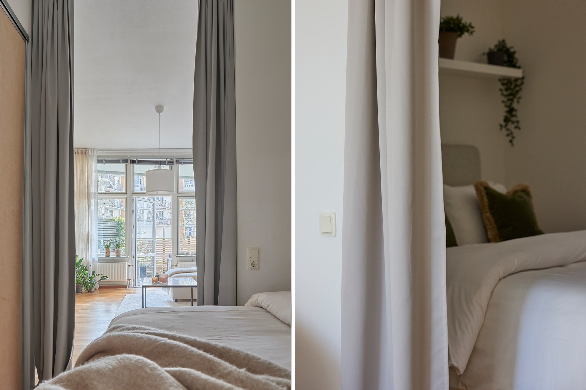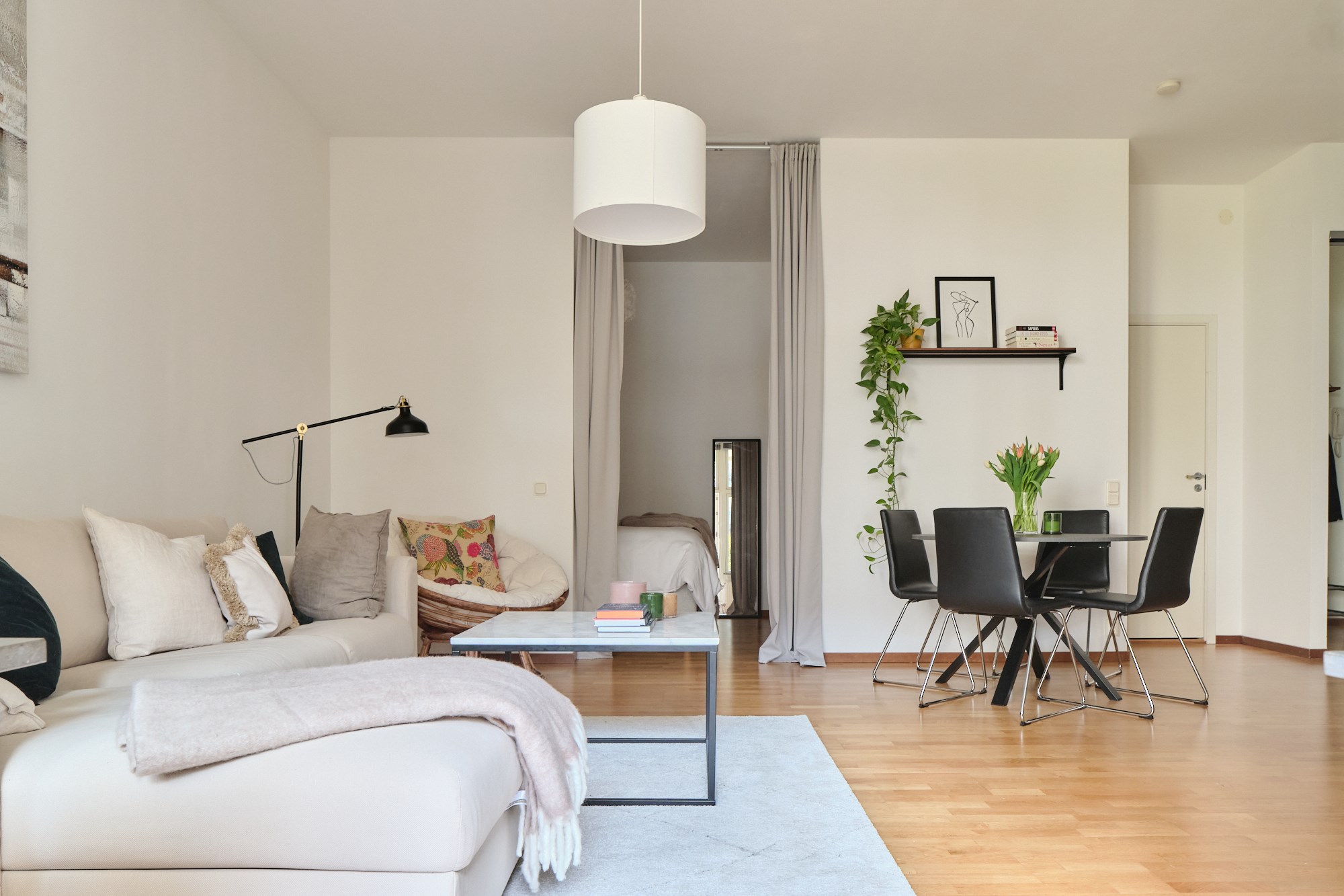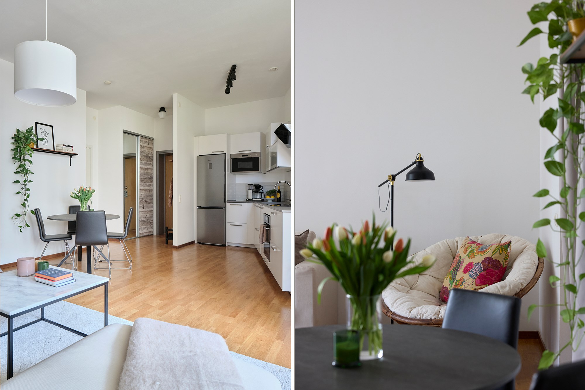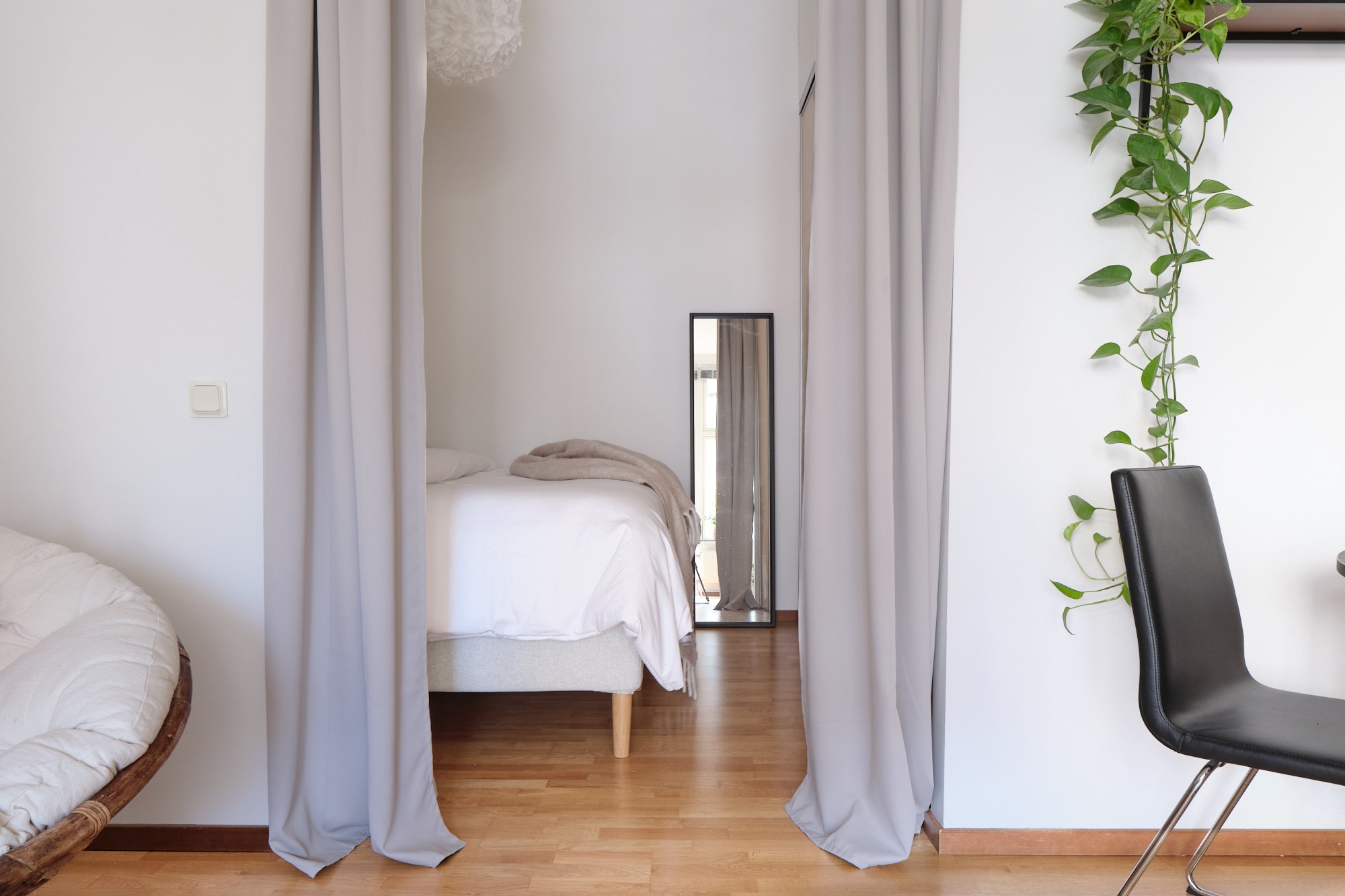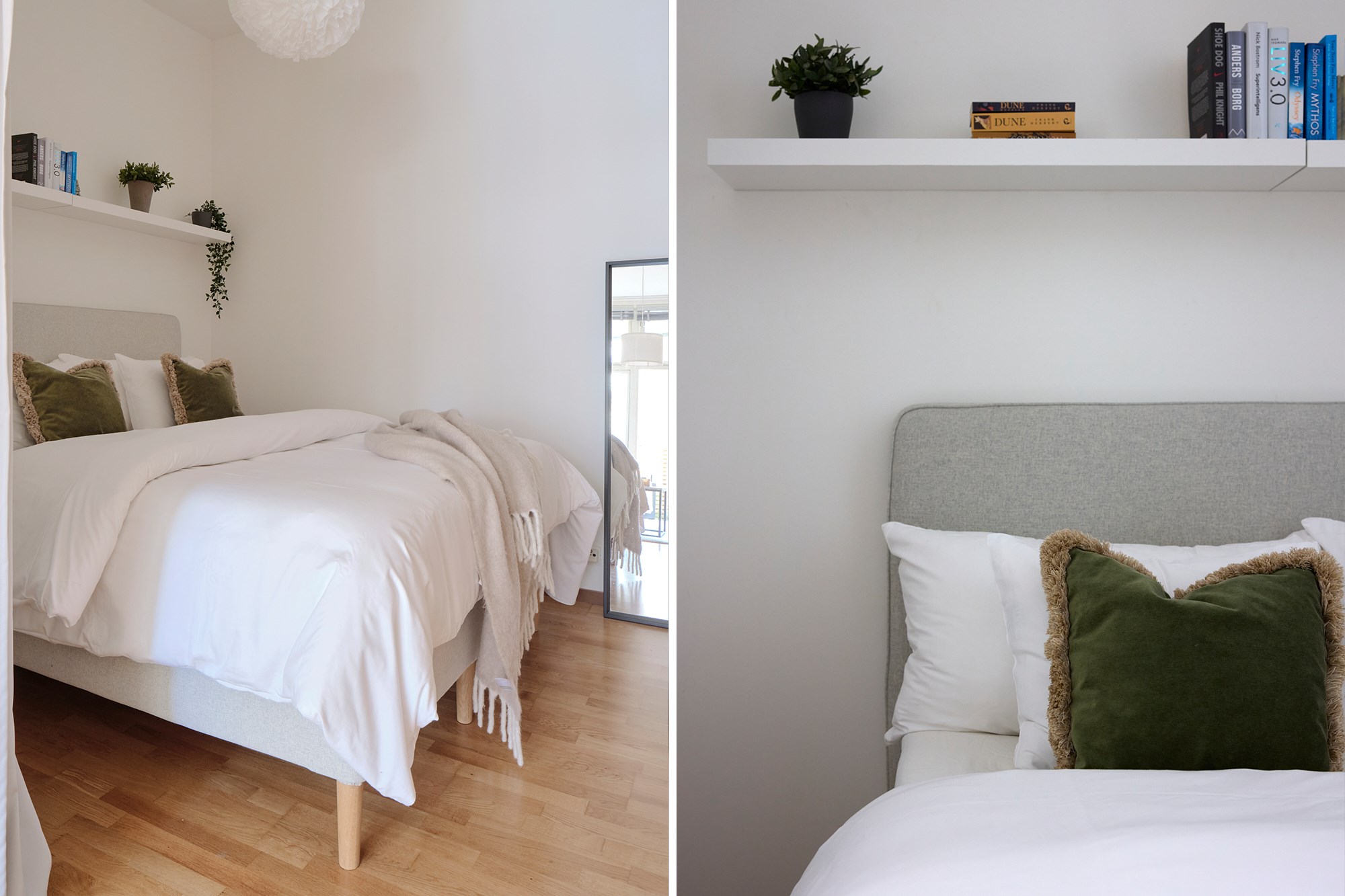 Parkettgolv och ljusa väggar. Garderobsförvaring.