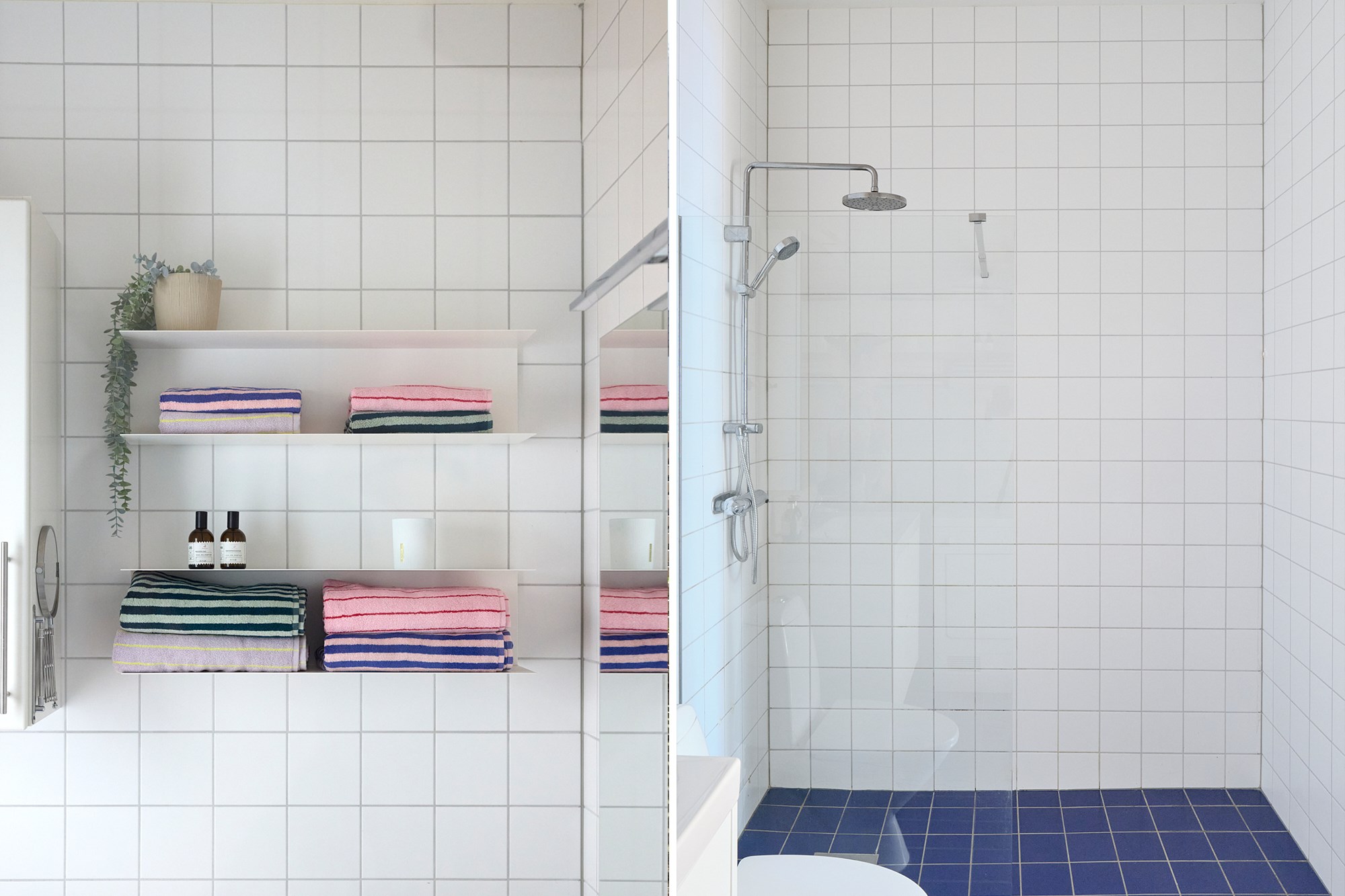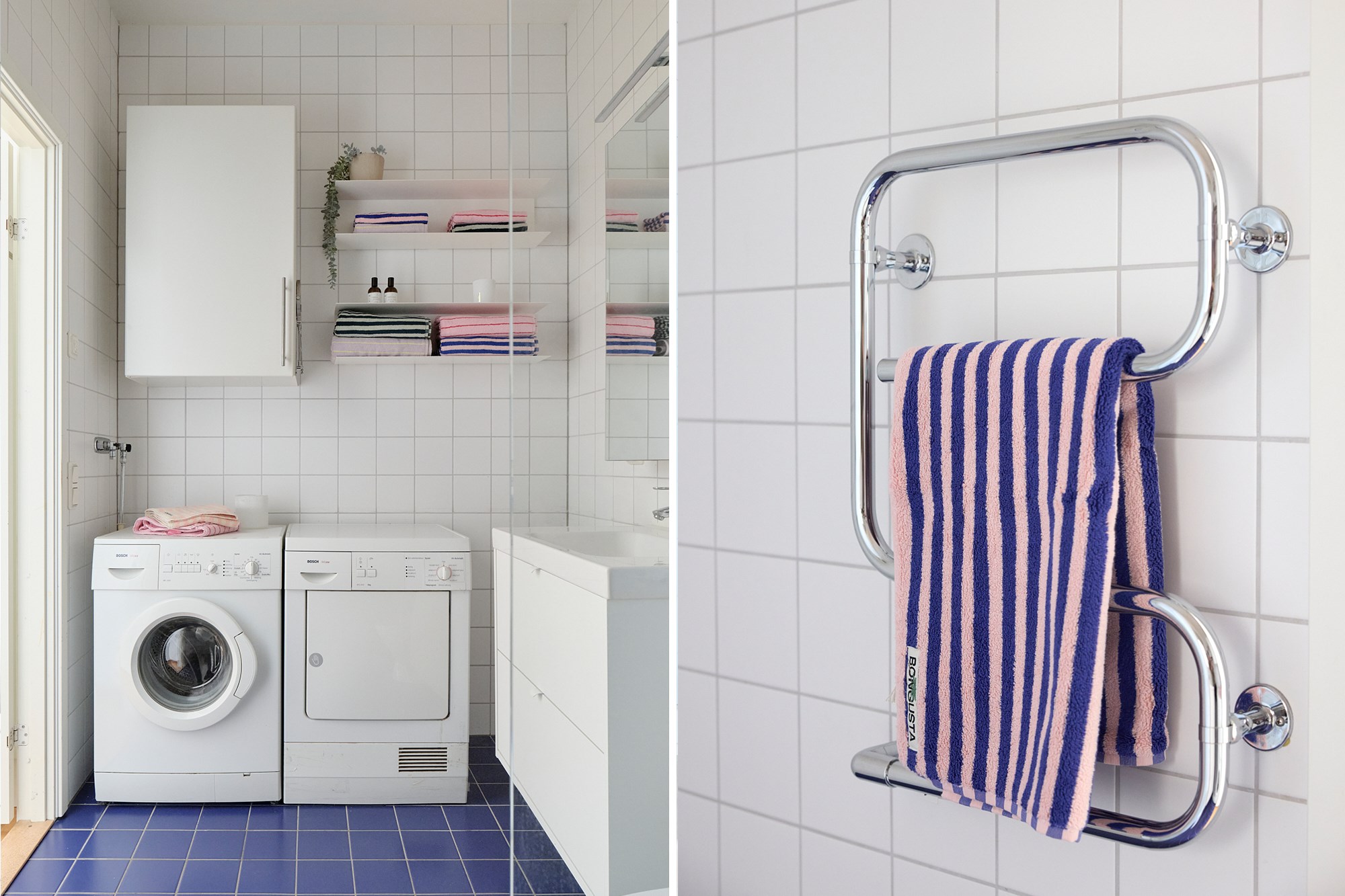 Helkaklat badrum. Blått klinker till golv och vita kaklade väggar. Utrustad med WC, handfat med vit kommod, spegel, dusch, handdukstork, förvaringsskåp, tvättmaskin och torktumlare.
