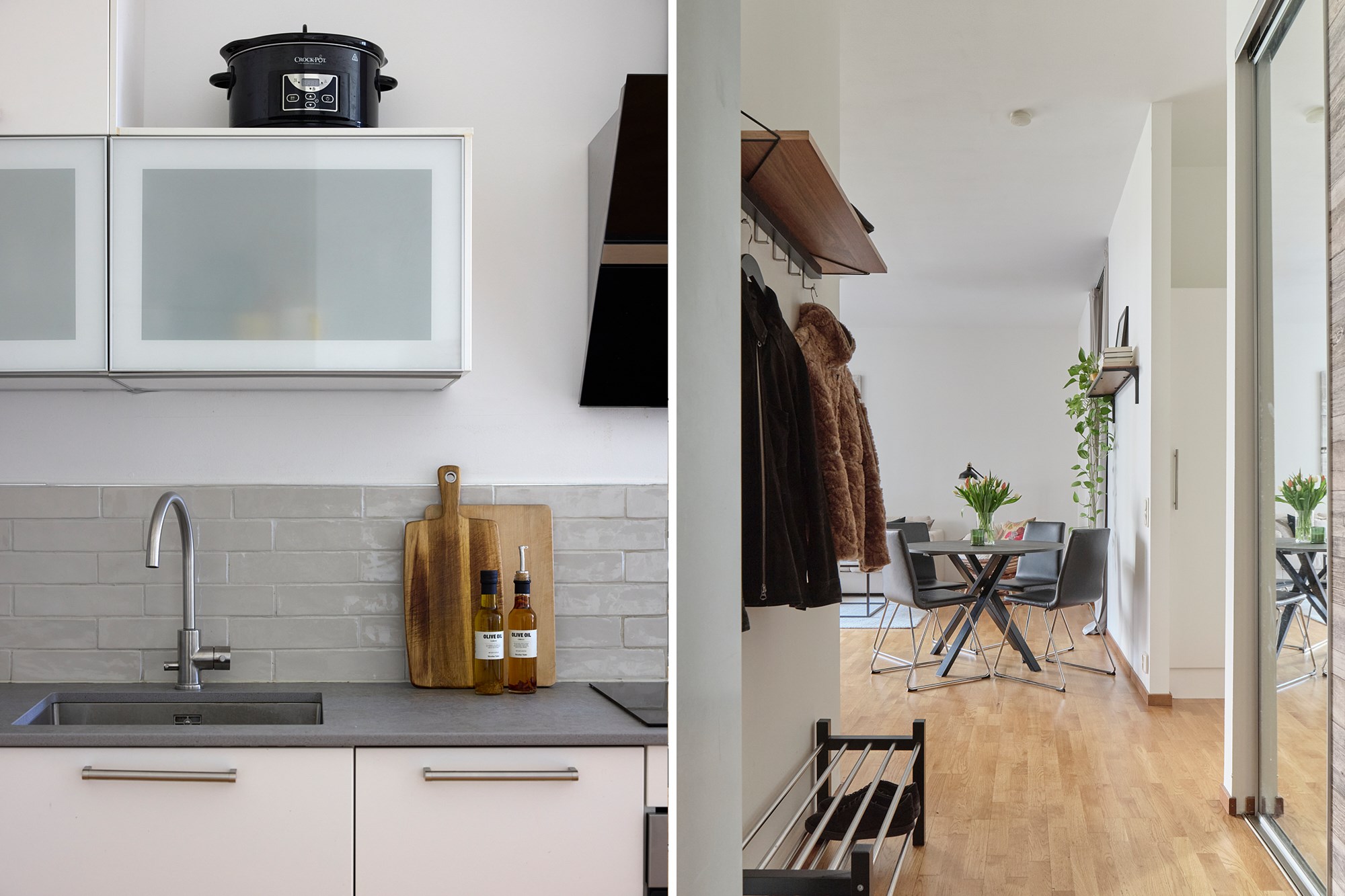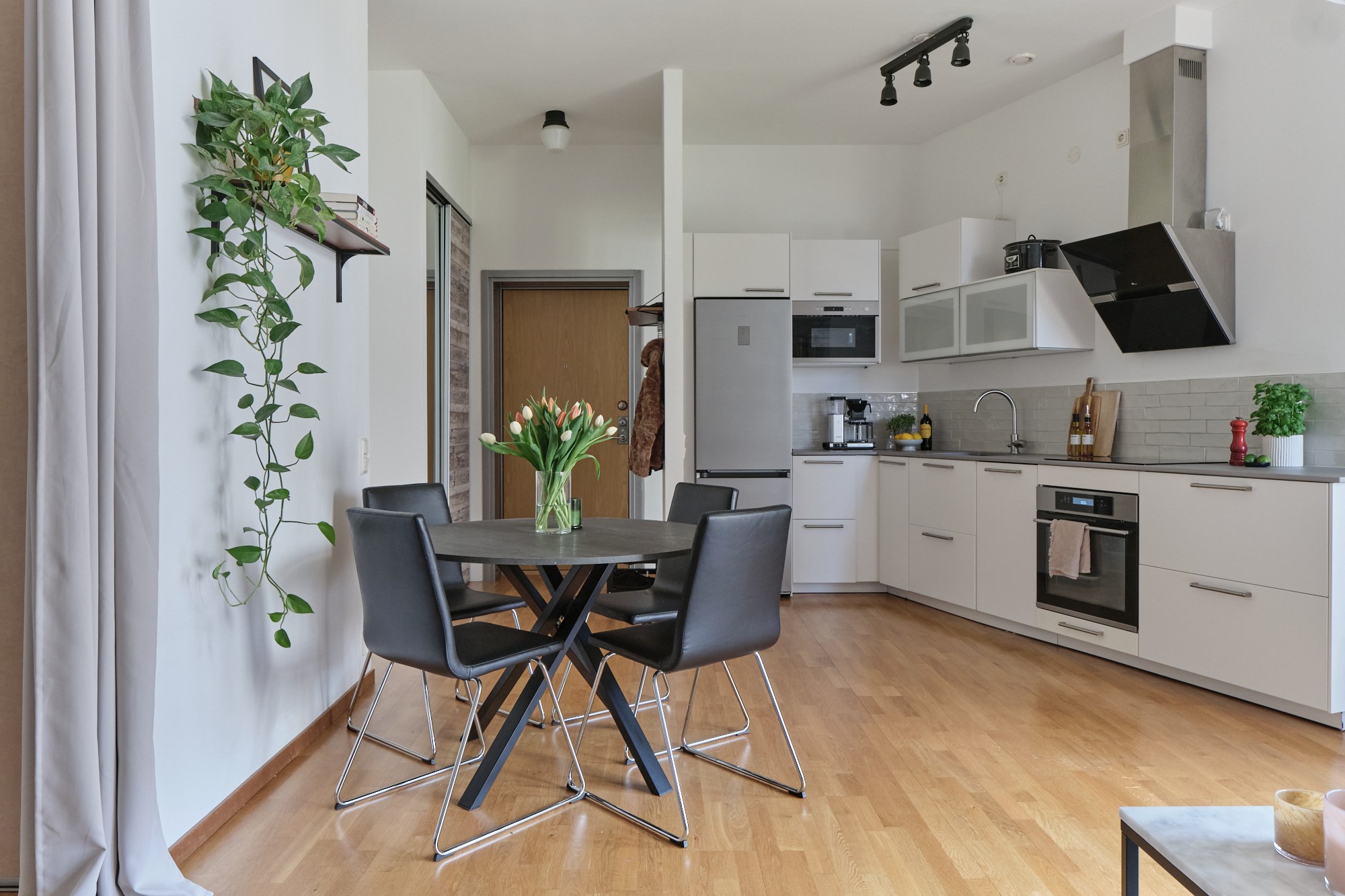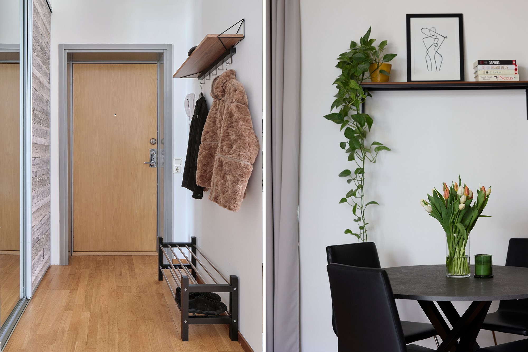 Parkettgolv och ljusa väggar. Plats för avhängning. Garderobsförvaring.
