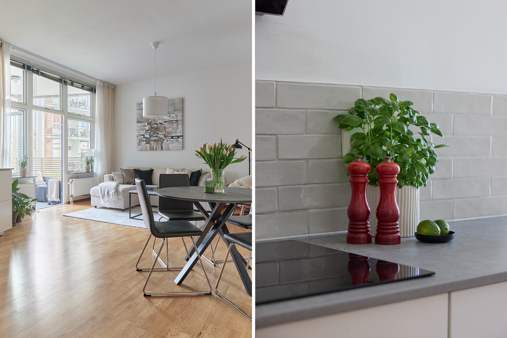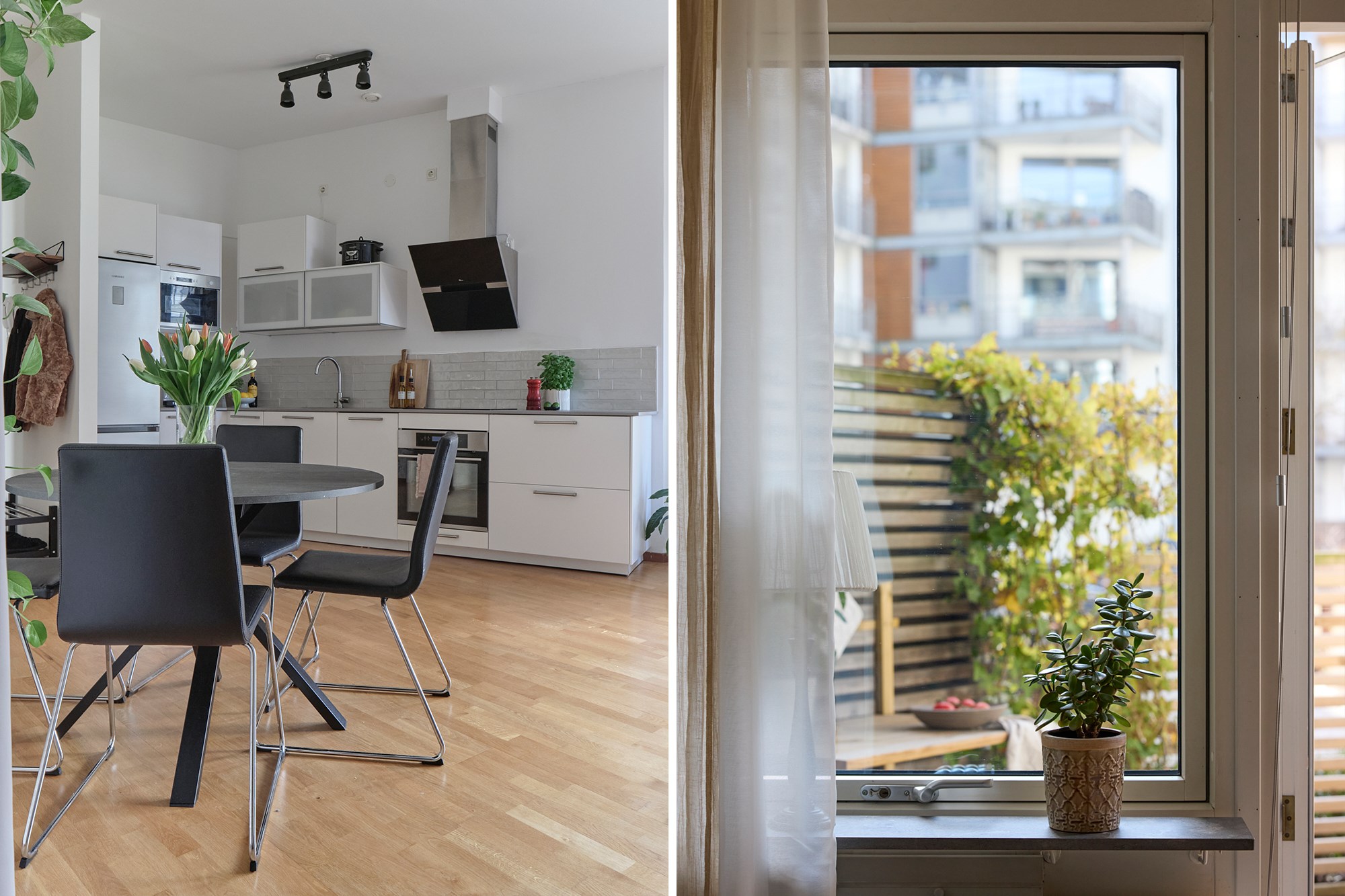 Parkettgolv och ljusa väggar. Vit köksinredning. Maskinell utrustning i form av induktionshäll och fläkt, ugn, mikrovågsugn, diskmaskin, delad kyl och frys. Direkt i anslutning till matplats.