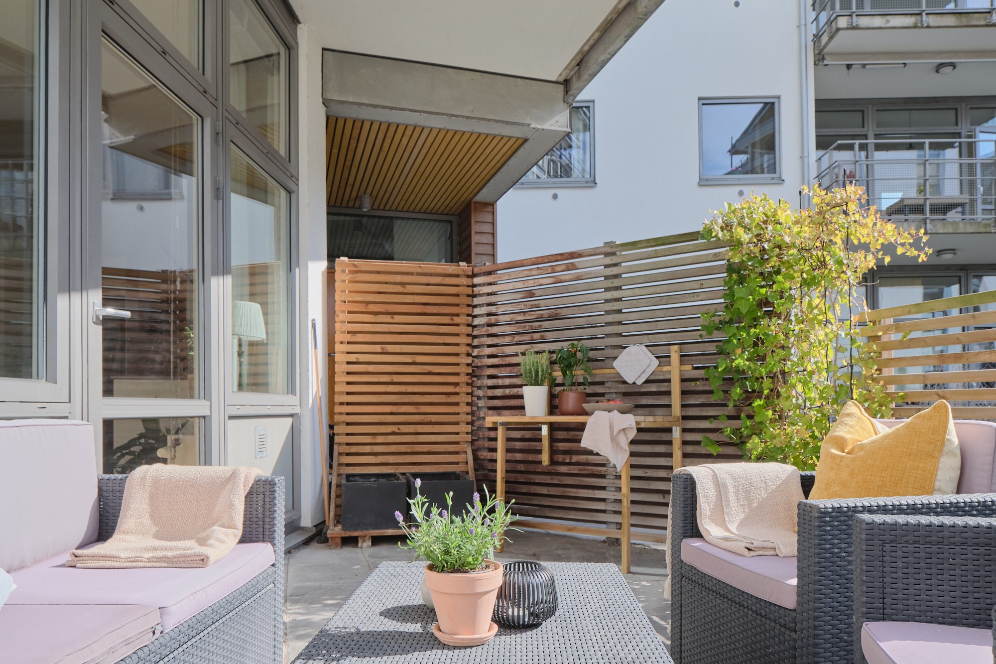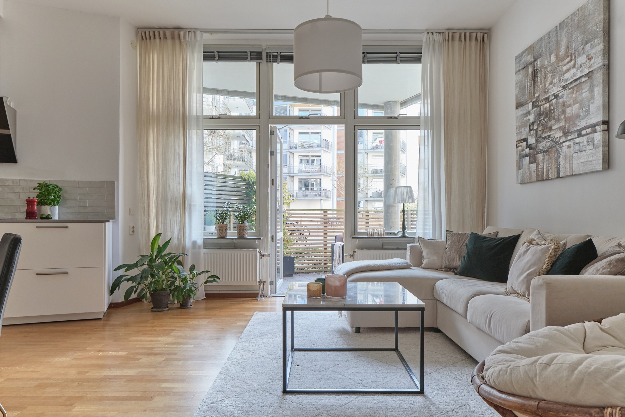 Parkettgolv och ljusa väggar. Plats för soffgrupp. Utgång till uteplats.
