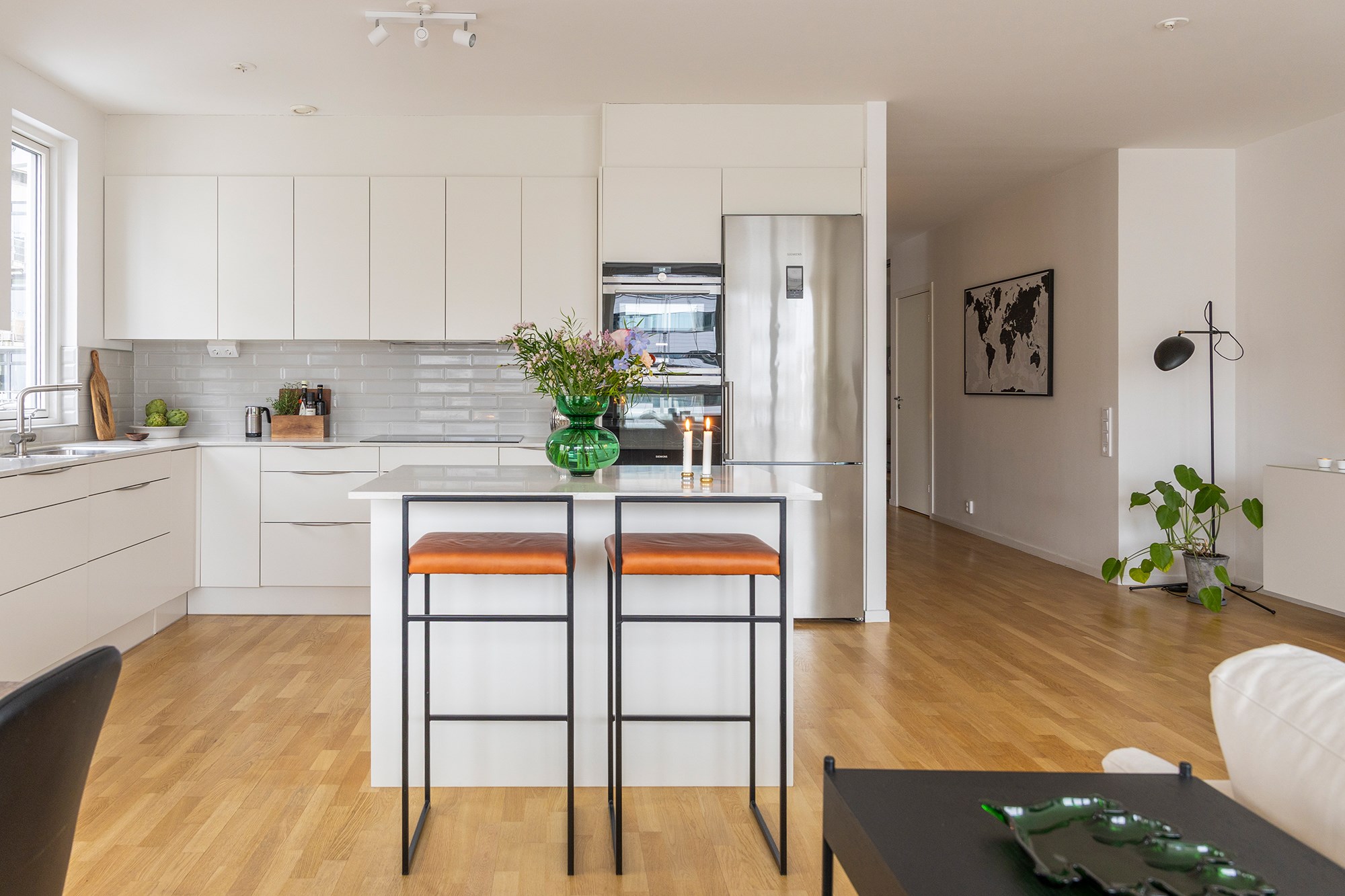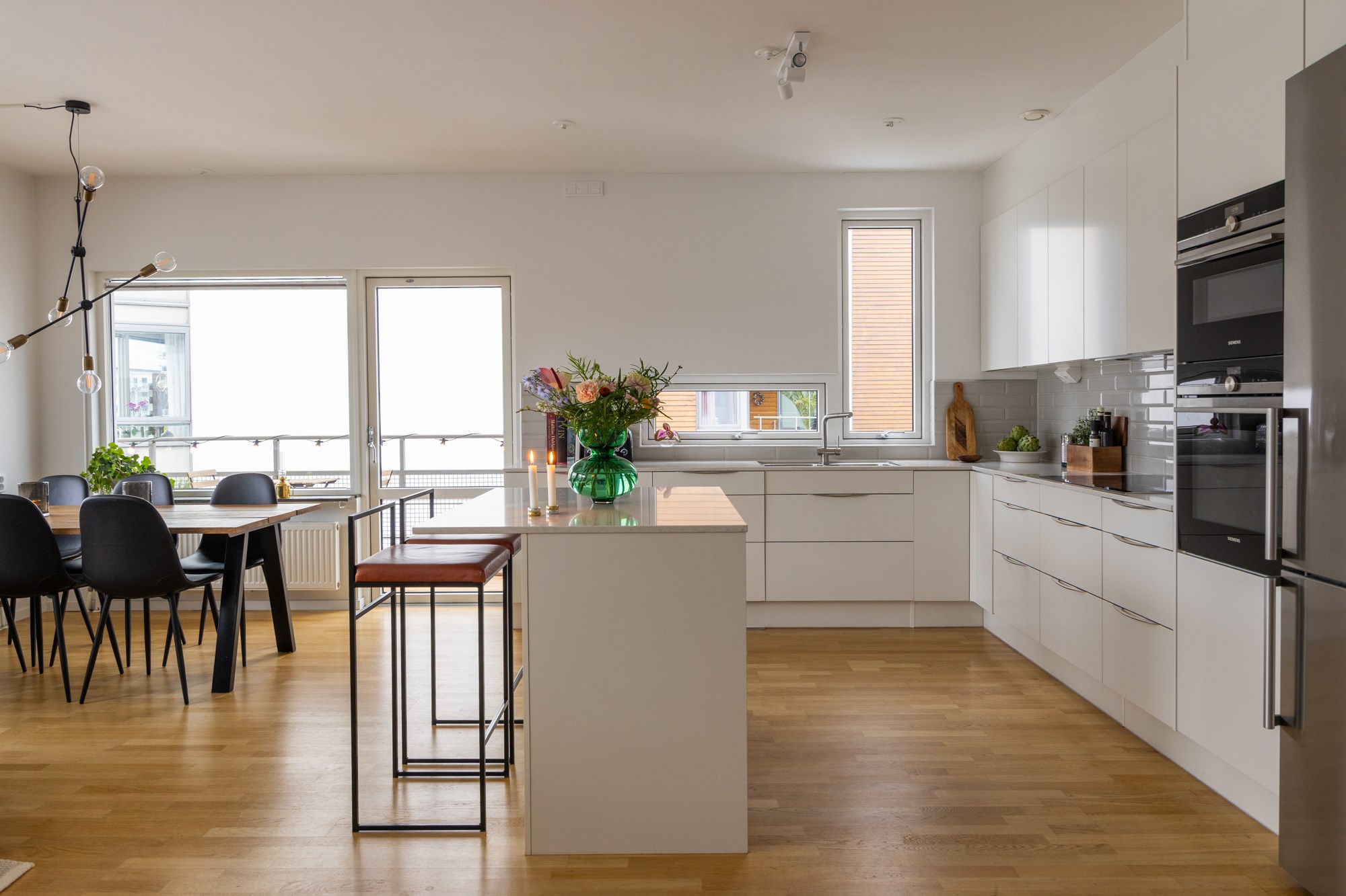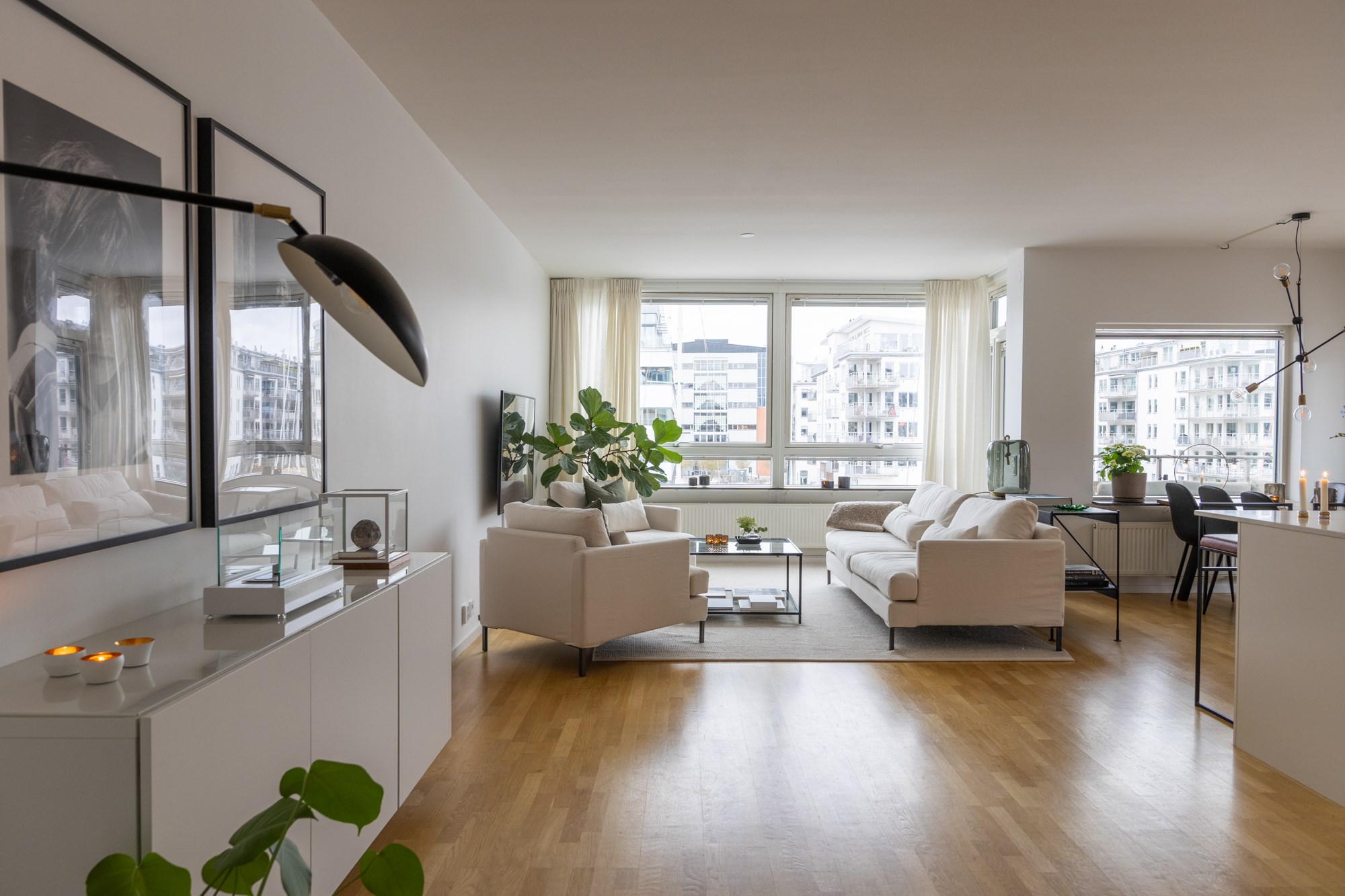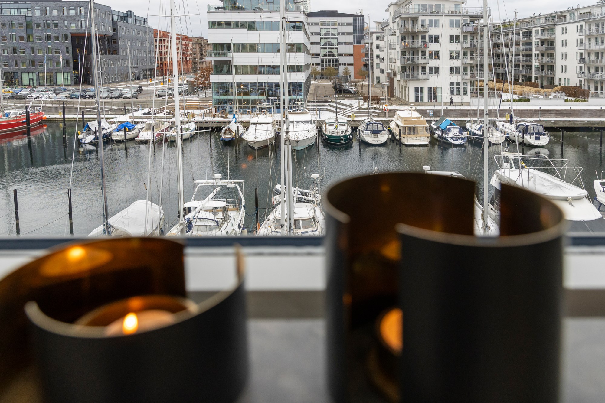 Exklusiv och vacker våning i direktkontakt med småbåtshamnen i Dockan. På Krankajen 2 väntar 101 kvalitativa kvadrat med vyer över hela hamnen och dubbla balkonger. Arkitekturen maximerar ljus och utsikt på ett mästerligt sätt - ett imponerande sällskapsrum med integrerat kök blir härliga sällskapsytor, fönster på rad samt balkong i vinkel ut mot hamnen ger en fantastisk fri känsla. Den smakfullt inredda våningen på tre rum och kök möter hamnen på det öppnaste vis med en 180 graders vy över marinan. Solens strålar glittrar i vattnet mellan båtarna och masterna vajar, varje årstid har sin charm här. Om sommaren är balkongen soldränkt från förmiddagen fram till kvällen då solen färgar himlen röd, vackrare kan det inte bli! Våningen är välplanerad och genomtänkt, en av alla fina detaljer är överljusen över innerdörrarna. Master bedroom har dovt blå väggar, platsbyggd förvaring ton i ton, havsutsikt och utgång till våningens andra balkong. Intill ligger ytterligare ett rum med samma fina vy och dovt gröna väggar. Badrummet har både dusch och badkar samt tvättmaskiner, här finns även en gästtoalett. Här bor ni i en välskött förening med mycket god ekonomi. Utanför porten väntar sprudlande kvarter med härliga promenadstråk nere vid kajen, trendiga restauranger och det öppna havet tätt inpå, välkomna!