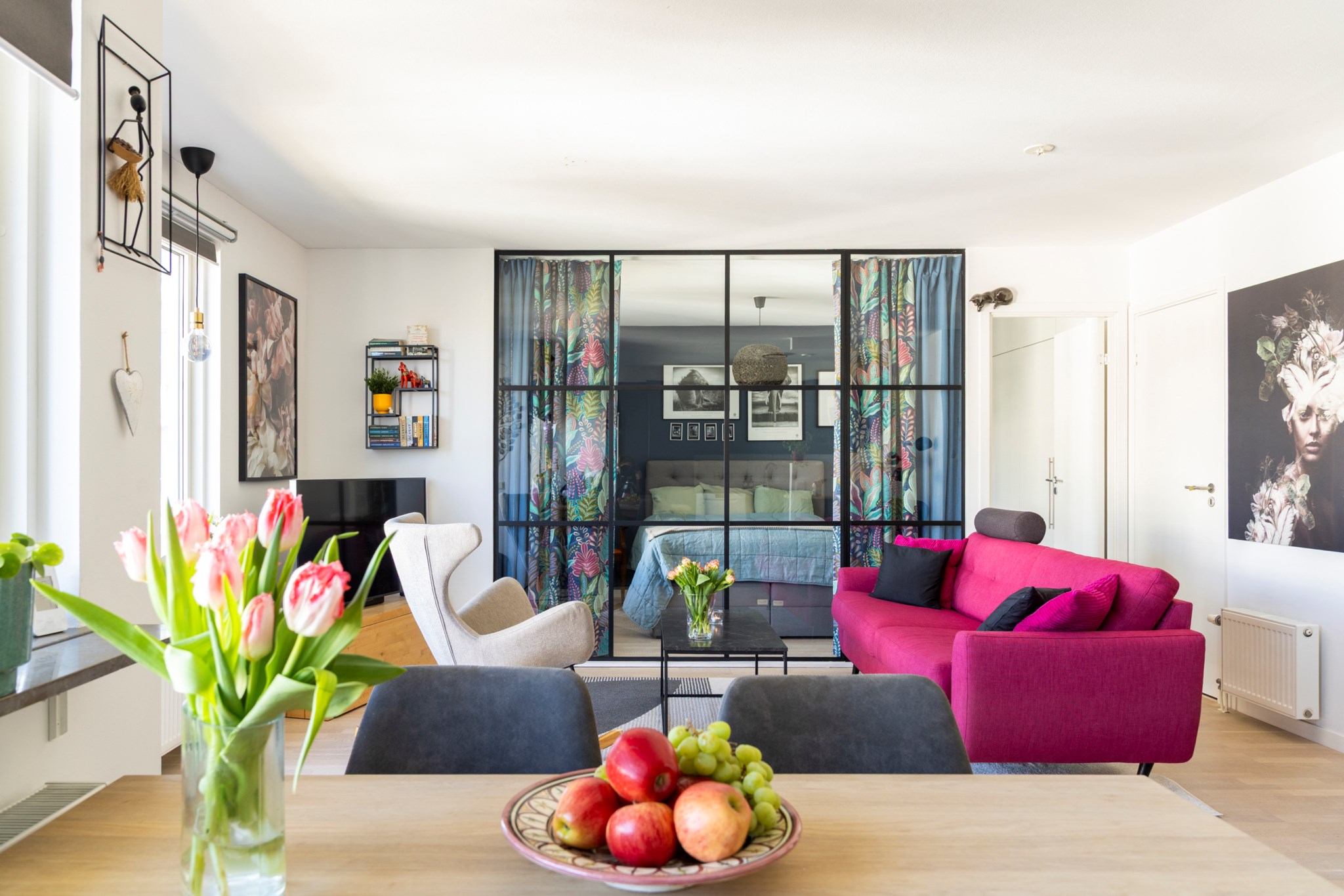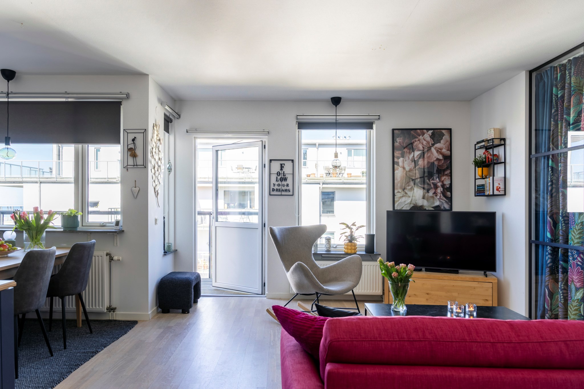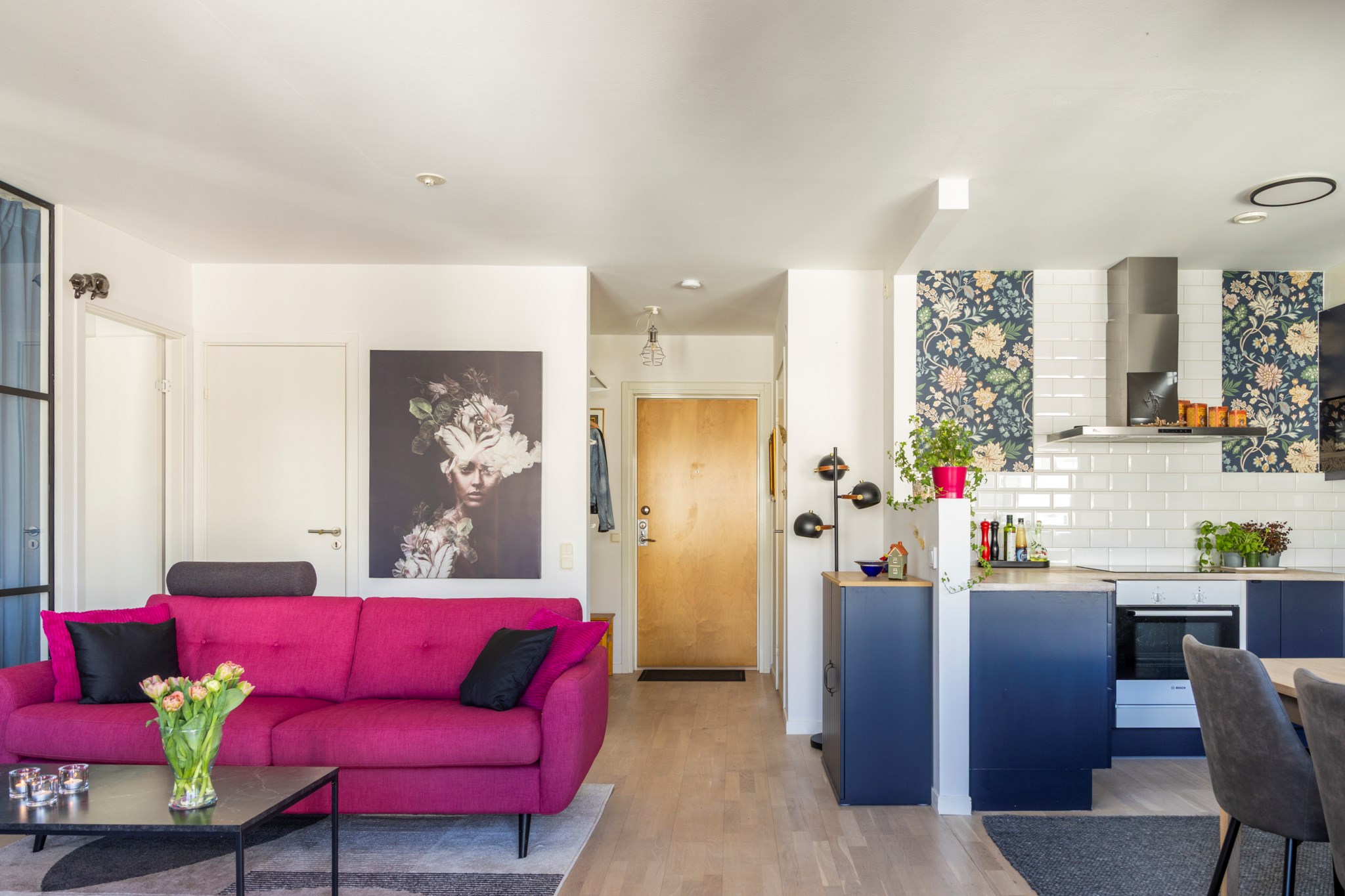 Parkettgolv och ljusa väggar. Plats för soffgrupp. Utgång till balkong.