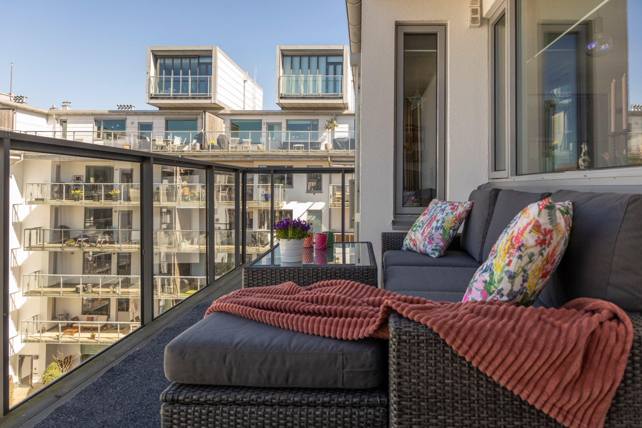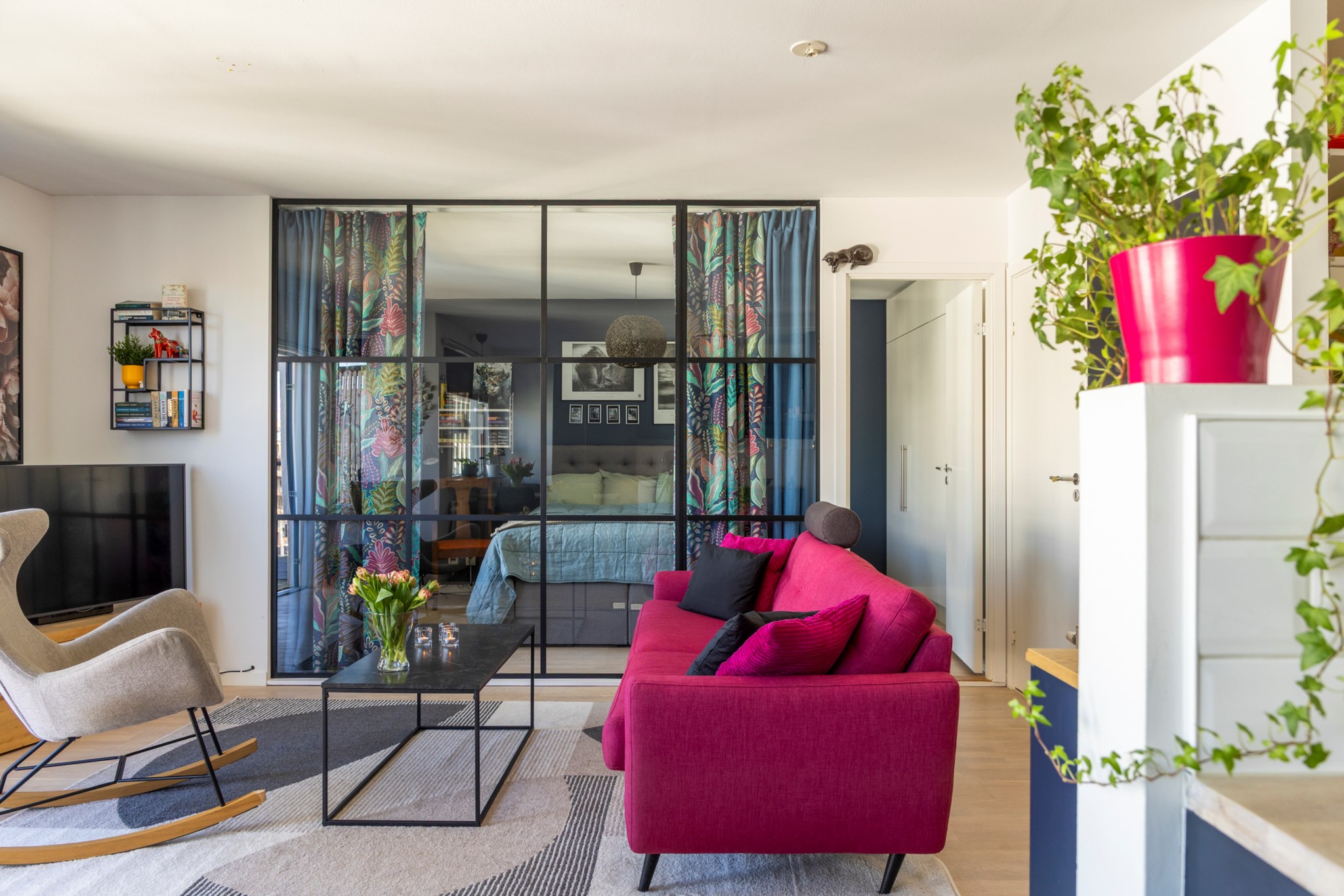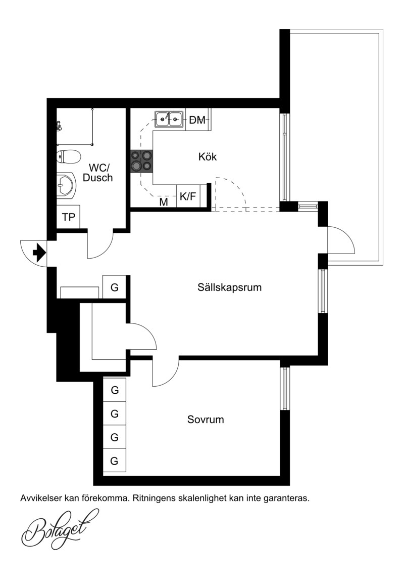 Parkettgolv och ljusa väggar. Plats för soffgrupp. Utgång till balkong.