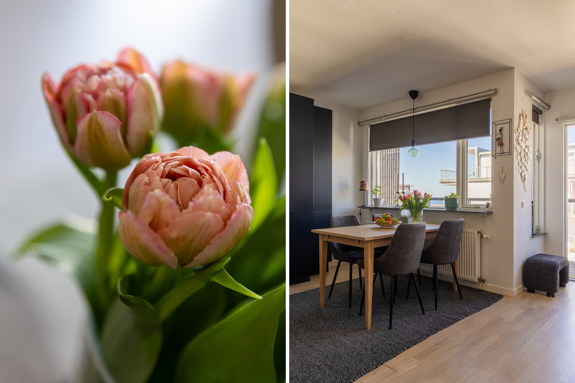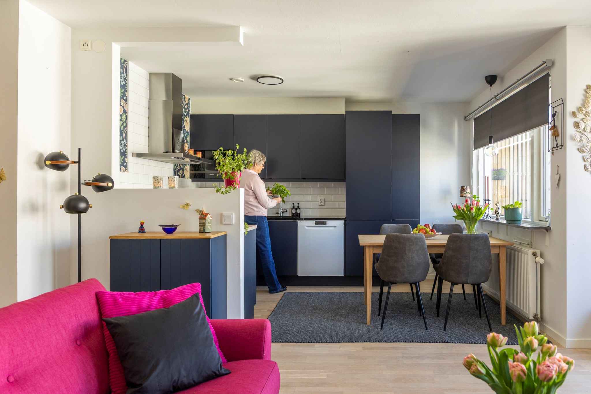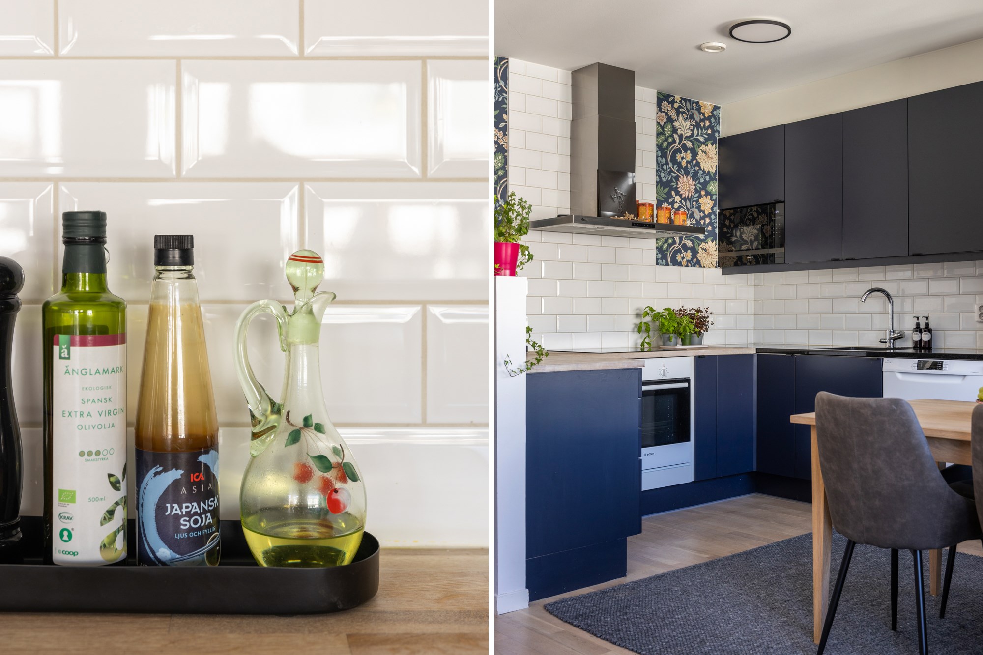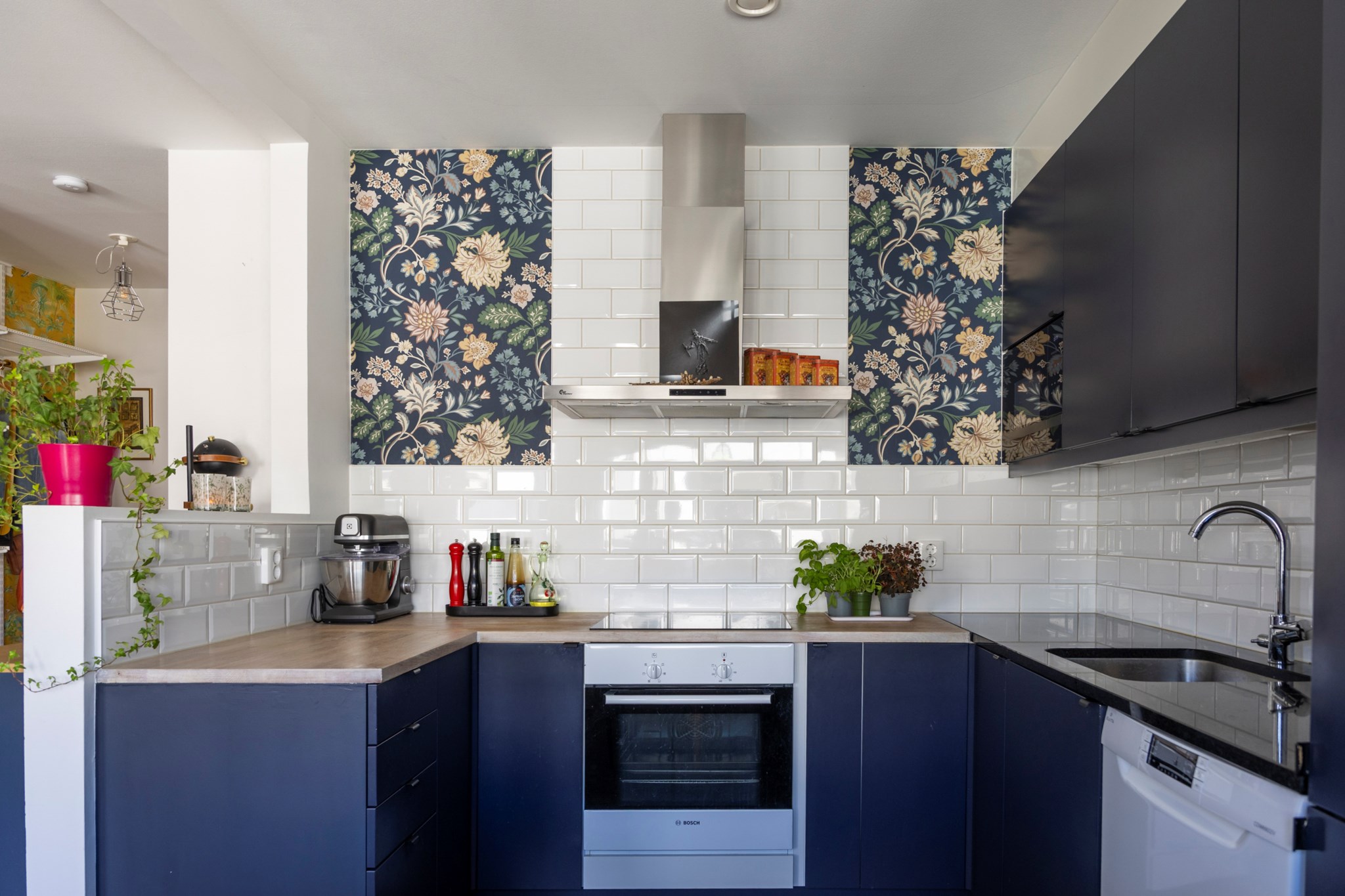 Parkettgolv och ljusa väggar. Mörk köksinredning. Maskinell utrustning i form av induktionshäll och fläkt, ugn, mikrovågsugn, diskmaskin, delad kyl och frys. Direkt anslutning till matplats.