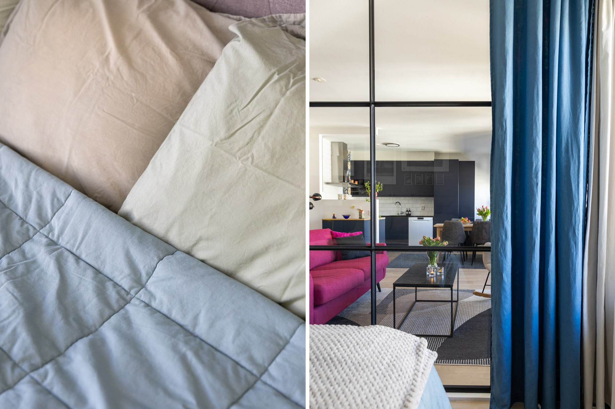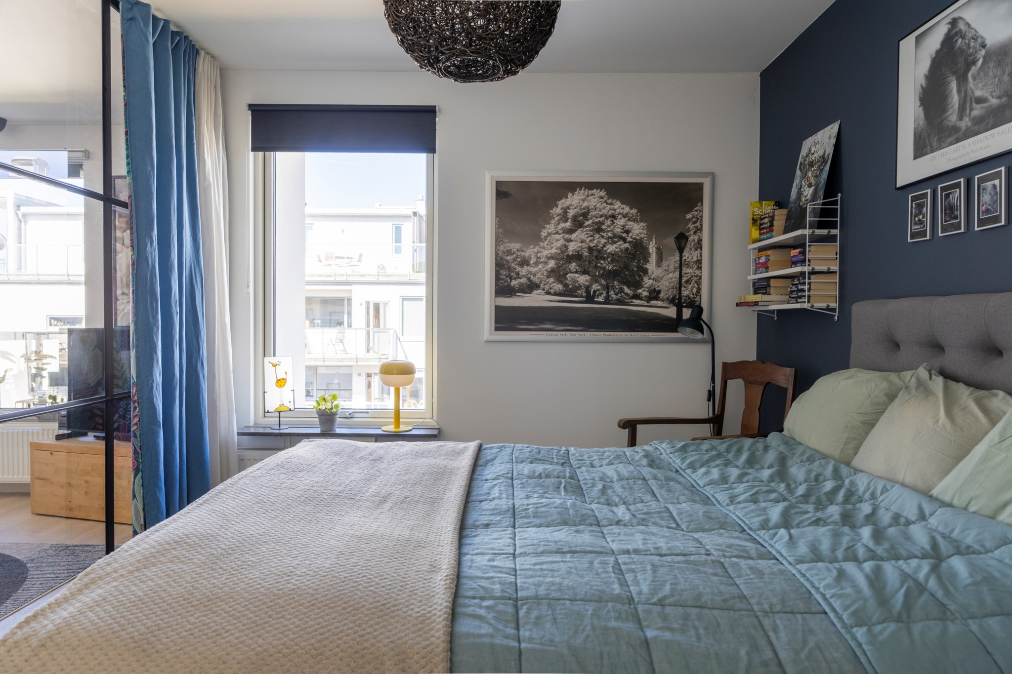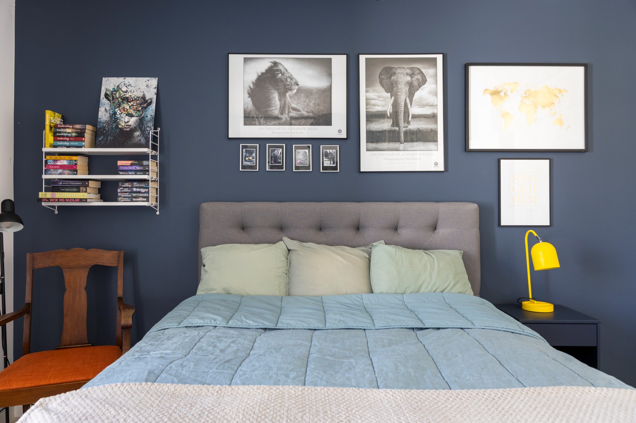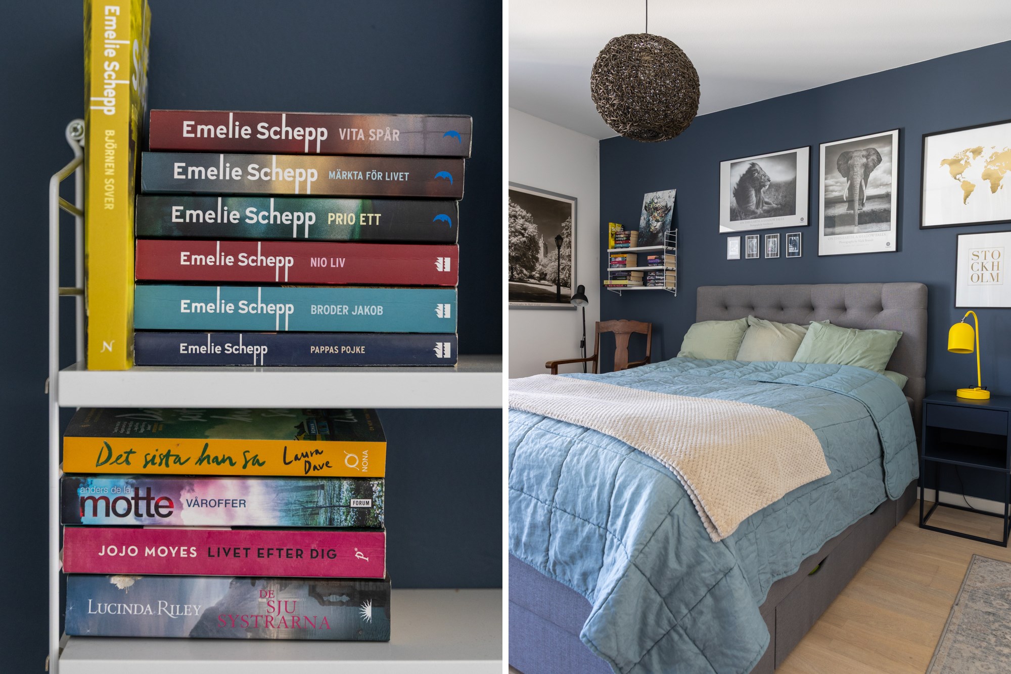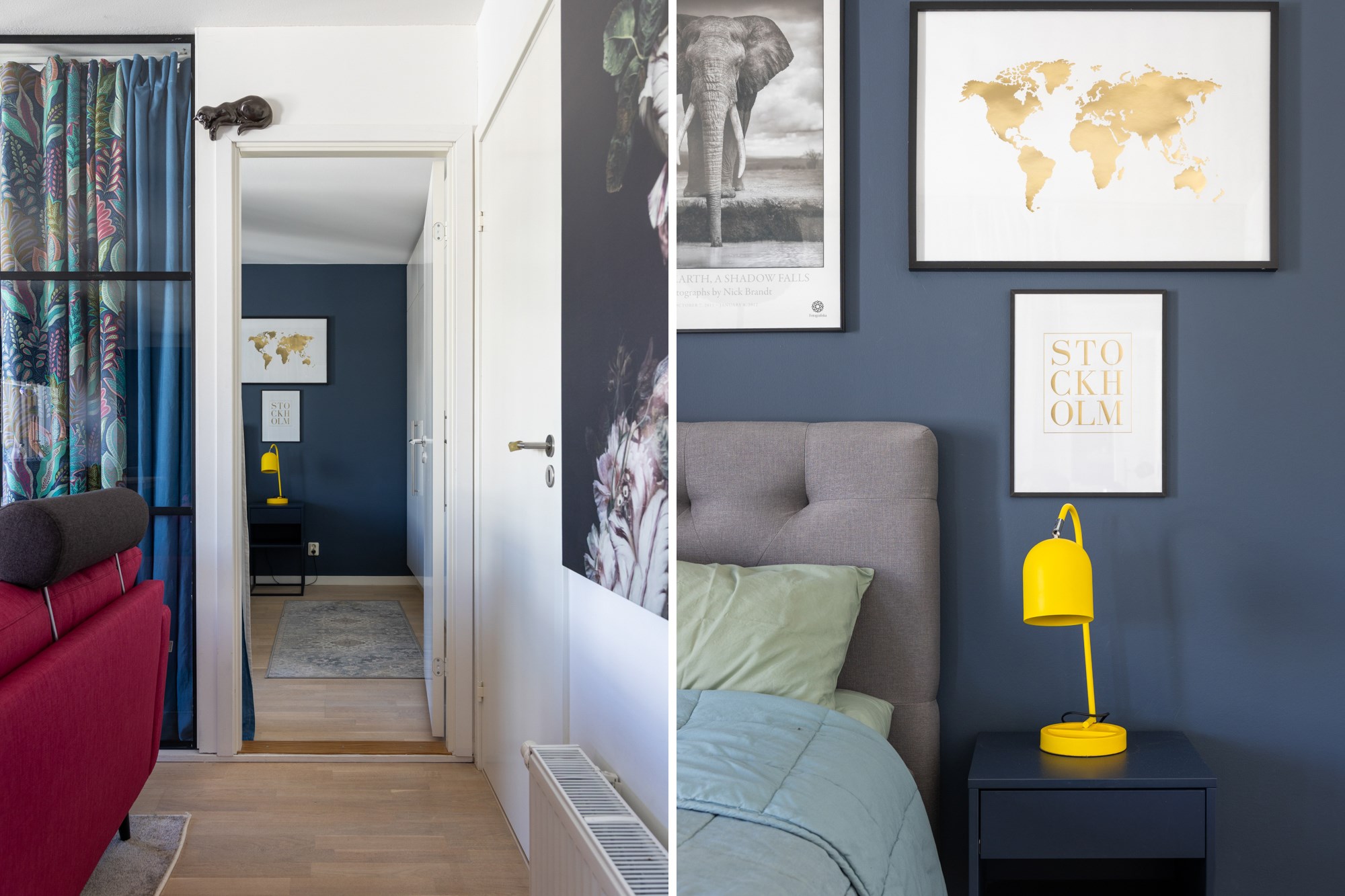 Parkettgolv och mörka väggar. Generöst med garderobsförvaring.