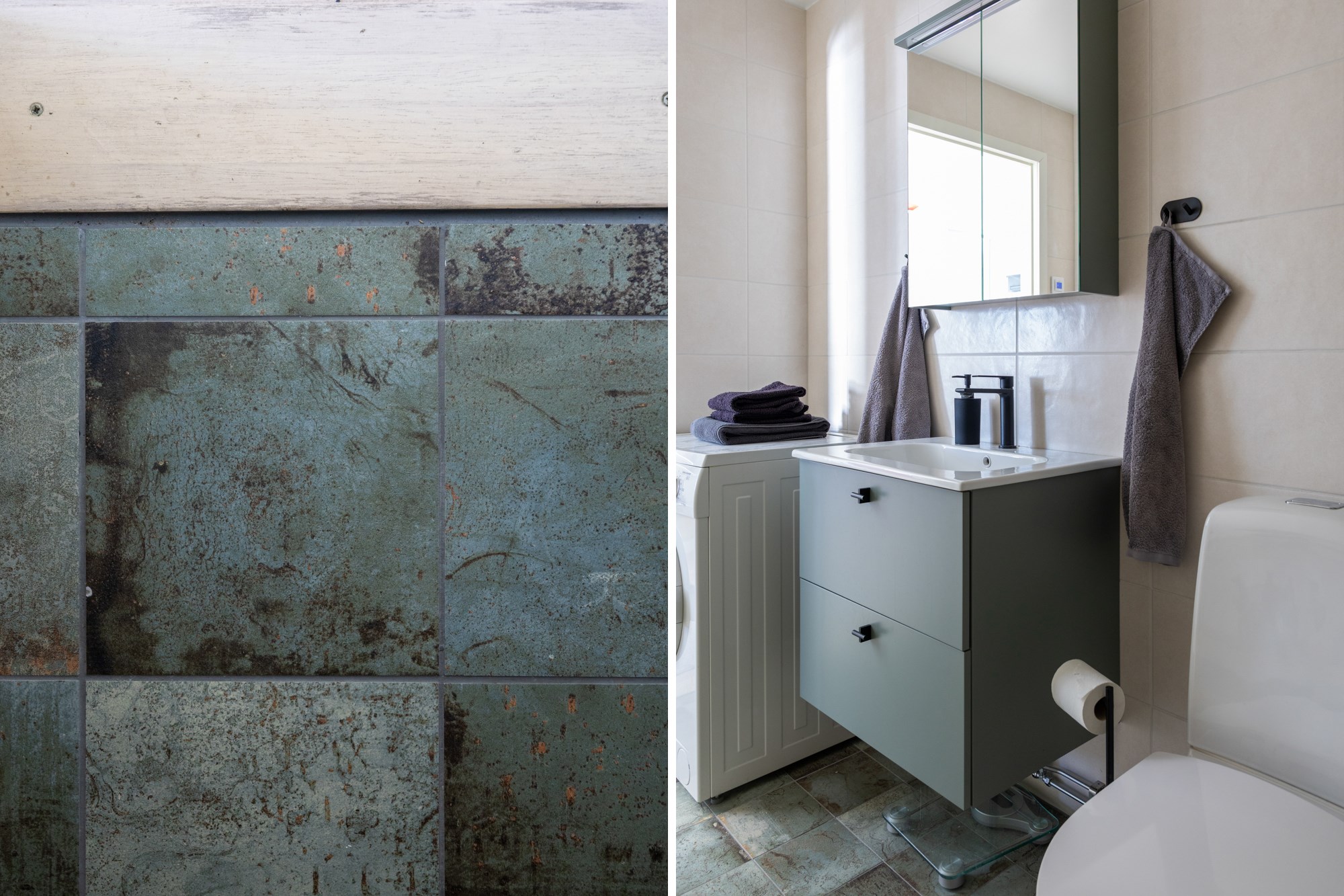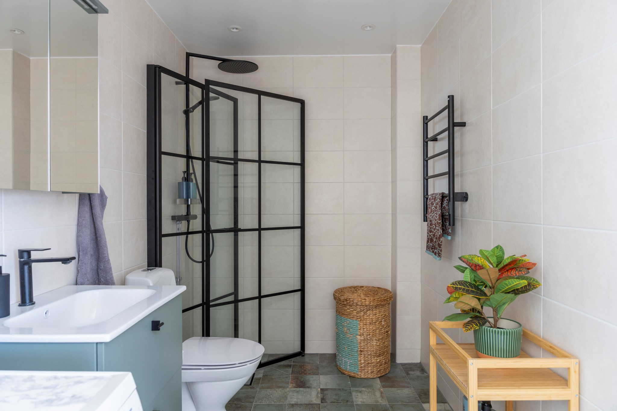Helkaklat badrum. Färgat klinker till golv och vita kaklade väggar. Utrustad med WC, handfat med ljus kommod, spegelskåp, dusch, handdukstork, tvättmaskin med integrerad torktumlare.