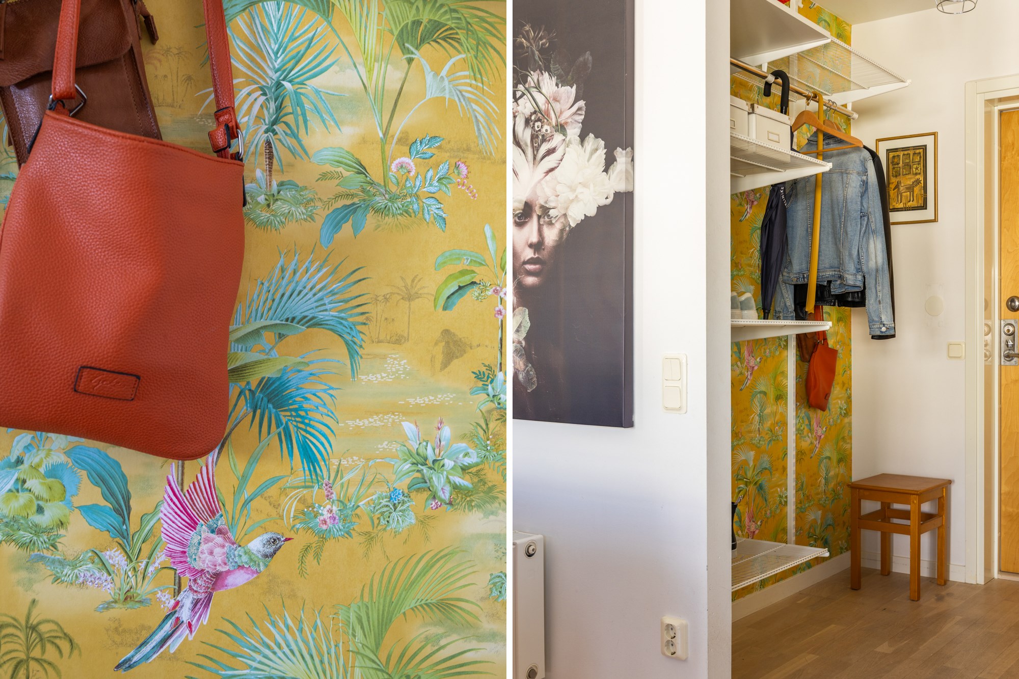Parkettgolv och med ljusa väggar samt färgglad tapet väggar. Plats för avhängning.