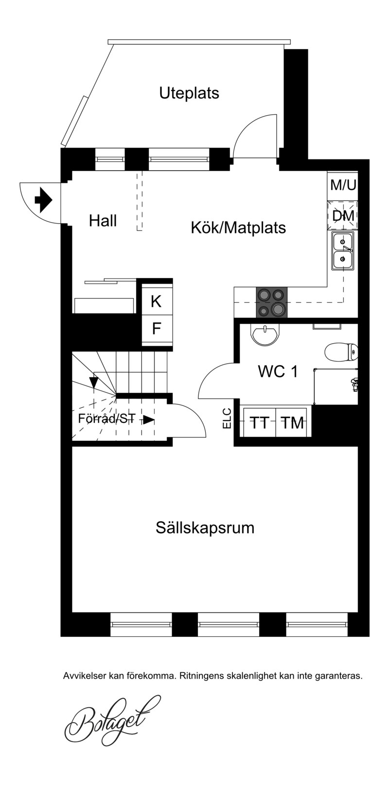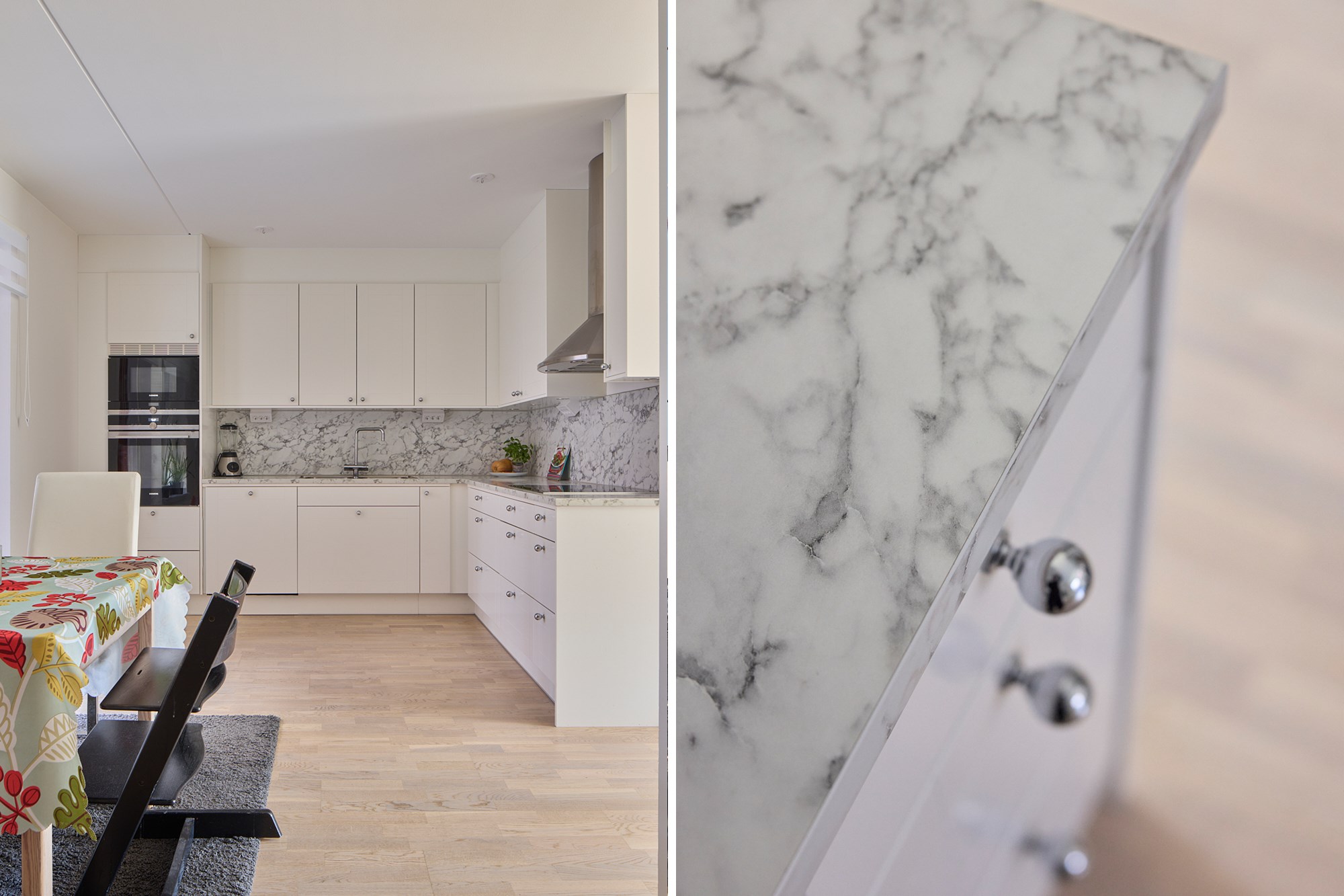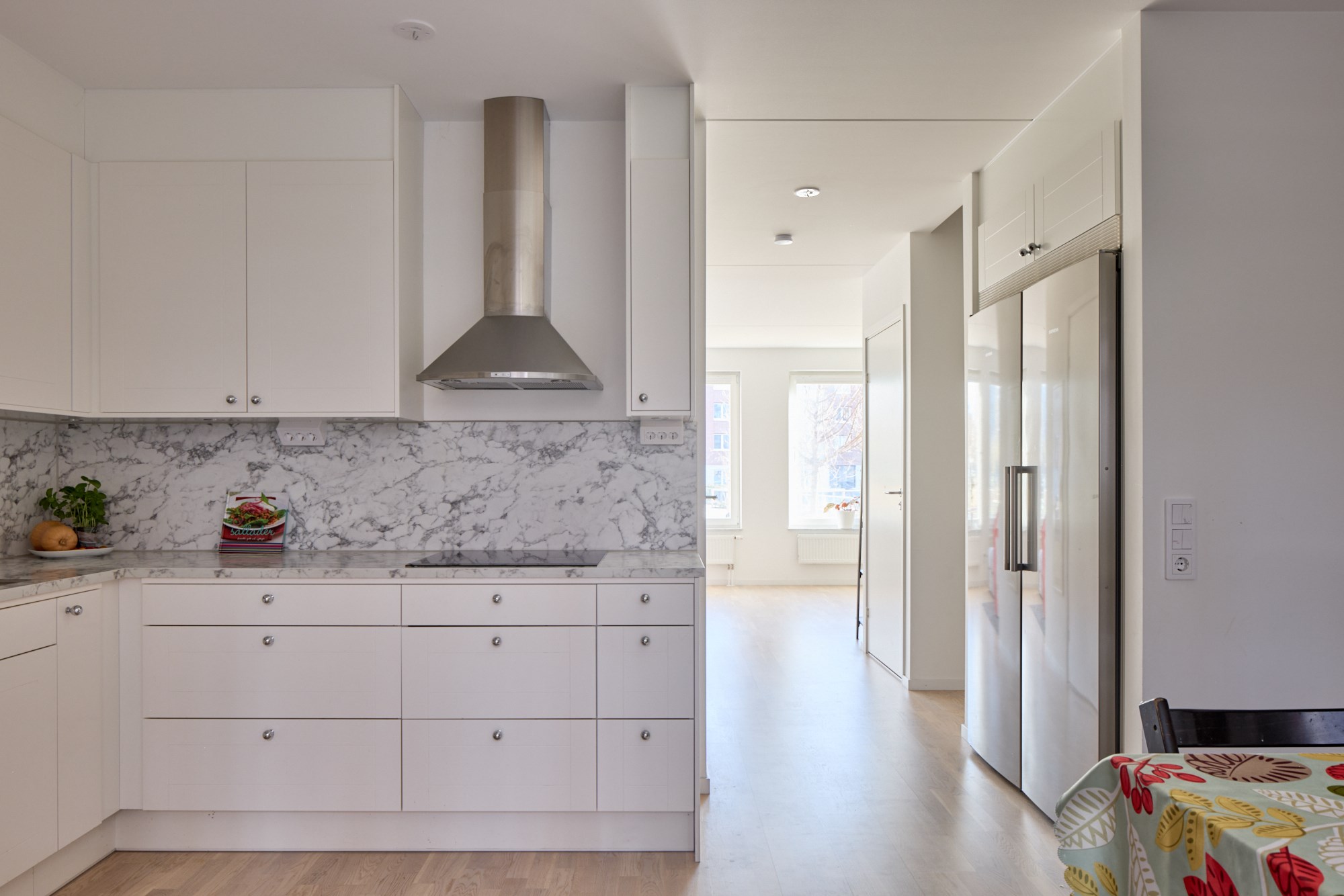 Parkettgolv och vita väggar. Vit köksinredning. Maskinell utrustning i form av induktionshäll och fläkt, ugn, mikrovågsugn, diskmaskin, hel kyl och hel frys. Direkt anslutning till matplats. Utgång till uteplats.