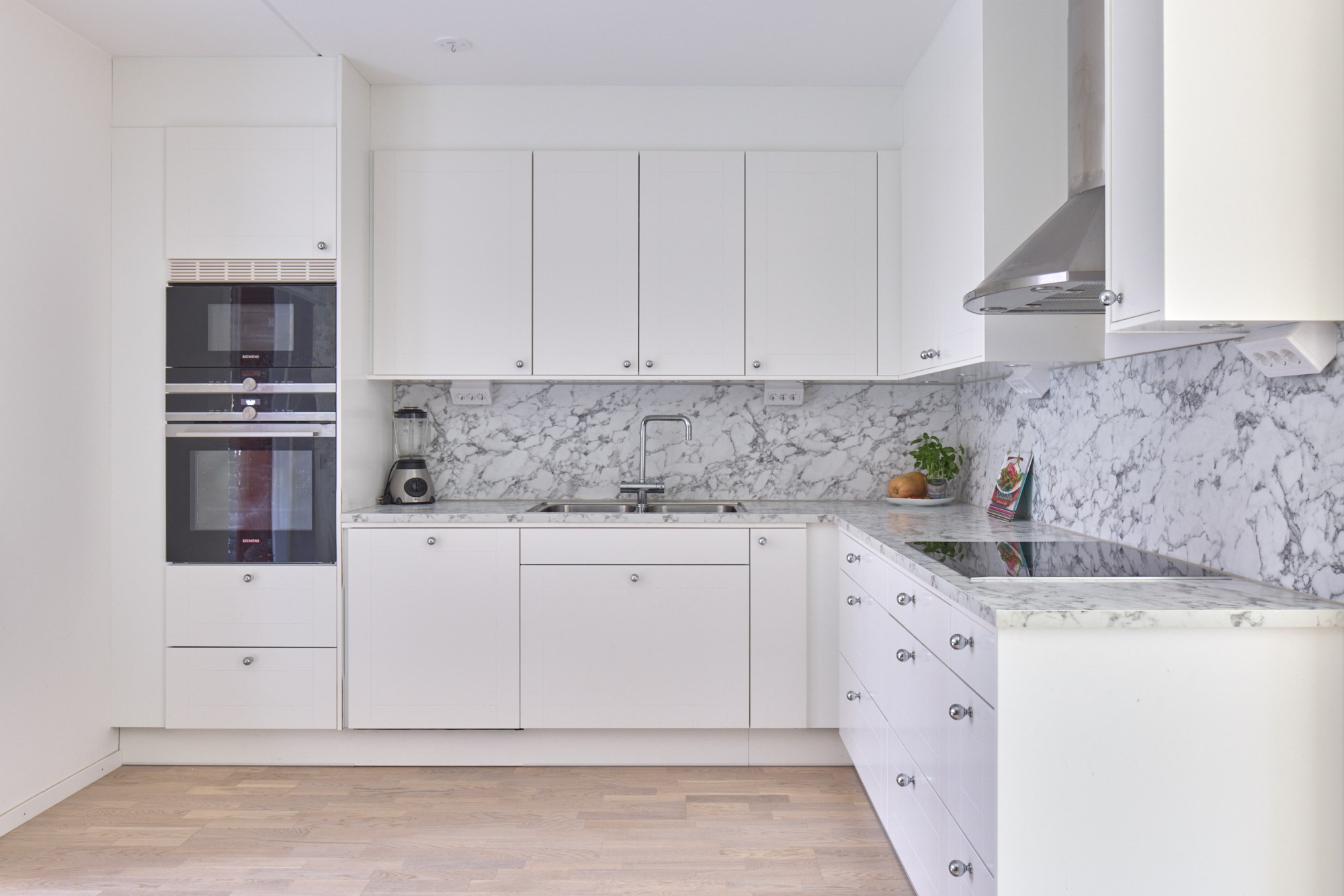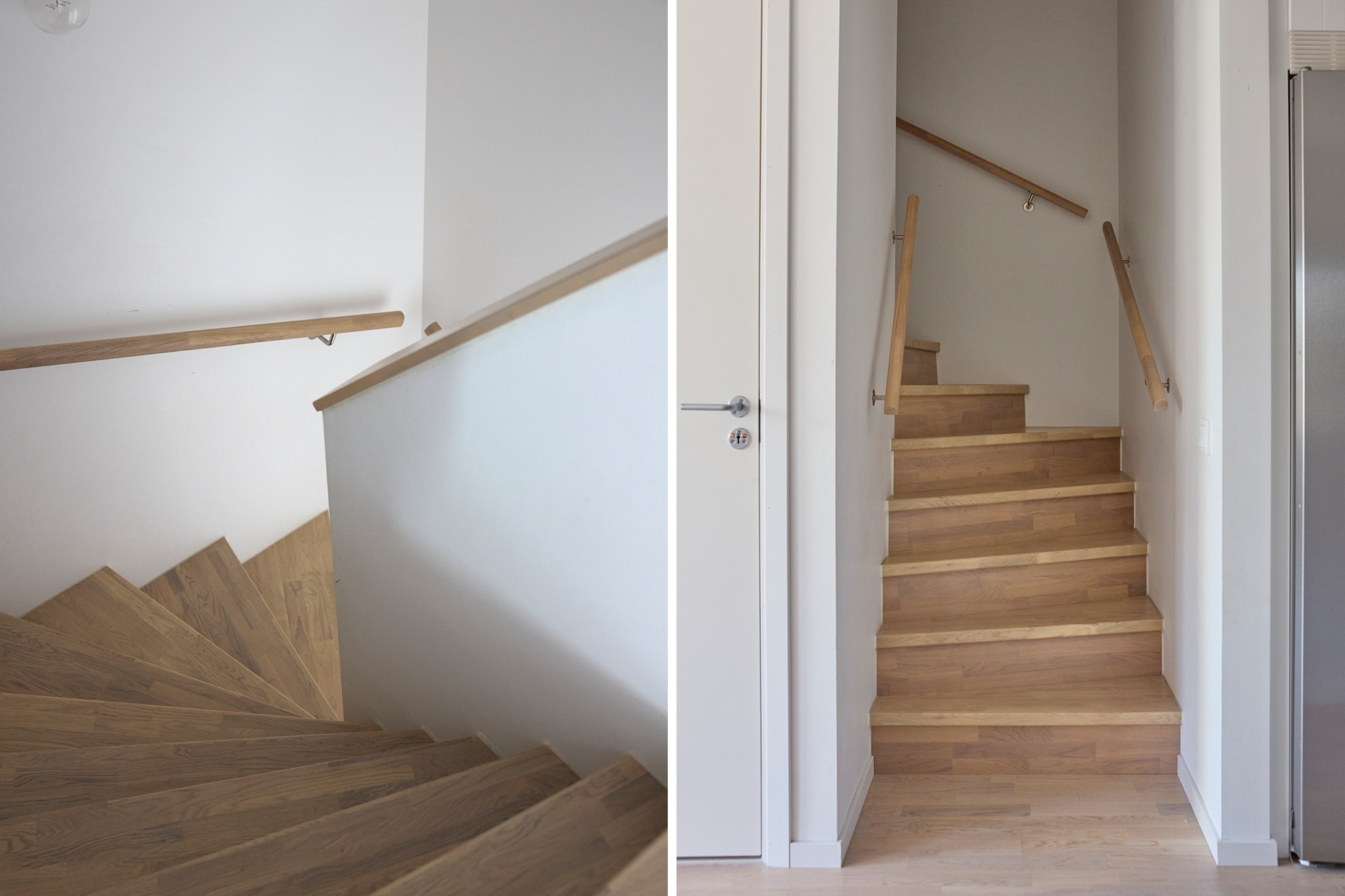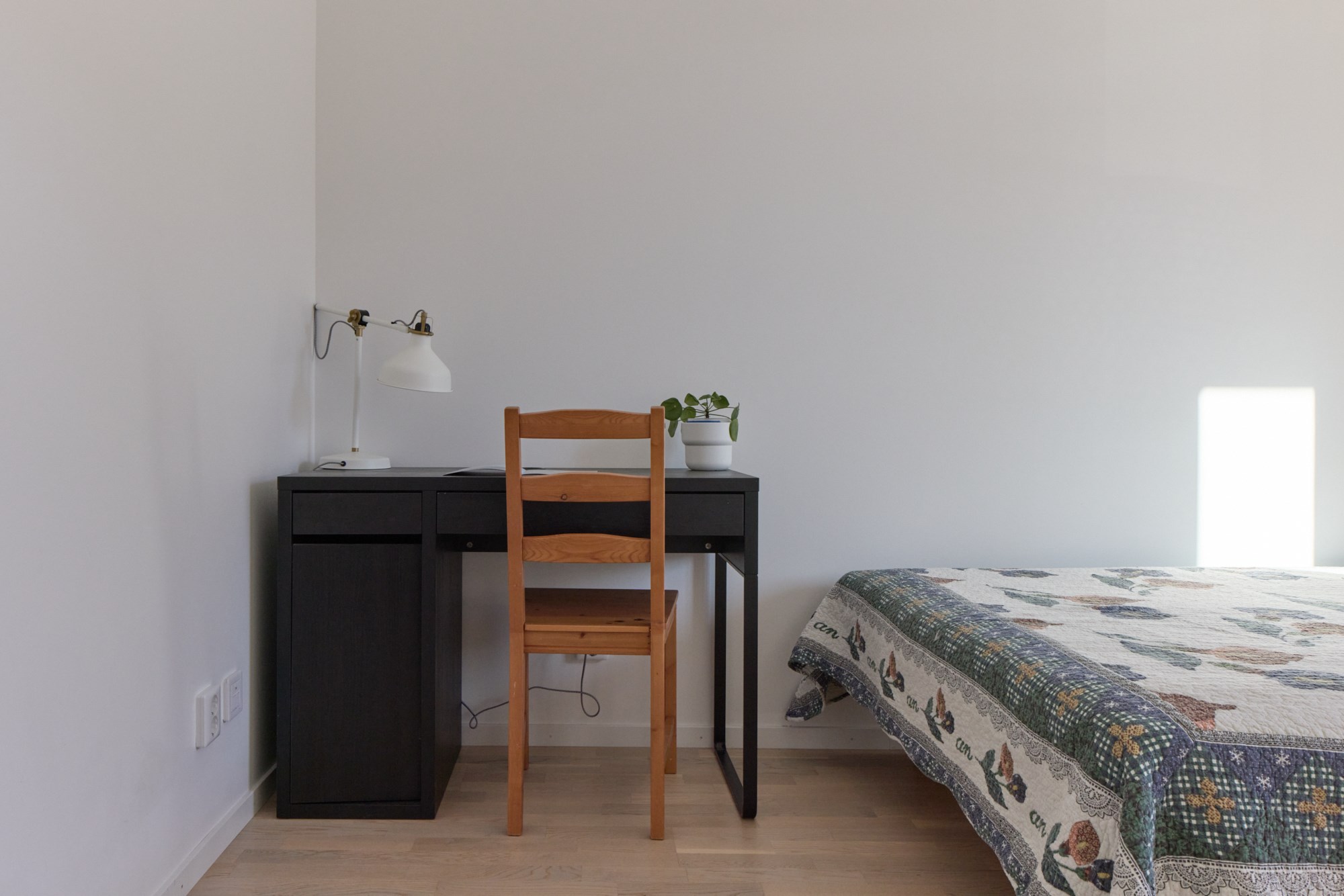 Parkettgolv och vita väggar.