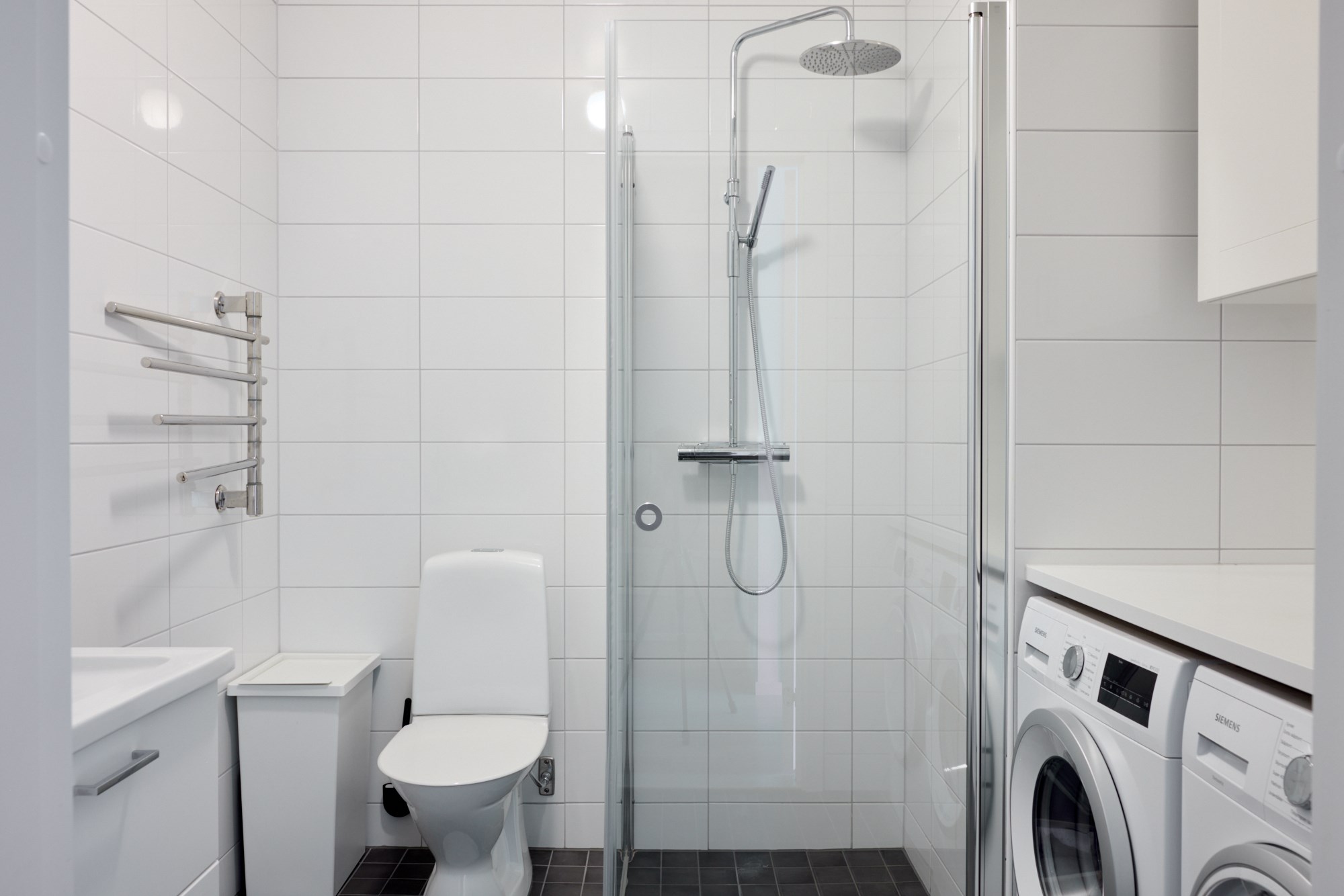 Helkaklat badrum. Grått klinker till golv och vita kaklade väggar. Utrustad med WC, handfat med vit kommod, spegel, dusch, handdukstork, tvättmaskin och torktumlare. Arbetsbänk och skåpsförvaring.